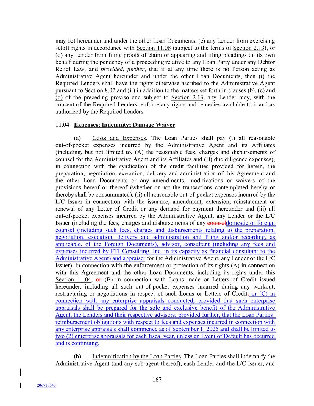 may be) hereunder and under the other Loan Documents, (c) any Lender from exercising setoff rights in accordance with Section 11.08 (subject to the terms of Section 2.13), or (d) any Lender from filing proofs of claim or appearing and filing pleadings on its own behalf during the pendency of a proceeding relative to any Loan Party under any Debtor Relief Law; and provided, further, that if at any time there is no Person acting as Administrative Agent hereunder and under the other Loan Documents, then (i) the Required Lenders shall have the rights otherwise ascribed to the Administrative Agent pursuant to Section 8.02 and (ii) in addition to the matters set forth in clauses (b), (c) and (d) of the preceding proviso and subject to Section 2.13, any Lender may, with the consent of the Required Lenders, enforce any rights and remedies available to it and as authorized by the Required Lenders. 11.04 Expenses; Indemnity; Damage Waiver. (a) Costs and Expenses. The Loan Parties shall pay (i) all reasonable out-of-pocket expenses incurred by the Administrative Agent and its Affiliates (including, but not limited to, (A) the reasonable fees, charges and disbursements of counsel for the Administrative Agent and its Affiliates and (B) due diligence expenses), in connection with the syndication of the credit facilities provided for herein, the preparation, negotiation, execution, delivery and administration of this Agreement and the other Loan Documents or any amendments, modifications or waivers of the provisions hereof or thereof (whether or not the transactions contemplated hereby or thereby shall be consummated), (ii) all reasonable out-of-pocket expenses incurred by the L/C Issuer in connection with the issuance, amendment, extension, reinstatement or renewal of any Letter of Credit or any demand for payment thereunder and (iii) all out-of-pocket expenses incurred by the Administrative Agent, any Lender or the L/C Issuer (including the fees, charges and disbursements of any counseldomestic or foreign counsel (including such fees, charges and disbursements relating to the preparation, negotiation, execution, delivery and administration and filing and/or recording, as applicable, of the Foreign Documents), advisor, consultant (including any fees and expenses incurred by FTI Consulting, Inc. in its capacity as financial consultant to the Administrative Agent) and appraiser for the Administrative Agent, any Lender or the L/C Issuer), in connection with the enforcement or protection of its rights (A) in connection with this Agreement and the other Loan Documents, including its rights under this Section 11.04, or (B) in connection with Loans made or Letters of Credit issued hereunder, including all such out-of-pocket expenses incurred during any workout, restructuring or negotiations in respect of such Loans or Letters of Credit. or (C) in connection with any enterprise appraisals conducted; provided that such enterprise appraisals shall be prepared for the sole and exclusive benefit of the Administrative Agent, the Lenders and their respective advisors; provided further, that the Loan Parties’ reimbursement obligations with respect to fees and expenses incurred in connection with any enterprise appraisals shall commence as of September 1, 2025 and shall be limited to two (2) enterprise appraisals for each fiscal year, unless an Event of Default has occurred and is continuing. (b) Indemnification by the Loan Parties. The Loan Parties shall indemnify the Administrative Agent (and any sub-agent thereof), each Lender and the L/C Issuer, and 167 206718545