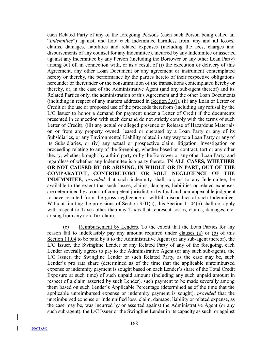 each Related Party of any of the foregoing Persons (each such Person being called an “Indemnitee”) against, and hold each Indemnitee harmless from, any and all losses, claims, damages, liabilities and related expenses (including the fees, charges and disbursements of any counsel for any Indemnitee), incurred by any Indemnitee or asserted against any Indemnitee by any Person (including the Borrower or any other Loan Party) arising out of, in connection with, or as a result of (i) the execution or delivery of this Agreement, any other Loan Document or any agreement or instrument contemplated hereby or thereby, the performance by the parties hereto of their respective obligations hereunder or thereunder or the consummation of the transactions contemplated hereby or thereby, or, in the case of the Administrative Agent (and any sub-agent thereof) and its Related Parties only, the administration of this Agreement and the other Loan Documents (including in respect of any matters addressed in Section 3.01), (ii) any Loan or Letter of Credit or the use or proposed use of the proceeds therefrom (including any refusal by the L/C Issuer to honor a demand for payment under a Letter of Credit if the documents presented in connection with such demand do not strictly comply with the terms of such Letter of Credit), (iii) any actual or alleged presence or Release of Hazardous Materials on or from any property owned, leased or operated by a Loan Party or any of its Subsidiaries, or any Environmental Liability related in any way to a Loan Party or any of its Subsidiaries, or (iv) any actual or prospective claim, litigation, investigation or proceeding relating to any of the foregoing, whether based on contract, tort or any other theory, whether brought by a third party or by the Borrower or any other Loan Party, and regardless of whether any Indemnitee is a party thereto, IN ALL CASES, WHETHER OR NOT CAUSED BY OR ARISING, IN WHOLE OR IN PART, OUT OF THE COMPARATIVE, CONTRIBUTORY OR SOLE NEGLIGENCE OF THE INDEMNITEE; provided that such indemnity shall not, as to any Indemnitee, be available to the extent that such losses, claims, damages, liabilities or related expenses are determined by a court of competent jurisdiction by final and non-appealable judgment to have resulted from the gross negligence or willful misconduct of such Indemnitee. Without limiting the provisions of Section 3.01(c), this Section 11.04(b) shall not apply with respect to Taxes other than any Taxes that represent losses, claims, damages, etc. arising from any non-Tax claim. (c) Reimbursement by Lenders. To the extent that the Loan Parties for any reason fail to indefeasibly pay any amount required under clauses (a) or (b) of this Section 11.04 to be paid by it to the Administrative Agent (or any sub-agent thereof), the L/C Issuer, the Swingline Lender or any Related Party of any of the foregoing, each Lender severally agrees to pay to the Administrative Agent (or any such sub-agent), the L/C Issuer, the Swingline Lender or such Related Party, as the case may be, such Lender’s pro rata share (determined as of the time that the applicable unreimbursed expense or indemnity payment is sought based on each Lender’s share of the Total Credit Exposure at such time) of such unpaid amount (including any such unpaid amount in respect of a claim asserted by such Lender), such payment to be made severally among them based on such Lender’s Applicable Percentage (determined as of the time that the applicable unreimbursed expense or indemnity payment is sought), provided that the unreimbursed expense or indemnified loss, claim, damage, liability or related expense, as the case may be, was incurred by or asserted against the Administrative Agent (or any such sub-agent), the L/C Issuer or the Swingline Lender in its capacity as such, or against 168 206718545