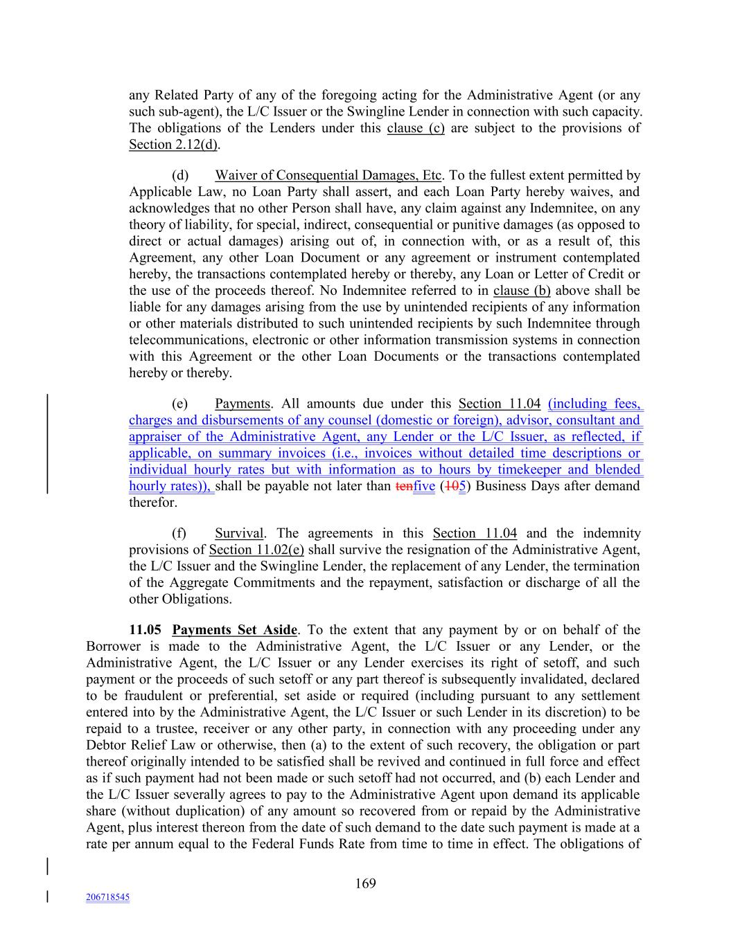 any Related Party of any of the foregoing acting for the Administrative Agent (or any such sub-agent), the L/C Issuer or the Swingline Lender in connection with such capacity. The obligations of the Lenders under this clause (c) are subject to the provisions of Section 2.12(d). (d) Waiver of Consequential Damages, Etc. To the fullest extent permitted by Applicable Law, no Loan Party shall assert, and each Loan Party hereby waives, and acknowledges that no other Person shall have, any claim against any Indemnitee, on any theory of liability, for special, indirect, consequential or punitive damages (as opposed to direct or actual damages) arising out of, in connection with, or as a result of, this Agreement, any other Loan Document or any agreement or instrument contemplated hereby, the transactions contemplated hereby or thereby, any Loan or Letter of Credit or the use of the proceeds thereof. No Indemnitee referred to in clause (b) above shall be liable for any damages arising from the use by unintended recipients of any information or other materials distributed to such unintended recipients by such Indemnitee through telecommunications, electronic or other information transmission systems in connection with this Agreement or the other Loan Documents or the transactions contemplated hereby or thereby. (e) Payments. All amounts due under this Section 11.04 (including fees, charges and disbursements of any counsel (domestic or foreign), advisor, consultant and appraiser of the Administrative Agent, any Lender or the L/C Issuer, as reflected, if applicable, on summary invoices (i.e., invoices without detailed time descriptions or individual hourly rates but with information as to hours by timekeeper and blended hourly rates)), shall be payable not later than tenfive (105) Business Days after demand therefor. (f) Survival. The agreements in this Section 11.04 and the indemnity provisions of Section 11.02(e) shall survive the resignation of the Administrative Agent, the L/C Issuer and the Swingline Lender, the replacement of any Lender, the termination of the Aggregate Commitments and the repayment, satisfaction or discharge of all the other Obligations. 11.05 Payments Set Aside. To the extent that any payment by or on behalf of the Borrower is made to the Administrative Agent, the L/C Issuer or any Lender, or the Administrative Agent, the L/C Issuer or any Lender exercises its right of setoff, and such payment or the proceeds of such setoff or any part thereof is subsequently invalidated, declared to be fraudulent or preferential, set aside or required (including pursuant to any settlement entered into by the Administrative Agent, the L/C Issuer or such Lender in its discretion) to be repaid to a trustee, receiver or any other party, in connection with any proceeding under any Debtor Relief Law or otherwise, then (a) to the extent of such recovery, the obligation or part thereof originally intended to be satisfied shall be revived and continued in full force and effect as if such payment had not been made or such setoff had not occurred, and (b) each Lender and the L/C Issuer severally agrees to pay to the Administrative Agent upon demand its applicable share (without duplication) of any amount so recovered from or repaid by the Administrative Agent, plus interest thereon from the date of such demand to the date such payment is made at a rate per annum equal to the Federal Funds Rate from time to time in effect. The obligations of 169 206718545