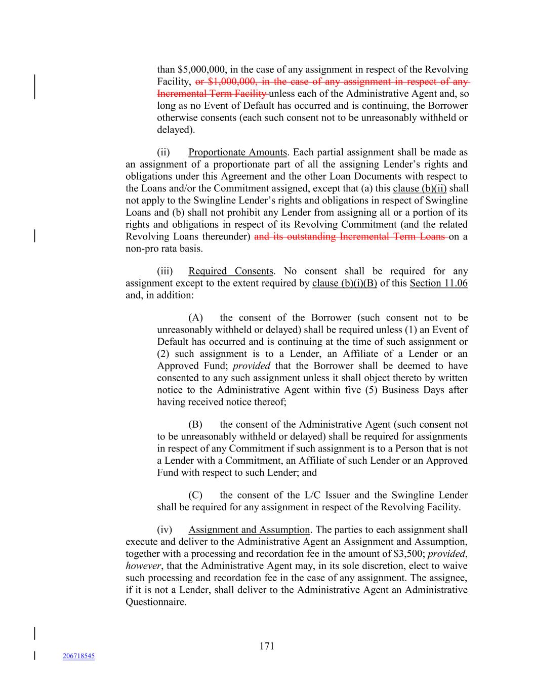 than $5,000,000, in the case of any assignment in respect of the Revolving Facility, or $1,000,000, in the case of any assignment in respect of any Incremental Term Facility unless each of the Administrative Agent and, so long as no Event of Default has occurred and is continuing, the Borrower otherwise consents (each such consent not to be unreasonably withheld or delayed). (ii) Proportionate Amounts. Each partial assignment shall be made as an assignment of a proportionate part of all the assigning Lender’s rights and obligations under this Agreement and the other Loan Documents with respect to the Loans and/or the Commitment assigned, except that (a) this clause (b)(ii) shall not apply to the Swingline Lender’s rights and obligations in respect of Swingline Loans and (b) shall not prohibit any Lender from assigning all or a portion of its rights and obligations in respect of its Revolving Commitment (and the related Revolving Loans thereunder) and its outstanding Incremental Term Loans on a non-pro rata basis. (iii) Required Consents. No consent shall be required for any assignment except to the extent required by clause (b)(i)(B) of this Section 11.06 and, in addition: (A) the consent of the Borrower (such consent not to be unreasonably withheld or delayed) shall be required unless (1) an Event of Default has occurred and is continuing at the time of such assignment or (2) such assignment is to a Lender, an Affiliate of a Lender or an Approved Fund; provided that the Borrower shall be deemed to have consented to any such assignment unless it shall object thereto by written notice to the Administrative Agent within five (5) Business Days after having received notice thereof; (B) the consent of the Administrative Agent (such consent not to be unreasonably withheld or delayed) shall be required for assignments in respect of any Commitment if such assignment is to a Person that is not a Lender with a Commitment, an Affiliate of such Lender or an Approved Fund with respect to such Lender; and (C) the consent of the L/C Issuer and the Swingline Lender shall be required for any assignment in respect of the Revolving Facility. (iv) Assignment and Assumption. The parties to each assignment shall execute and deliver to the Administrative Agent an Assignment and Assumption, together with a processing and recordation fee in the amount of $3,500; provided, however, that the Administrative Agent may, in its sole discretion, elect to waive such processing and recordation fee in the case of any assignment. The assignee, if it is not a Lender, shall deliver to the Administrative Agent an Administrative Questionnaire. 171 206718545