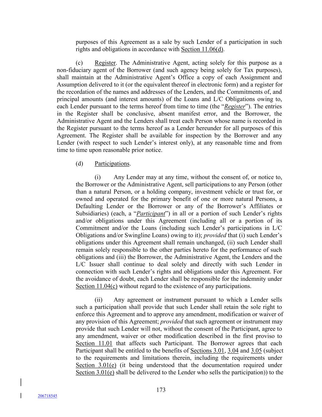 purposes of this Agreement as a sale by such Lender of a participation in such rights and obligations in accordance with Section 11.06(d). (c) Register. The Administrative Agent, acting solely for this purpose as a non-fiduciary agent of the Borrower (and such agency being solely for Tax purposes), shall maintain at the Administrative Agent’s Office a copy of each Assignment and Assumption delivered to it (or the equivalent thereof in electronic form) and a register for the recordation of the names and addresses of the Lenders, and the Commitments of, and principal amounts (and interest amounts) of the Loans and L/C Obligations owing to, each Lender pursuant to the terms hereof from time to time (the “Register”). The entries in the Register shall be conclusive, absent manifest error, and the Borrower, the Administrative Agent and the Lenders shall treat each Person whose name is recorded in the Register pursuant to the terms hereof as a Lender hereunder for all purposes of this Agreement. The Register shall be available for inspection by the Borrower and any Lender (with respect to such Lender’s interest only), at any reasonable time and from time to time upon reasonable prior notice. (d) Participations. (i) Any Lender may at any time, without the consent of, or notice to, the Borrower or the Administrative Agent, sell participations to any Person (other than a natural Person, or a holding company, investment vehicle or trust for, or owned and operated for the primary benefit of one or more natural Persons, a Defaulting Lender or the Borrower or any of the Borrower’s Affiliates or Subsidiaries) (each, a “Participant”) in all or a portion of such Lender’s rights and/or obligations under this Agreement (including all or a portion of its Commitment and/or the Loans (including such Lender’s participations in L/C Obligations and/or Swingline Loans) owing to it); provided that (i) such Lender’s obligations under this Agreement shall remain unchanged, (ii) such Lender shall remain solely responsible to the other parties hereto for the performance of such obligations and (iii) the Borrower, the Administrative Agent, the Lenders and the L/C Issuer shall continue to deal solely and directly with such Lender in connection with such Lender’s rights and obligations under this Agreement. For the avoidance of doubt, each Lender shall be responsible for the indemnity under Section 11.04(c) without regard to the existence of any participations. (ii) Any agreement or instrument pursuant to which a Lender sells such a participation shall provide that such Lender shall retain the sole right to enforce this Agreement and to approve any amendment, modification or waiver of any provision of this Agreement; provided that such agreement or instrument may provide that such Lender will not, without the consent of the Participant, agree to any amendment, waiver or other modification described in the first proviso to Section 11.01 that affects such Participant. The Borrower agrees that each Participant shall be entitled to the benefits of Sections 3.01, 3.04 and 3.05 (subject to the requirements and limitations therein, including the requirements under Section 3.01(e) (it being understood that the documentation required under Section 3.01(e) shall be delivered to the Lender who sells the participation)) to the 173 206718545