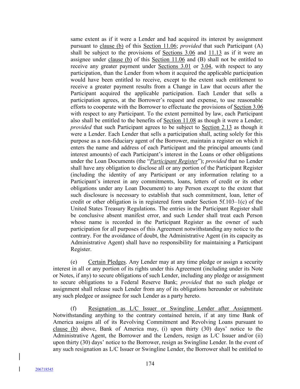 same extent as if it were a Lender and had acquired its interest by assignment pursuant to clause (b) of this Section 11.06; provided that such Participant (A) shall be subject to the provisions of Sections 3.06 and 11.13 as if it were an assignee under clause (b) of this Section 11.06 and (B) shall not be entitled to receive any greater payment under Sections 3.01 or 3.04, with respect to any participation, than the Lender from whom it acquired the applicable participation would have been entitled to receive, except to the extent such entitlement to receive a greater payment results from a Change in Law that occurs after the Participant acquired the applicable participation. Each Lender that sells a participation agrees, at the Borrower’s request and expense, to use reasonable efforts to cooperate with the Borrower to effectuate the provisions of Section 3.06 with respect to any Participant. To the extent permitted by law, each Participant also shall be entitled to the benefits of Section 11.08 as though it were a Lender; provided that such Participant agrees to be subject to Section 2.13 as though it were a Lender. Each Lender that sells a participation shall, acting solely for this purpose as a non-fiduciary agent of the Borrower, maintain a register on which it enters the name and address of each Participant and the principal amounts (and interest amounts) of each Participant’s interest in the Loans or other obligations under the Loan Documents (the “Participant Register”); provided that no Lender shall have any obligation to disclose all or any portion of the Participant Register (including the identity of any Participant or any information relating to a Participant’s interest in any commitments, loans, letters of credit or its other obligations under any Loan Document) to any Person except to the extent that such disclosure is necessary to establish that such commitment, loan, letter of credit or other obligation is in registered form under Section 5f.103–1(c) of the United States Treasury Regulations. The entries in the Participant Register shall be conclusive absent manifest error, and such Lender shall treat each Person whose name is recorded in the Participant Register as the owner of such participation for all purposes of this Agreement notwithstanding any notice to the contrary. For the avoidance of doubt, the Administrative Agent (in its capacity as Administrative Agent) shall have no responsibility for maintaining a Participant Register. (e) Certain Pledges. Any Lender may at any time pledge or assign a security interest in all or any portion of its rights under this Agreement (including under its Note or Notes, if any) to secure obligations of such Lender, including any pledge or assignment to secure obligations to a Federal Reserve Bank; provided that no such pledge or assignment shall release such Lender from any of its obligations hereunder or substitute any such pledgee or assignee for such Lender as a party hereto. (f) Resignation as L/C Issuer or Swingline Lender after Assignment. Notwithstanding anything to the contrary contained herein, if at any time Bank of America assigns all of its Revolving Commitment and Revolving Loans pursuant to clause (b) above, Bank of America may, (i) upon thirty (30) days’ notice to the Administrative Agent, the Borrower and the Lenders, resign as L/C Issuer and/or (ii) upon thirty (30) days’ notice to the Borrower, resign as Swingline Lender. In the event of any such resignation as L/C Issuer or Swingline Lender, the Borrower shall be entitled to 174 206718545