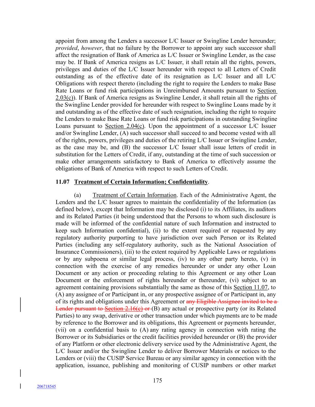 appoint from among the Lenders a successor L/C Issuer or Swingline Lender hereunder; provided, however, that no failure by the Borrower to appoint any such successor shall affect the resignation of Bank of America as L/C Issuer or Swingline Lender, as the case may be. If Bank of America resigns as L/C Issuer, it shall retain all the rights, powers, privileges and duties of the L/C Issuer hereunder with respect to all Letters of Credit outstanding as of the effective date of its resignation as L/C Issuer and all L/C Obligations with respect thereto (including the right to require the Lenders to make Base Rate Loans or fund risk participations in Unreimbursed Amounts pursuant to Section 2.03(c)). If Bank of America resigns as Swingline Lender, it shall retain all the rights of the Swingline Lender provided for hereunder with respect to Swingline Loans made by it and outstanding as of the effective date of such resignation, including the right to require the Lenders to make Base Rate Loans or fund risk participations in outstanding Swingline Loans pursuant to Section 2.04(c). Upon the appointment of a successor L/C Issuer and/or Swingline Lender, (A) such successor shall succeed to and become vested with all of the rights, powers, privileges and duties of the retiring L/C Issuer or Swingline Lender, as the case may be, and (B) the successor L/C Issuer shall issue letters of credit in substitution for the Letters of Credit, if any, outstanding at the time of such succession or make other arrangements satisfactory to Bank of America to effectively assume the obligations of Bank of America with respect to such Letters of Credit. 11.07 Treatment of Certain Information; Confidentiality. (a) Treatment of Certain Information. Each of the Administrative Agent, the Lenders and the L/C Issuer agrees to maintain the confidentiality of the Information (as defined below), except that Information may be disclosed (i) to its Affiliates, its auditors and its Related Parties (it being understood that the Persons to whom such disclosure is made will be informed of the confidential nature of such Information and instructed to keep such Information confidential), (ii) to the extent required or requested by any regulatory authority purporting to have jurisdiction over such Person or its Related Parties (including any self-regulatory authority, such as the National Association of Insurance Commissioners), (iii) to the extent required by Applicable Laws or regulations or by any subpoena or similar legal process, (iv) to any other party hereto, (v) in connection with the exercise of any remedies hereunder or under any other Loan Document or any action or proceeding relating to this Agreement or any other Loan Document or the enforcement of rights hereunder or thereunder, (vi) subject to an agreement containing provisions substantially the same as those of this Section 11.07, to (A) any assignee of or Participant in, or any prospective assignee of or Participant in, any of its rights and obligations under this Agreement or any Eligible Assignee invited to be a Lender pursuant to Section 2.16(c) or (B) any actual or prospective party (or its Related Parties) to any swap, derivative or other transaction under which payments are to be made by reference to the Borrower and its obligations, this Agreement or payments hereunder, (vii) on a confidential basis to (A) any rating agency in connection with rating the Borrower or its Subsidiaries or the credit facilities provided hereunder or (B) the provider of any Platform or other electronic delivery service used by the Administrative Agent, the L/C Issuer and/or the Swingline Lender to deliver Borrower Materials or notices to the Lenders or (viii) the CUSIP Service Bureau or any similar agency in connection with the application, issuance, publishing and monitoring of CUSIP numbers or other market 175 206718545