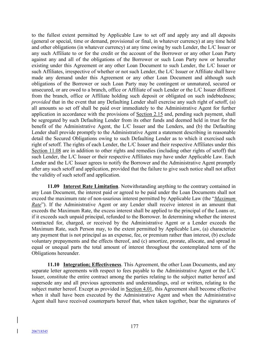 to the fullest extent permitted by Applicable Law to set off and apply any and all deposits (general or special, time or demand, provisional or final, in whatever currency) at any time held and other obligations (in whatever currency) at any time owing by such Lender, the L/C Issuer or any such Affiliate to or for the credit or the account of the Borrower or any other Loan Party against any and all of the obligations of the Borrower or such Loan Party now or hereafter existing under this Agreement or any other Loan Document to such Lender, the L/C Issuer or such Affiliates, irrespective of whether or not such Lender, the L/C Issuer or Affiliate shall have made any demand under this Agreement or any other Loan Document and although such obligations of the Borrower or such Loan Party may be contingent or unmatured, secured or unsecured, or are owed to a branch, office or Affiliate of such Lender or the L/C Issuer different from the branch, office or Affiliate holding such deposit or obligated on such indebtedness; provided that in the event that any Defaulting Lender shall exercise any such right of setoff, (a) all amounts so set off shall be paid over immediately to the Administrative Agent for further application in accordance with the provisions of Section 2.15 and, pending such payment, shall be segregated by such Defaulting Lender from its other funds and deemed held in trust for the benefit of the Administrative Agent, the L/C Issuer and the Lenders, and (b) the Defaulting Lender shall provide promptly to the Administrative Agent a statement describing in reasonable detail the Secured Obligations owing to such Defaulting Lender as to which it exercised such right of setoff. The rights of each Lender, the L/C Issuer and their respective Affiliates under this Section 11.08 are in addition to other rights and remedies (including other rights of setoff) that such Lender, the L/C Issuer or their respective Affiliates may have under Applicable Law. Each Lender and the L/C Issuer agrees to notify the Borrower and the Administrative Agent promptly after any such setoff and application, provided that the failure to give such notice shall not affect the validity of such setoff and application. 11.09 Interest Rate Limitation. Notwithstanding anything to the contrary contained in any Loan Document, the interest paid or agreed to be paid under the Loan Documents shall not exceed the maximum rate of non-usurious interest permitted by Applicable Law (the “Maximum Rate”). If the Administrative Agent or any Lender shall receive interest in an amount that exceeds the Maximum Rate, the excess interest shall be applied to the principal of the Loans or, if it exceeds such unpaid principal, refunded to the Borrower. In determining whether the interest contracted for, charged, or received by the Administrative Agent or a Lender exceeds the Maximum Rate, such Person may, to the extent permitted by Applicable Law, (a) characterize any payment that is not principal as an expense, fee, or premium rather than interest, (b) exclude voluntary prepayments and the effects thereof, and (c) amortize, prorate, allocate, and spread in equal or unequal parts the total amount of interest throughout the contemplated term of the Obligations hereunder. 11.10 Integration; Effectiveness. This Agreement, the other Loan Documents, and any separate letter agreements with respect to fees payable to the Administrative Agent or the L/C Issuer, constitute the entire contract among the parties relating to the subject matter hereof and supersede any and all previous agreements and understandings, oral or written, relating to the subject matter hereof. Except as provided in Section 4.01, this Agreement shall become effective when it shall have been executed by the Administrative Agent and when the Administrative Agent shall have received counterparts hereof that, when taken together, bear the signatures of 177 206718545