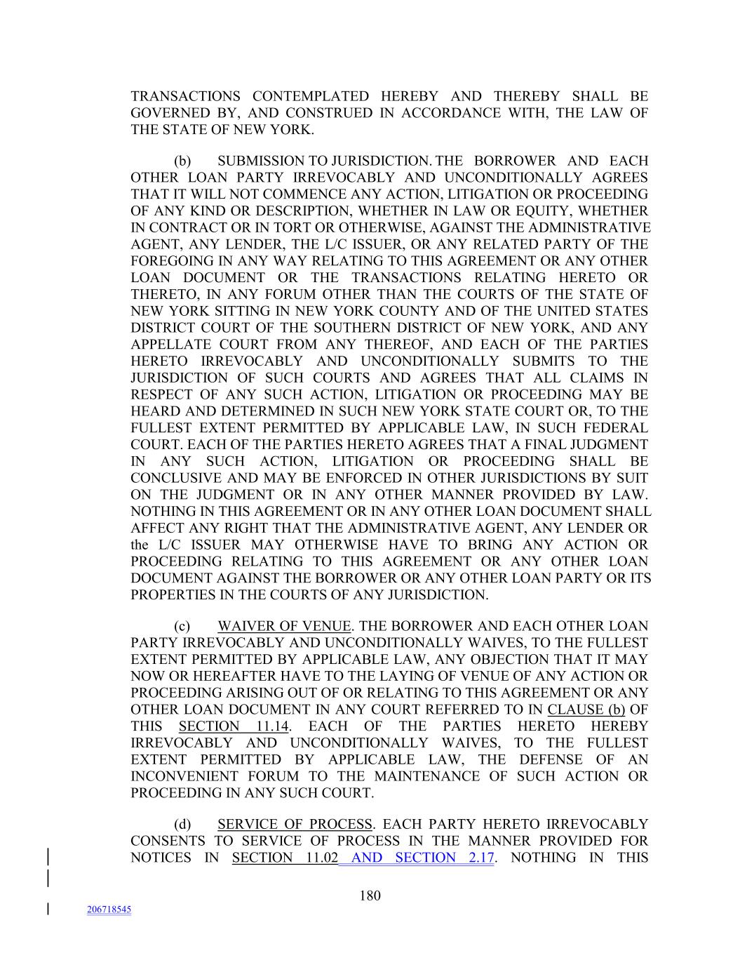 TRANSACTIONS CONTEMPLATED HEREBY AND THEREBY SHALL BE GOVERNED BY, AND CONSTRUED IN ACCORDANCE WITH, THE LAW OF THE STATE OF NEW YORK. (b) SUBMISSION TO JURISDICTION. THE BORROWER AND EACH OTHER LOAN PARTY IRREVOCABLY AND UNCONDITIONALLY AGREES THAT IT WILL NOT COMMENCE ANY ACTION, LITIGATION OR PROCEEDING OF ANY KIND OR DESCRIPTION, WHETHER IN LAW OR EQUITY, WHETHER IN CONTRACT OR IN TORT OR OTHERWISE, AGAINST THE ADMINISTRATIVE AGENT, ANY LENDER, THE L/C ISSUER, OR ANY RELATED PARTY OF THE FOREGOING IN ANY WAY RELATING TO THIS AGREEMENT OR ANY OTHER LOAN DOCUMENT OR THE TRANSACTIONS RELATING HERETO OR THERETO, IN ANY FORUM OTHER THAN THE COURTS OF THE STATE OF NEW YORK SITTING IN NEW YORK COUNTY AND OF THE UNITED STATES DISTRICT COURT OF THE SOUTHERN DISTRICT OF NEW YORK, AND ANY APPELLATE COURT FROM ANY THEREOF, AND EACH OF THE PARTIES HERETO IRREVOCABLY AND UNCONDITIONALLY SUBMITS TO THE JURISDICTION OF SUCH COURTS AND AGREES THAT ALL CLAIMS IN RESPECT OF ANY SUCH ACTION, LITIGATION OR PROCEEDING MAY BE HEARD AND DETERMINED IN SUCH NEW YORK STATE COURT OR, TO THE FULLEST EXTENT PERMITTED BY APPLICABLE LAW, IN SUCH FEDERAL COURT. EACH OF THE PARTIES HERETO AGREES THAT A FINAL JUDGMENT IN ANY SUCH ACTION, LITIGATION OR PROCEEDING SHALL BE CONCLUSIVE AND MAY BE ENFORCED IN OTHER JURISDICTIONS BY SUIT ON THE JUDGMENT OR IN ANY OTHER MANNER PROVIDED BY LAW. NOTHING IN THIS AGREEMENT OR IN ANY OTHER LOAN DOCUMENT SHALL AFFECT ANY RIGHT THAT THE ADMINISTRATIVE AGENT, ANY LENDER OR the L/C ISSUER MAY OTHERWISE HAVE TO BRING ANY ACTION OR PROCEEDING RELATING TO THIS AGREEMENT OR ANY OTHER LOAN DOCUMENT AGAINST THE BORROWER OR ANY OTHER LOAN PARTY OR ITS PROPERTIES IN THE COURTS OF ANY JURISDICTION. (c) WAIVER OF VENUE. THE BORROWER AND EACH OTHER LOAN PARTY IRREVOCABLY AND UNCONDITIONALLY WAIVES, TO THE FULLEST EXTENT PERMITTED BY APPLICABLE LAW, ANY OBJECTION THAT IT MAY NOW OR HEREAFTER HAVE TO THE LAYING OF VENUE OF ANY ACTION OR PROCEEDING ARISING OUT OF OR RELATING TO THIS AGREEMENT OR ANY OTHER LOAN DOCUMENT IN ANY COURT REFERRED TO IN CLAUSE (b) OF THIS SECTION 11.14. EACH OF THE PARTIES HERETO HEREBY IRREVOCABLY AND UNCONDITIONALLY WAIVES, TO THE FULLEST EXTENT PERMITTED BY APPLICABLE LAW, THE DEFENSE OF AN INCONVENIENT FORUM TO THE MAINTENANCE OF SUCH ACTION OR PROCEEDING IN ANY SUCH COURT. (d) SERVICE OF PROCESS. EACH PARTY HERETO IRREVOCABLY CONSENTS TO SERVICE OF PROCESS IN THE MANNER PROVIDED FOR NOTICES IN SECTION 11.02 AND SECTION 2.17. NOTHING IN THIS 180 206718545