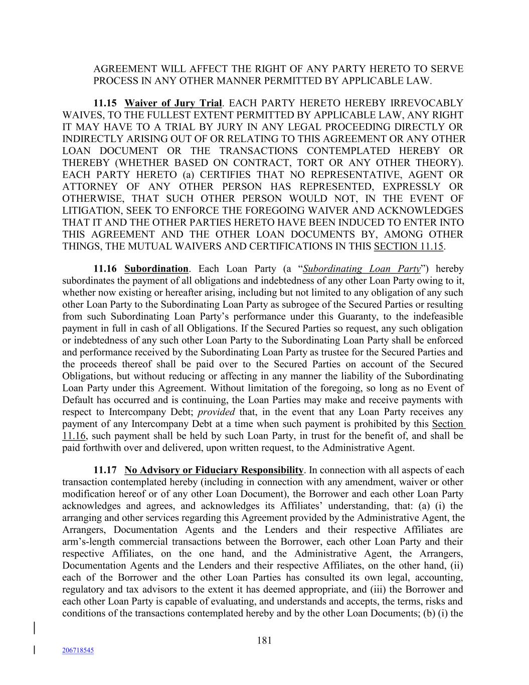 AGREEMENT WILL AFFECT THE RIGHT OF ANY PARTY HERETO TO SERVE PROCESS IN ANY OTHER MANNER PERMITTED BY APPLICABLE LAW. 11.15 Waiver of Jury Trial. EACH PARTY HERETO HEREBY IRREVOCABLY WAIVES, TO THE FULLEST EXTENT PERMITTED BY APPLICABLE LAW, ANY RIGHT IT MAY HAVE TO A TRIAL BY JURY IN ANY LEGAL PROCEEDING DIRECTLY OR INDIRECTLY ARISING OUT OF OR RELATING TO THIS AGREEMENT OR ANY OTHER LOAN DOCUMENT OR THE TRANSACTIONS CONTEMPLATED HEREBY OR THEREBY (WHETHER BASED ON CONTRACT, TORT OR ANY OTHER THEORY). EACH PARTY HERETO (a) CERTIFIES THAT NO REPRESENTATIVE, AGENT OR ATTORNEY OF ANY OTHER PERSON HAS REPRESENTED, EXPRESSLY OR OTHERWISE, THAT SUCH OTHER PERSON WOULD NOT, IN THE EVENT OF LITIGATION, SEEK TO ENFORCE THE FOREGOING WAIVER AND ACKNOWLEDGES THAT IT AND THE OTHER PARTIES HERETO HAVE BEEN INDUCED TO ENTER INTO THIS AGREEMENT AND THE OTHER LOAN DOCUMENTS BY, AMONG OTHER THINGS, THE MUTUAL WAIVERS AND CERTIFICATIONS IN THIS SECTION 11.15. 11.16 Subordination. Each Loan Party (a “Subordinating Loan Party”) hereby subordinates the payment of all obligations and indebtedness of any other Loan Party owing to it, whether now existing or hereafter arising, including but not limited to any obligation of any such other Loan Party to the Subordinating Loan Party as subrogee of the Secured Parties or resulting from such Subordinating Loan Party’s performance under this Guaranty, to the indefeasible payment in full in cash of all Obligations. If the Secured Parties so request, any such obligation or indebtedness of any such other Loan Party to the Subordinating Loan Party shall be enforced and performance received by the Subordinating Loan Party as trustee for the Secured Parties and the proceeds thereof shall be paid over to the Secured Parties on account of the Secured Obligations, but without reducing or affecting in any manner the liability of the Subordinating Loan Party under this Agreement. Without limitation of the foregoing, so long as no Event of Default has occurred and is continuing, the Loan Parties may make and receive payments with respect to Intercompany Debt; provided that, in the event that any Loan Party receives any payment of any Intercompany Debt at a time when such payment is prohibited by this Section 11.16, such payment shall be held by such Loan Party, in trust for the benefit of, and shall be paid forthwith over and delivered, upon written request, to the Administrative Agent. 11.17 No Advisory or Fiduciary Responsibility. In connection with all aspects of each transaction contemplated hereby (including in connection with any amendment, waiver or other modification hereof or of any other Loan Document), the Borrower and each other Loan Party acknowledges and agrees, and acknowledges its Affiliates’ understanding, that: (a) (i) the arranging and other services regarding this Agreement provided by the Administrative Agent, the Arrangers, Documentation Agents and the Lenders and their respective Affiliates are arm’s-length commercial transactions between the Borrower, each other Loan Party and their respective Affiliates, on the one hand, and the Administrative Agent, the Arrangers, Documentation Agents and the Lenders and their respective Affiliates, on the other hand, (ii) each of the Borrower and the other Loan Parties has consulted its own legal, accounting, regulatory and tax advisors to the extent it has deemed appropriate, and (iii) the Borrower and each other Loan Party is capable of evaluating, and understands and accepts, the terms, risks and conditions of the transactions contemplated hereby and by the other Loan Documents; (b) (i) the 181 206718545