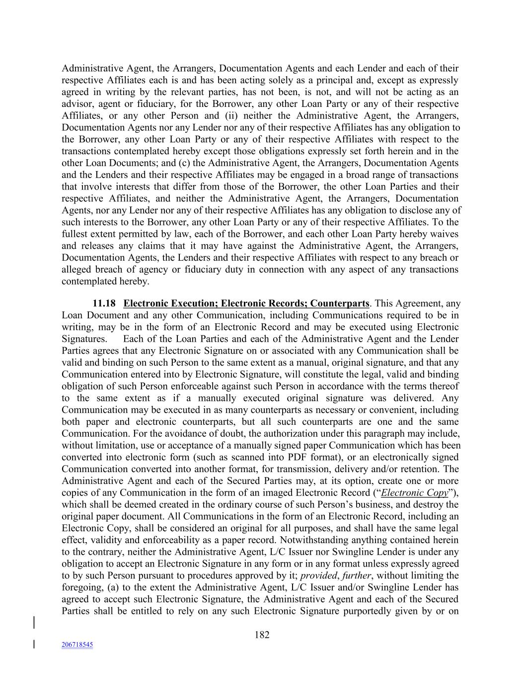Administrative Agent, the Arrangers, Documentation Agents and each Lender and each of their respective Affiliates each is and has been acting solely as a principal and, except as expressly agreed in writing by the relevant parties, has not been, is not, and will not be acting as an advisor, agent or fiduciary, for the Borrower, any other Loan Party or any of their respective Affiliates, or any other Person and (ii) neither the Administrative Agent, the Arrangers, Documentation Agents nor any Lender nor any of their respective Affiliates has any obligation to the Borrower, any other Loan Party or any of their respective Affiliates with respect to the transactions contemplated hereby except those obligations expressly set forth herein and in the other Loan Documents; and (c) the Administrative Agent, the Arrangers, Documentation Agents and the Lenders and their respective Affiliates may be engaged in a broad range of transactions that involve interests that differ from those of the Borrower, the other Loan Parties and their respective Affiliates, and neither the Administrative Agent, the Arrangers, Documentation Agents, nor any Lender nor any of their respective Affiliates has any obligation to disclose any of such interests to the Borrower, any other Loan Party or any of their respective Affiliates. To the fullest extent permitted by law, each of the Borrower, and each other Loan Party hereby waives and releases any claims that it may have against the Administrative Agent, the Arrangers, Documentation Agents, the Lenders and their respective Affiliates with respect to any breach or alleged breach of agency or fiduciary duty in connection with any aspect of any transactions contemplated hereby. 11.18 Electronic Execution; Electronic Records; Counterparts. This Agreement, any Loan Document and any other Communication, including Communications required to be in writing, may be in the form of an Electronic Record and may be executed using Electronic Signatures. Each of the Loan Parties and each of the Administrative Agent and the Lender Parties agrees that any Electronic Signature on or associated with any Communication shall be valid and binding on such Person to the same extent as a manual, original signature, and that any Communication entered into by Electronic Signature, will constitute the legal, valid and binding obligation of such Person enforceable against such Person in accordance with the terms thereof to the same extent as if a manually executed original signature was delivered. Any Communication may be executed in as many counterparts as necessary or convenient, including both paper and electronic counterparts, but all such counterparts are one and the same Communication. For the avoidance of doubt, the authorization under this paragraph may include, without limitation, use or acceptance of a manually signed paper Communication which has been converted into electronic form (such as scanned into PDF format), or an electronically signed Communication converted into another format, for transmission, delivery and/or retention. The Administrative Agent and each of the Secured Parties may, at its option, create one or more copies of any Communication in the form of an imaged Electronic Record (“Electronic Copy”), which shall be deemed created in the ordinary course of such Person’s business, and destroy the original paper document. All Communications in the form of an Electronic Record, including an Electronic Copy, shall be considered an original for all purposes, and shall have the same legal effect, validity and enforceability as a paper record. Notwithstanding anything contained herein to the contrary, neither the Administrative Agent, L/C Issuer nor Swingline Lender is under any obligation to accept an Electronic Signature in any form or in any format unless expressly agreed to by such Person pursuant to procedures approved by it; provided, further, without limiting the foregoing, (a) to the extent the Administrative Agent, L/C Issuer and/or Swingline Lender has agreed to accept such Electronic Signature, the Administrative Agent and each of the Secured Parties shall be entitled to rely on any such Electronic Signature purportedly given by or on 182 206718545