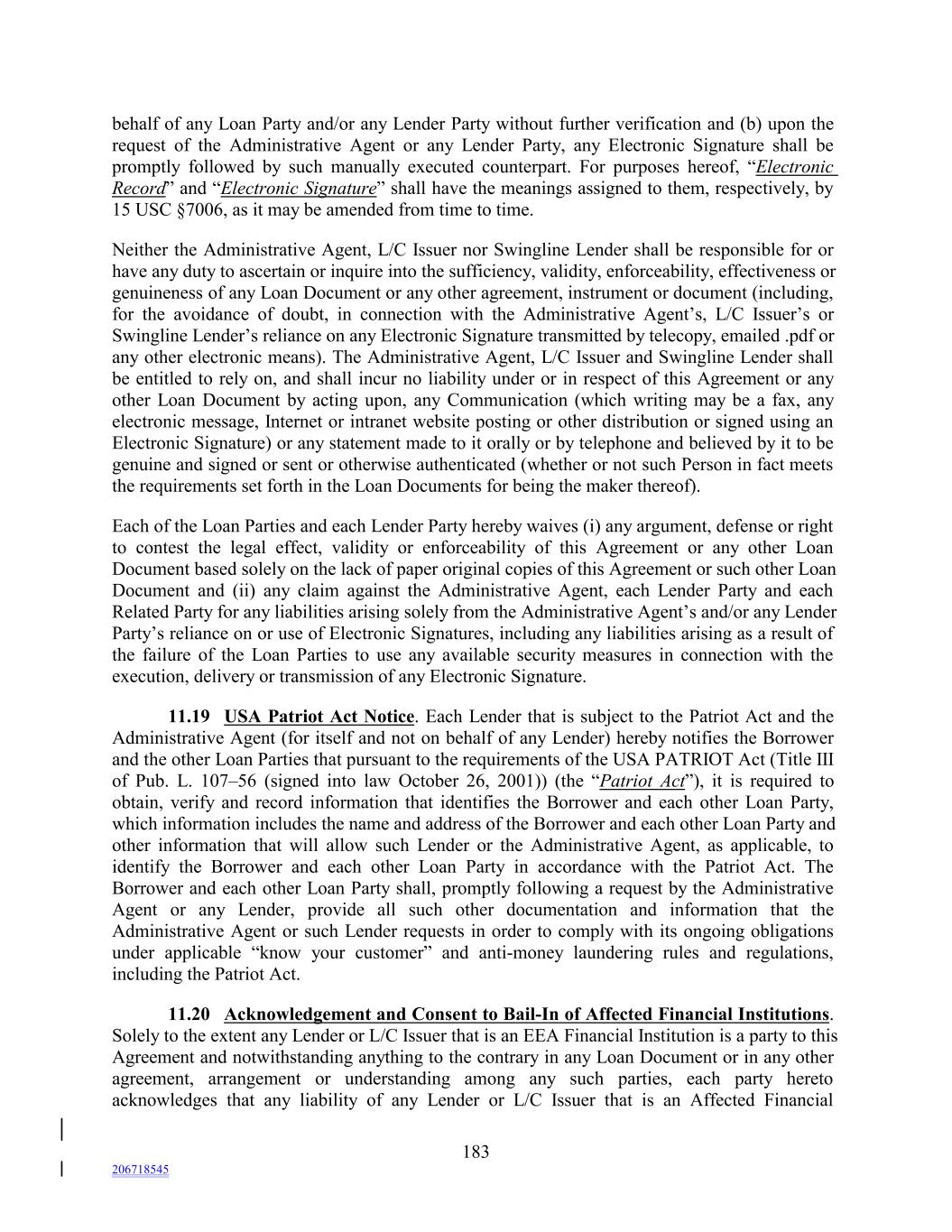 behalf of any Loan Party and/or any Lender Party without further verification and (b) upon the request of the Administrative Agent or any Lender Party, any Electronic Signature shall be promptly followed by such manually executed counterpart. For purposes hereof, “Electronic Record” and “Electronic Signature” shall have the meanings assigned to them, respectively, by 15 USC §7006, as it may be amended from time to time. Neither the Administrative Agent, L/C Issuer nor Swingline Lender shall be responsible for or have any duty to ascertain or inquire into the sufficiency, validity, enforceability, effectiveness or genuineness of any Loan Document or any other agreement, instrument or document (including, for the avoidance of doubt, in connection with the Administrative Agent’s, L/C Issuer’s or Swingline Lender’s reliance on any Electronic Signature transmitted by telecopy, emailed .pdf or any other electronic means). The Administrative Agent, L/C Issuer and Swingline Lender shall be entitled to rely on, and shall incur no liability under or in respect of this Agreement or any other Loan Document by acting upon, any Communication (which writing may be a fax, any electronic message, Internet or intranet website posting or other distribution or signed using an Electronic Signature) or any statement made to it orally or by telephone and believed by it to be genuine and signed or sent or otherwise authenticated (whether or not such Person in fact meets the requirements set forth in the Loan Documents for being the maker thereof). Each of the Loan Parties and each Lender Party hereby waives (i) any argument, defense or right to contest the legal effect, validity or enforceability of this Agreement or any other Loan Document based solely on the lack of paper original copies of this Agreement or such other Loan Document and (ii) any claim against the Administrative Agent, each Lender Party and each Related Party for any liabilities arising solely from the Administrative Agent’s and/or any Lender Party’s reliance on or use of Electronic Signatures, including any liabilities arising as a result of the failure of the Loan Parties to use any available security measures in connection with the execution, delivery or transmission of any Electronic Signature. 11.19 USA Patriot Act Notice. Each Lender that is subject to the Patriot Act and the Administrative Agent (for itself and not on behalf of any Lender) hereby notifies the Borrower and the other Loan Parties that pursuant to the requirements of the USA PATRIOT Act (Title III of Pub. L. 107–56 (signed into law October 26, 2001)) (the “Patriot Act”), it is required to obtain, verify and record information that identifies the Borrower and each other Loan Party, which information includes the name and address of the Borrower and each other Loan Party and other information that will allow such Lender or the Administrative Agent, as applicable, to identify the Borrower and each other Loan Party in accordance with the Patriot Act. The Borrower and each other Loan Party shall, promptly following a request by the Administrative Agent or any Lender, provide all such other documentation and information that the Administrative Agent or such Lender requests in order to comply with its ongoing obligations under applicable “know your customer” and anti-money laundering rules and regulations, including the Patriot Act. 11.20 Acknowledgement and Consent to Bail-In of Affected Financial Institutions. Solely to the extent any Lender or L/C Issuer that is an EEA Financial Institution is a party to this Agreement and notwithstanding anything to the contrary in any Loan Document or in any other agreement, arrangement or understanding among any such parties, each party hereto acknowledges that any liability of any Lender or L/C Issuer that is an Affected Financial 183 206718545