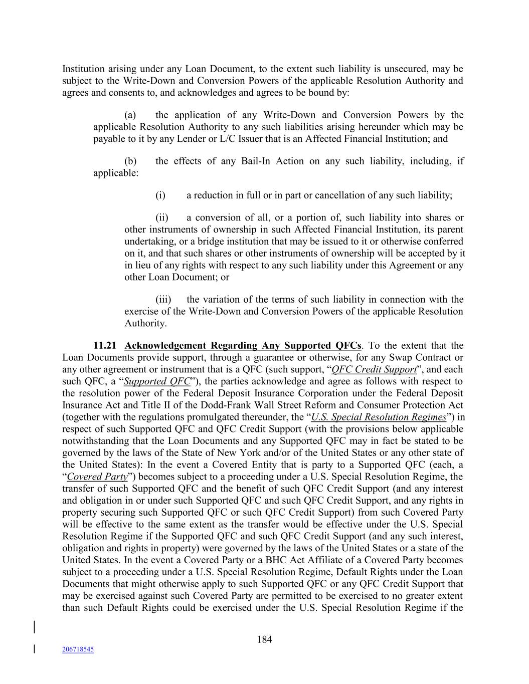 Institution arising under any Loan Document, to the extent such liability is unsecured, may be subject to the Write-Down and Conversion Powers of the applicable Resolution Authority and agrees and consents to, and acknowledges and agrees to be bound by: (a) the application of any Write-Down and Conversion Powers by the applicable Resolution Authority to any such liabilities arising hereunder which may be payable to it by any Lender or L/C Issuer that is an Affected Financial Institution; and (b) the effects of any Bail-In Action on any such liability, including, if applicable: (i) a reduction in full or in part or cancellation of any such liability; (ii) a conversion of all, or a portion of, such liability into shares or other instruments of ownership in such Affected Financial Institution, its parent undertaking, or a bridge institution that may be issued to it or otherwise conferred on it, and that such shares or other instruments of ownership will be accepted by it in lieu of any rights with respect to any such liability under this Agreement or any other Loan Document; or (iii) the variation of the terms of such liability in connection with the exercise of the Write-Down and Conversion Powers of the applicable Resolution Authority. 11.21 Acknowledgement Regarding Any Supported QFCs. To the extent that the Loan Documents provide support, through a guarantee or otherwise, for any Swap Contract or any other agreement or instrument that is a QFC (such support, “QFC Credit Support”, and each such QFC, a “Supported QFC”), the parties acknowledge and agree as follows with respect to the resolution power of the Federal Deposit Insurance Corporation under the Federal Deposit Insurance Act and Title II of the Dodd-Frank Wall Street Reform and Consumer Protection Act (together with the regulations promulgated thereunder, the “U.S. Special Resolution Regimes”) in respect of such Supported QFC and QFC Credit Support (with the provisions below applicable notwithstanding that the Loan Documents and any Supported QFC may in fact be stated to be governed by the laws of the State of New York and/or of the United States or any other state of the United States): In the event a Covered Entity that is party to a Supported QFC (each, a “Covered Party”) becomes subject to a proceeding under a U.S. Special Resolution Regime, the transfer of such Supported QFC and the benefit of such QFC Credit Support (and any interest and obligation in or under such Supported QFC and such QFC Credit Support, and any rights in property securing such Supported QFC or such QFC Credit Support) from such Covered Party will be effective to the same extent as the transfer would be effective under the U.S. Special Resolution Regime if the Supported QFC and such QFC Credit Support (and any such interest, obligation and rights in property) were governed by the laws of the United States or a state of the United States. In the event a Covered Party or a BHC Act Affiliate of a Covered Party becomes subject to a proceeding under a U.S. Special Resolution Regime, Default Rights under the Loan Documents that might otherwise apply to such Supported QFC or any QFC Credit Support that may be exercised against such Covered Party are permitted to be exercised to no greater extent than such Default Rights could be exercised under the U.S. Special Resolution Regime if the 184 206718545