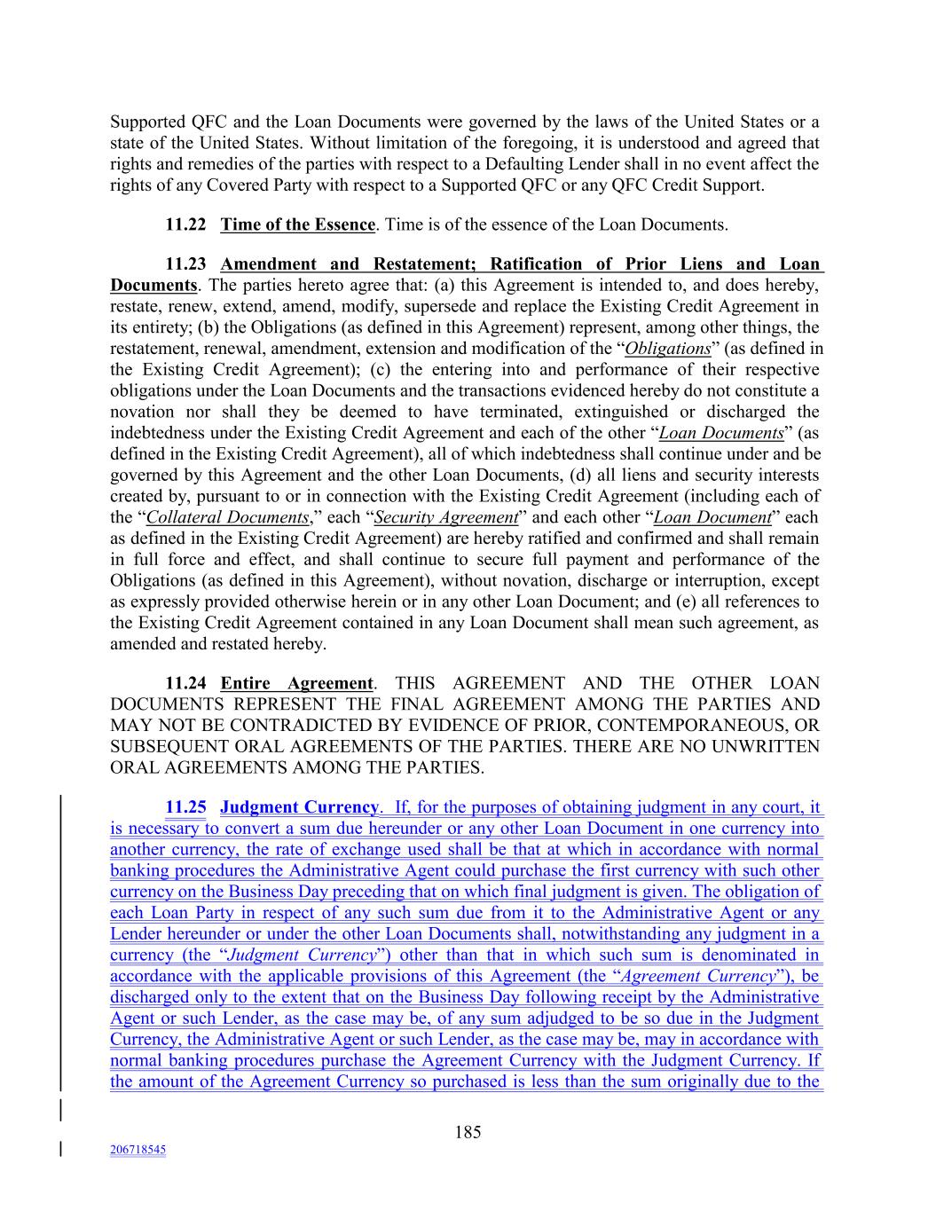Supported QFC and the Loan Documents were governed by the laws of the United States or a state of the United States. Without limitation of the foregoing, it is understood and agreed that rights and remedies of the parties with respect to a Defaulting Lender shall in no event affect the rights of any Covered Party with respect to a Supported QFC or any QFC Credit Support. 11.22 Time of the Essence. Time is of the essence of the Loan Documents. 11.23 Amendment and Restatement; Ratification of Prior Liens and Loan Documents. The parties hereto agree that: (a) this Agreement is intended to, and does hereby, restate, renew, extend, amend, modify, supersede and replace the Existing Credit Agreement in its entirety; (b) the Obligations (as defined in this Agreement) represent, among other things, the restatement, renewal, amendment, extension and modification of the “Obligations” (as defined in the Existing Credit Agreement); (c) the entering into and performance of their respective obligations under the Loan Documents and the transactions evidenced hereby do not constitute a novation nor shall they be deemed to have terminated, extinguished or discharged the indebtedness under the Existing Credit Agreement and each of the other “Loan Documents” (as defined in the Existing Credit Agreement), all of which indebtedness shall continue under and be governed by this Agreement and the other Loan Documents, (d) all liens and security interests created by, pursuant to or in connection with the Existing Credit Agreement (including each of the “Collateral Documents,” each “Security Agreement” and each other “Loan Document” each as defined in the Existing Credit Agreement) are hereby ratified and confirmed and shall remain in full force and effect, and shall continue to secure full payment and performance of the Obligations (as defined in this Agreement), without novation, discharge or interruption, except as expressly provided otherwise herein or in any other Loan Document; and (e) all references to the Existing Credit Agreement contained in any Loan Document shall mean such agreement, as amended and restated hereby. 11.24 Entire Agreement. THIS AGREEMENT AND THE OTHER LOAN DOCUMENTS REPRESENT THE FINAL AGREEMENT AMONG THE PARTIES AND MAY NOT BE CONTRADICTED BY EVIDENCE OF PRIOR, CONTEMPORANEOUS, OR SUBSEQUENT ORAL AGREEMENTS OF THE PARTIES. THERE ARE NO UNWRITTEN ORAL AGREEMENTS AMONG THE PARTIES. 11.25 Judgment Currency. If, for the purposes of obtaining judgment in any court, it is necessary to convert a sum due hereunder or any other Loan Document in one currency into another currency, the rate of exchange used shall be that at which in accordance with normal banking procedures the Administrative Agent could purchase the first currency with such other currency on the Business Day preceding that on which final judgment is given. The obligation of each Loan Party in respect of any such sum due from it to the Administrative Agent or any Lender hereunder or under the other Loan Documents shall, notwithstanding any judgment in a currency (the “Judgment Currency”) other than that in which such sum is denominated in accordance with the applicable provisions of this Agreement (the “Agreement Currency”), be discharged only to the extent that on the Business Day following receipt by the Administrative Agent or such Lender, as the case may be, of any sum adjudged to be so due in the Judgment Currency, the Administrative Agent or such Lender, as the case may be, may in accordance with normal banking procedures purchase the Agreement Currency with the Judgment Currency. If the amount of the Agreement Currency so purchased is less than the sum originally due to the 185 206718545