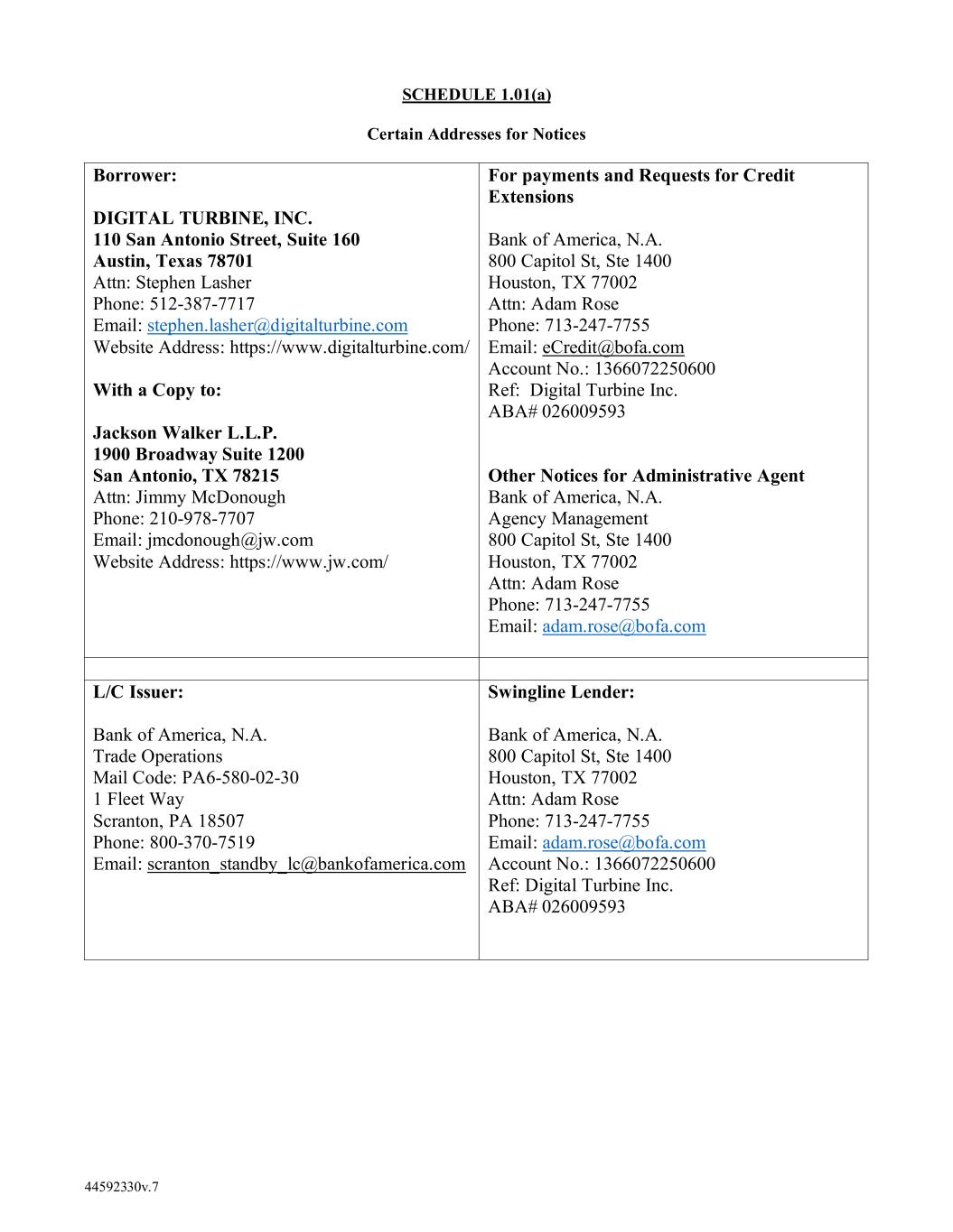 SCHEDULE 1.01(a) Certain Addresses for Notices Borrower: DIGITAL TURBINE, INC. 110 San Antonio Street, Suite 160 Austin, Texas 78701 Attn: Stephen Lasher Phone: 512-387-7717 Email: stephen.lasher@digitalturbine.com Website Address: https://www.digitalturbine.com/ With a Copy to: Jackson Walker L.L.P. 1900 Broadway Suite 1200 San Antonio, TX 78215 Attn: Jimmy McDonough Phone: 210-978-7707 Email: jmcdonough@jw.com Website Address: https://www.jw.com/ For payments and Requests for Credit Extensions Bank of America, N.A. 800 Capitol St, Ste 1400 Houston, TX 77002 Attn: Adam Rose Phone: 713-247-7755 Email: eCredit@bofa.com Account No.: 1366072250600 Ref: Digital Turbine Inc. ABA# 026009593 Other Notices for Administrative Agent Bank of America, N.A. Agency Management 800 Capitol St, Ste 1400 Houston, TX 77002 Attn: Adam Rose Phone: 713-247-7755 Email: adam.rose@bofa.com L/C Issuer: Bank of America, N.A. Trade Operations Mail Code: PA6-580-02-30 1 Fleet Way Scranton, PA 18507 Phone: 800-370-7519 Email: scranton_standby_lc@bankofamerica.com Swingline Lender: Bank of America, N.A. 800 Capitol St, Ste 1400 Houston, TX 77002 Attn: Adam Rose Phone: 713-247-7755 Email: adam.rose@bofa.com Account No.: 1366072250600 Ref: Digital Turbine Inc. ABA# 026009593 44592330v.7