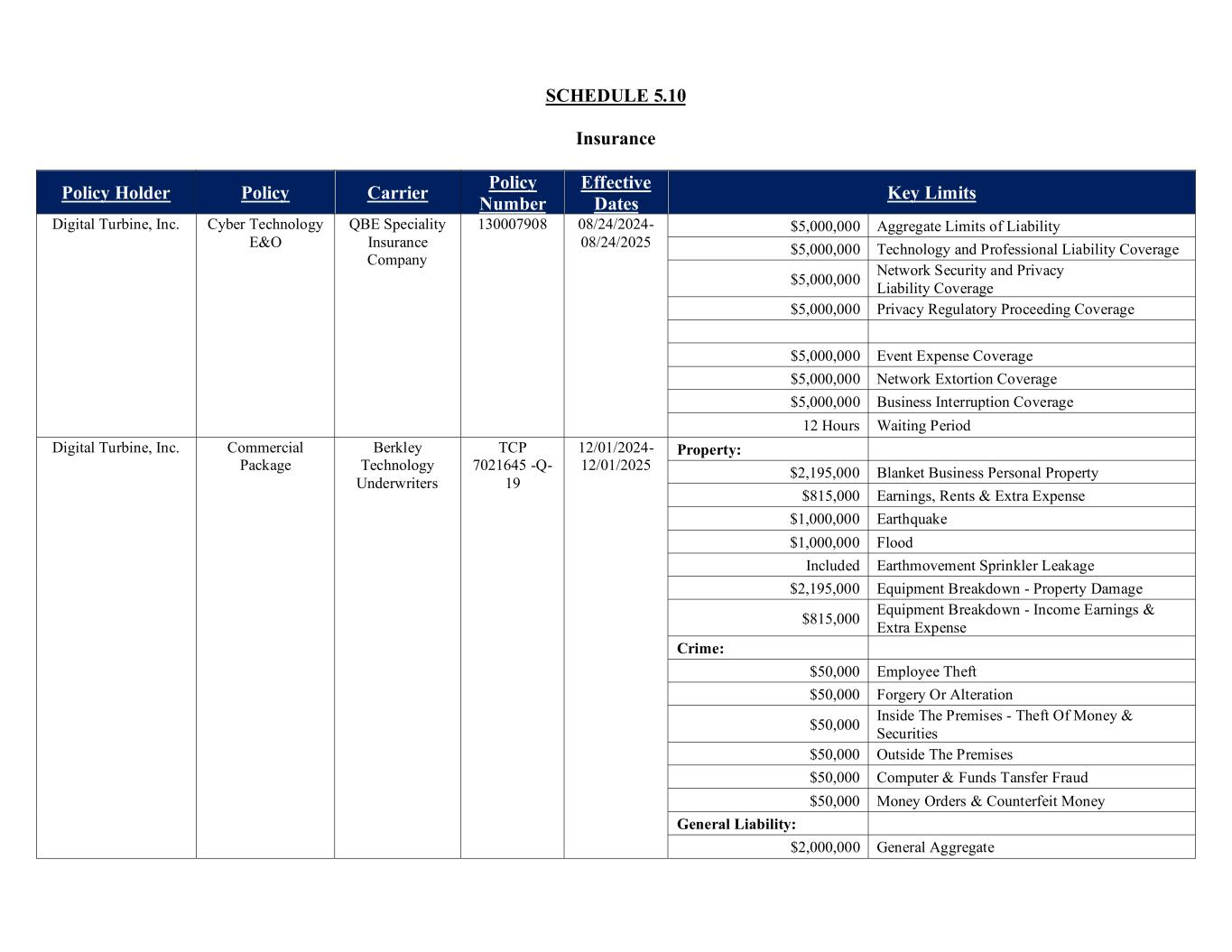 SCHEDULE 5.10 Insurance Policy Holder Policy Carrier Policy Number Effective Dates Key Limits Digital Turbine, Inc. Cyber Technology E&O QBE Speciality Insurance Company 130007908 08/24/2024- 08/24/2025 $5,000,000 Aggregate Limits of Liability $5,000,000 Technology and Professional Liability Coverage $5,000,000 Network Security and Privacy Liability Coverage $5,000,000 Privacy Regulatory Proceeding Coverage $5,000,000 Event Expense Coverage $5,000,000 Network Extortion Coverage $5,000,000 Business Interruption Coverage 12 Hours Waiting Period Digital Turbine, Inc. Commercial Package Berkley Technology Underwriters TCP 7021645 -Q- 19 12/01/2024- 12/01/2025 Property: $2,195,000 Blanket Business Personal Property $815,000 Earnings, Rents & Extra Expense $1,000,000 Earthquake $1,000,000 Flood Included Earthmovement Sprinkler Leakage $2,195,000 Equipment Breakdown - Property Damage $815,000 Equipment Breakdown - Income Earnings & Extra Expense Crime: $50,000 Employee Theft $50,000 Forgery Or Alteration $50,000 Inside The Premises - Theft Of Money & Securities $50,000 Outside The Premises $50,000 Computer & Funds Tansfer Fraud $50,000 Money Orders & Counterfeit Money General Liability: $2,000,000 General Aggregate