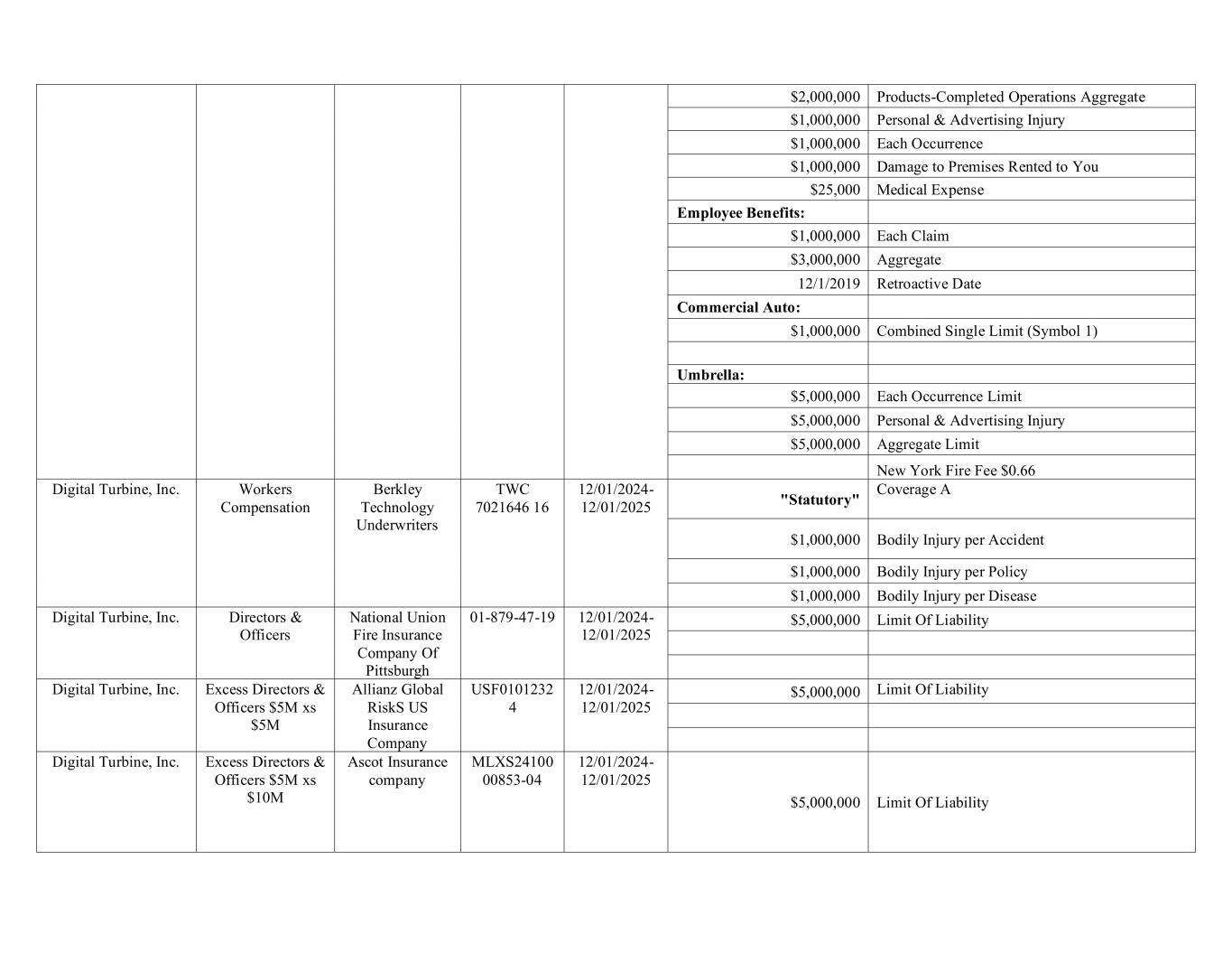 $2,000,000 Products-Completed Operations Aggregate $1,000,000 Personal & Advertising Injury $1,000,000 Each Occurrence $1,000,000 Damage to Premises Rented to You $25,000 Medical Expense Employee Benefits: $1,000,000 Each Claim $3,000,000 Aggregate 12/1/2019 Retroactive Date Commercial Auto: $1,000,000 Combined Single Limit (Symbol 1) Umbrella: $5,000,000 Each Occurrence Limit $5,000,000 Personal & Advertising Injury $5,000,000 Aggregate Limit New York Fire Fee $0.66 Digital Turbine, Inc. Workers Compensation Berkley Technology Underwriters TWC 7021646 16 12/01/2024- 12/01/2025 "Statutory" Coverage A $1,000,000 Bodily Injury per Accident $1,000,000 Bodily Injury per Policy $1,000,000 Bodily Injury per Disease Digital Turbine, Inc. Directors & Officers National Union Fire Insurance Company Of Pittsburgh 01-879-47-19 12/01/2024- 12/01/2025 $5,000,000 Limit Of Liability Digital Turbine, Inc. Excess Directors & Officers $5M xs $5M Allianz Global RiskS US Insurance Company USF0101232 4 12/01/2024- 12/01/2025 $5,000,000 Limit Of Liability Digital Turbine, Inc. Excess Directors & Officers $5M xs $10M Ascot Insurance company MLXS24100 00853-04 12/01/2024- 12/01/2025 $5,000,000 Limit Of Liability