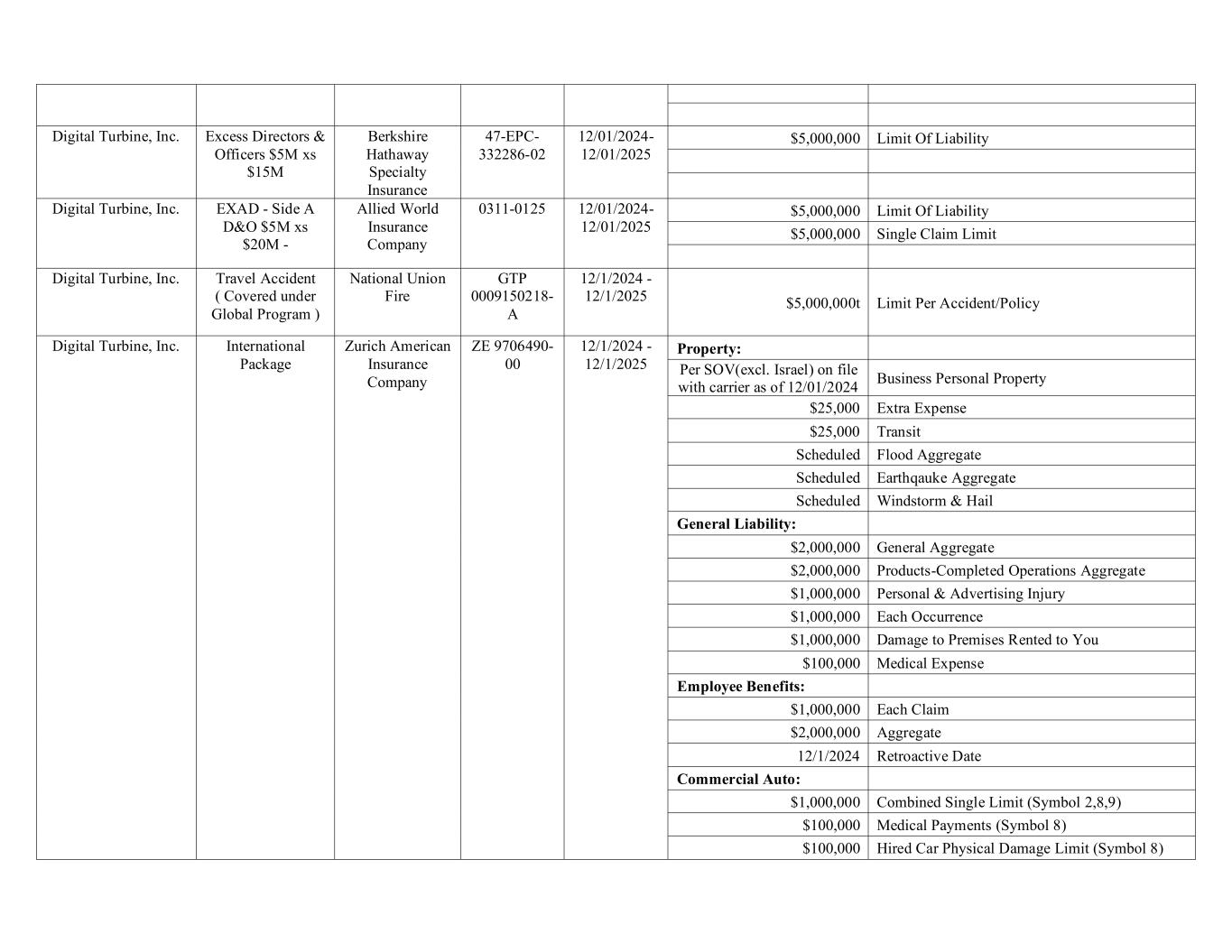 Digital Turbine, Inc. Excess Directors & Officers $5M xs $15M Berkshire Hathaway Specialty Insurance 47-EPC- 332286-02 12/01/2024- 12/01/2025 $5,000,000 Limit Of Liability Digital Turbine, Inc. EXAD - Side A D&O $5M xs $20M - Allied World Insurance Company 0311-0125 12/01/2024- 12/01/2025 $5,000,000 Limit Of Liability $5,000,000 Single Claim Limit Digital Turbine, Inc. Travel Accident ( Covered under Global Program ) National Union Fire GTP 0009150218- A 12/1/2024 - 12/1/2025 $5,000,000t Limit Per Accident/Policy Digital Turbine, Inc. International Package Zurich American Insurance Company ZE 9706490- 00 12/1/2024 - 12/1/2025 Property: Per SOV(excl. Israel) on file with carrier as of 12/01/2024 Business Personal Property $25,000 Extra Expense $25,000 Transit Scheduled Flood Aggregate Scheduled Earthqauke Aggregate Scheduled Windstorm & Hail General Liability: $2,000,000 General Aggregate $2,000,000 Products-Completed Operations Aggregate $1,000,000 Personal & Advertising Injury $1,000,000 Each Occurrence $1,000,000 Damage to Premises Rented to You $100,000 Medical Expense Employee Benefits: $1,000,000 Each Claim $2,000,000 Aggregate 12/1/2024 Retroactive Date Commercial Auto: $1,000,000 Combined Single Limit (Symbol 2,8,9) $100,000 Medical Payments (Symbol 8) $100,000 Hired Car Physical Damage Limit (Symbol 8)