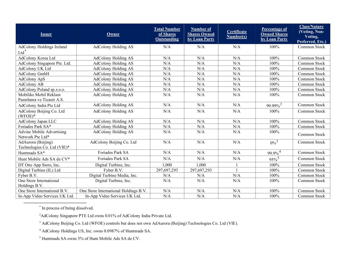 Issuer Owner Total Number of Shares Outstanding Number of Shares Owned by Loan Party Certificate Number(s) Percentage of Owned Shares by Loan Party Class/Nature (Voting, Non- Voting, Preferred, Etc.) AdColony Holdings Ireland Ltd* AdColony Holding AS N/A N/A N/A 100% Common Stock AdColony Korea Ltd AdColony Holding AS N/A N/A N/A 100% Common Stock AdColony Singapore Pte. Ltd. AdColony Holding AS N/A N/A N/A 100% Common Stock AdColony UK Ltd AdColony Holding AS N/A N/A N/A 100% Common Stock AdColony GmbH AdColony Holding AS N/A N/A N/A 100% Common Stock AdColony ApS AdColony Holding AS N/A N/A N/A 100% Common Stock AdColony AB AdColony Holding AS N/A N/A N/A 100% Common Stock AdColony Poland sp.z.o.o. AdColony Holding AS N/A N/A N/A 100% Common Stock Mobilike Mobil Reklam Pazarlama ve Ticaret A.S. AdColony Holding AS N/A N/A N/A 100% Common Stock AdColony India Pte Ltd AdColony Holding AS N/A N/A N/A 99.99%2 Common Stock AdColony Beijing Co. Ltd (WFOE)* AdColony Holding AS N/A N/A N/A 100% Common Stock AdColony Japan LLC AdColony Holding AS N/A N/A N/A 100% Common Stock Foriades Park SA* AdColony Holding AS N/A N/A N/A 100% Common Stock Advine Mobile Advertising Network Pte Ltd* AdColony Holding AS N/A N/A N/A 100% Common Stock AdAurora (Beijing) Technologies Co. Ltd (VIE)* AdColony Beijing Co. Ltd N/A N/A N/A 0%3 Common Stock Huntmads SA* Foriades Park SA N/A N/A N/A 99.9%4 Common Stock Hunt Mobile Ads SA de CV* Foriades Park SA N/A N/A N/A 95%5 Common Stock DT One App Store, Inc. Digital Turbine, Inc. 1,000 1,000 1 100% Common Stock Digital Turbine (IL) Ltd Fyber B.V. 297,697,293 297,697,293 1 100% Common Stock Fyber B.V. Digital Turbine Media, Inc. N/A N/A N/A 100% Common Stock One Store International Holdings B.V. Digital Turbine, Inc. N/A N/A N/A 100% Common Stock One Store International B.V. One Store International Holdings B.V. N/A N/A N/A 100% Common Stock In-App Video Services UK Ltd. In-App Video Services UK Ltd. N/A N/A N/A 100% Common Stock * In process of being dissolved. 2AdColony Singapore PTE Ltd owns 0.01% of AdColony India Private Ltd. 3 AdColony Beijing Co. Ltd (WFOE) controls but does not own AdAurora (Beijing) Technologies Co. Ltd (VIE). 4 AdColony Holdings US, Inc. owns 0.0987% of Huntmads SA. 5 Huntmads SA owns 5% of Hunt Mobile Ads SA de CV.