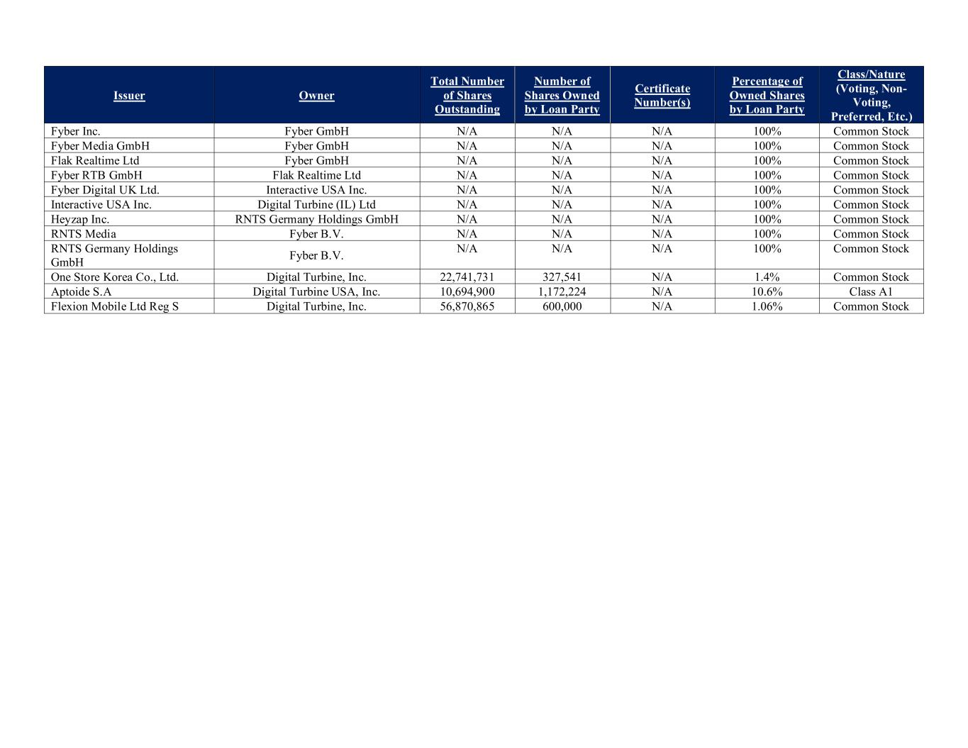 Issuer Owner Total Number of Shares Outstanding Number of Shares Owned by Loan Party Certificate Number(s) Percentage of Owned Shares by Loan Party Class/Nature (Voting, Non- Voting, Preferred, Etc.) Fyber Inc. Fyber GmbH N/A N/A N/A 100% Common Stock Fyber Media GmbH Fyber GmbH N/A N/A N/A 100% Common Stock Flak Realtime Ltd Fyber GmbH N/A N/A N/A 100% Common Stock Fyber RTB GmbH Flak Realtime Ltd N/A N/A N/A 100% Common Stock Fyber Digital UK Ltd. Interactive USA Inc. N/A N/A N/A 100% Common Stock Interactive USA Inc. Digital Turbine (IL) Ltd N/A N/A N/A 100% Common Stock Heyzap Inc. RNTS Germany Holdings GmbH N/A N/A N/A 100% Common Stock RNTS Media Fyber B.V. N/A N/A N/A 100% Common Stock RNTS Germany Holdings GmbH Fyber B.V. N/A N/A N/A 100% Common Stock One Store Korea Co., Ltd. Digital Turbine, Inc. 22,741,731 327,541 N/A 1.4% Common Stock Aptoide S.A Digital Turbine USA, Inc. 10,694,900 1,172,224 N/A 10.6% Class A1 Flexion Mobile Ltd Reg S Digital Turbine, Inc. 56,870,865 600,000 N/A 1.06% Common Stock