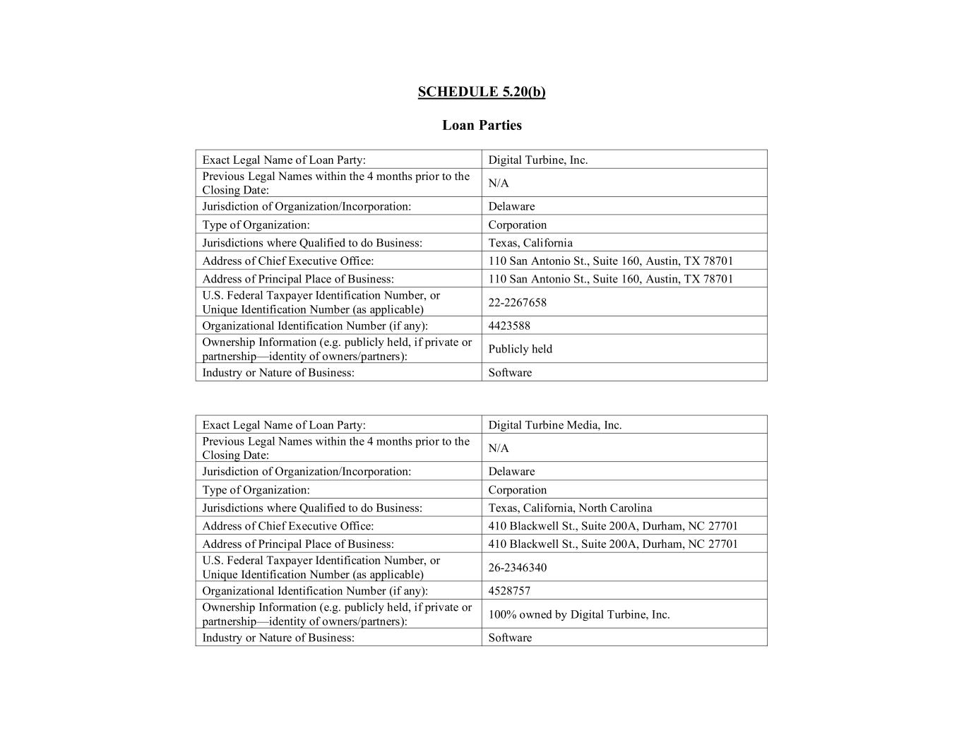 SCHEDULE 5.20(b) Loan Parties Exact Legal Name of Loan Party: Digital Turbine, Inc. Previous Legal Names within the 4 months prior to the Closing Date: N/A Jurisdiction of Organization/Incorporation: Delaware Type of Organization: Corporation Jurisdictions where Qualified to do Business: Texas, California Address of Chief Executive Office: 110 San Antonio St., Suite 160, Austin, TX 78701 Address of Principal Place of Business: 110 San Antonio St., Suite 160, Austin, TX 78701 U.S. Federal Taxpayer Identification Number, or Unique Identification Number (as applicable) 22-2267658 Organizational Identification Number (if any): 4423588 Ownership Information (e.g. publicly held, if private or partnership—identity of owners/partners): Publicly held Industry or Nature of Business: Software Exact Legal Name of Loan Party: Digital Turbine Media, Inc. Previous Legal Names within the 4 months prior to the Closing Date: N/A Jurisdiction of Organization/Incorporation: Delaware Type of Organization: Corporation Jurisdictions where Qualified to do Business: Texas, California, North Carolina Address of Chief Executive Office: 410 Blackwell St., Suite 200A, Durham, NC 27701 Address of Principal Place of Business: 410 Blackwell St., Suite 200A, Durham, NC 27701 U.S. Federal Taxpayer Identification Number, or Unique Identification Number (as applicable) 26-2346340 Organizational Identification Number (if any): 4528757 Ownership Information (e.g. publicly held, if private or partnership—identity of owners/partners): 100% owned by Digital Turbine, Inc. Industry or Nature of Business: Software