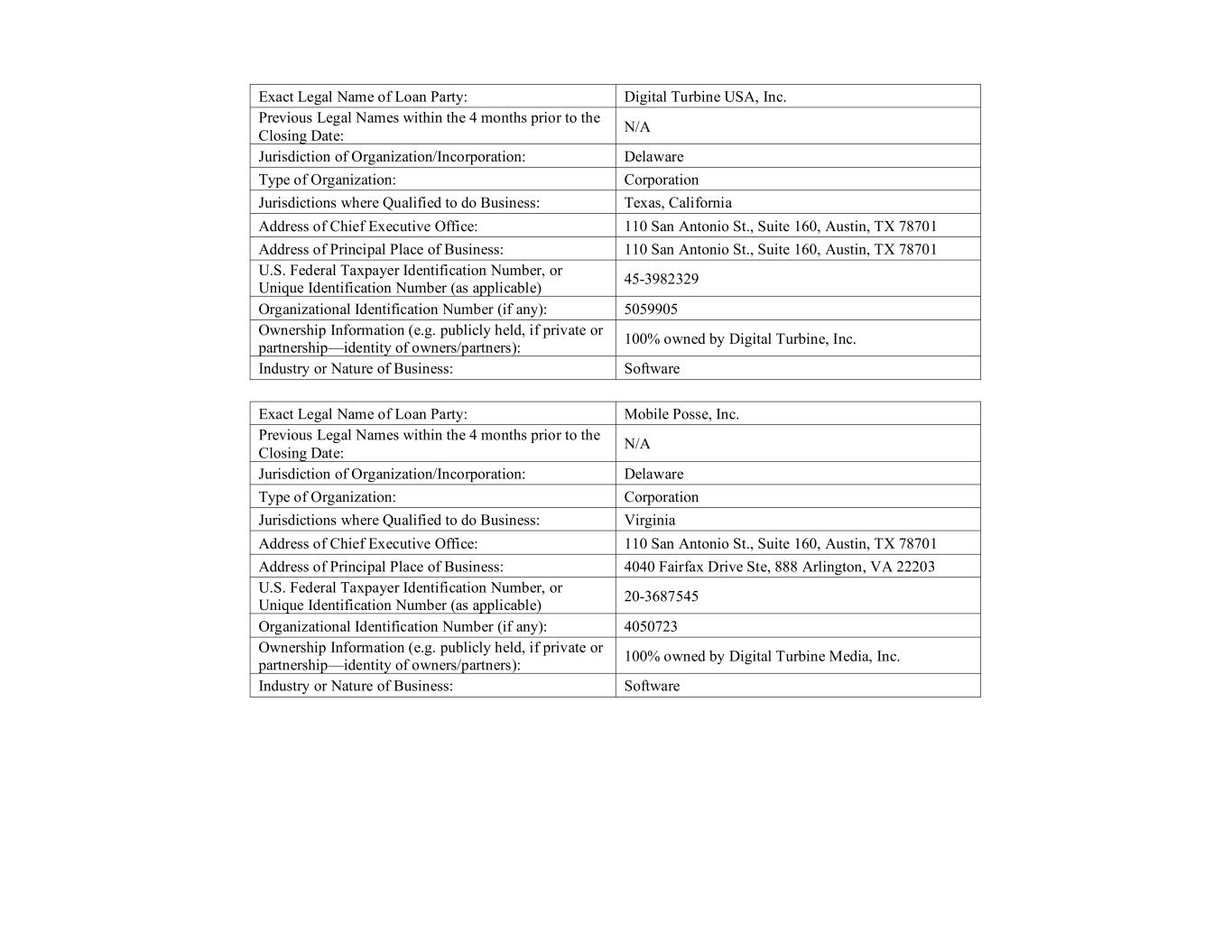 Exact Legal Name of Loan Party: Digital Turbine USA, Inc. Previous Legal Names within the 4 months prior to the Closing Date: N/A Jurisdiction of Organization/Incorporation: Delaware Type of Organization: Corporation Jurisdictions where Qualified to do Business: Texas, California Address of Chief Executive Office: 110 San Antonio St., Suite 160, Austin, TX 78701 Address of Principal Place of Business: 110 San Antonio St., Suite 160, Austin, TX 78701 U.S. Federal Taxpayer Identification Number, or Unique Identification Number (as applicable) 45-3982329 Organizational Identification Number (if any): 5059905 Ownership Information (e.g. publicly held, if private or partnership—identity of owners/partners): 100% owned by Digital Turbine, Inc. Industry or Nature of Business: Software Exact Legal Name of Loan Party: Mobile Posse, Inc. Previous Legal Names within the 4 months prior to the Closing Date: N/A Jurisdiction of Organization/Incorporation: Delaware Type of Organization: Corporation Jurisdictions where Qualified to do Business: Virginia Address of Chief Executive Office: 110 San Antonio St., Suite 160, Austin, TX 78701 Address of Principal Place of Business: 4040 Fairfax Drive Ste, 888 Arlington, VA 22203 U.S. Federal Taxpayer Identification Number, or Unique Identification Number (as applicable) 20-3687545 Organizational Identification Number (if any): 4050723 Ownership Information (e.g. publicly held, if private or partnership—identity of owners/partners): 100% owned by Digital Turbine Media, Inc. Industry or Nature of Business: Software
