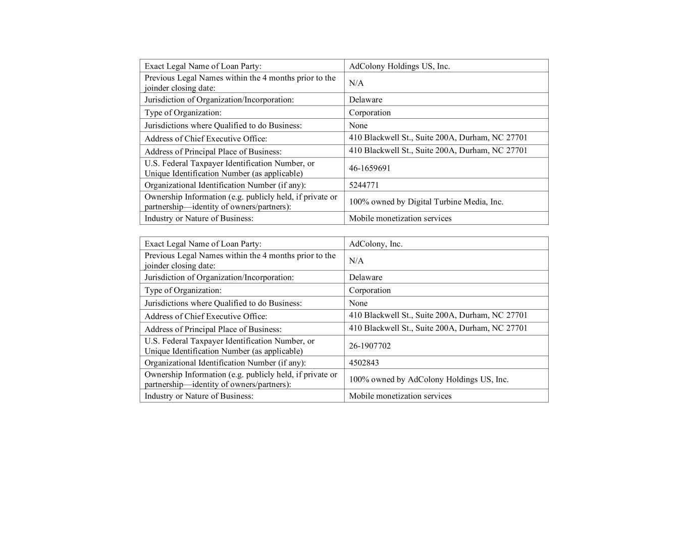 Exact Legal Name of Loan Party: AdColony Holdings US, Inc. Previous Legal Names within the 4 months prior to the joinder closing date: N/A Jurisdiction of Organization/Incorporation: Delaware Type of Organization: Corporation Jurisdictions where Qualified to do Business: None Address of Chief Executive Office: 410 Blackwell St., Suite 200A, Durham, NC 27701 Address of Principal Place of Business: 410 Blackwell St., Suite 200A, Durham, NC 27701 U.S. Federal Taxpayer Identification Number, or Unique Identification Number (as applicable) 46-1659691 Organizational Identification Number (if any): 5244771 Ownership Information (e.g. publicly held, if private or partnership—identity of owners/partners): 100% owned by Digital Turbine Media, Inc. Industry or Nature of Business: Mobile monetization services Exact Legal Name of Loan Party: AdColony, Inc. Previous Legal Names within the 4 months prior to the joinder closing date: N/A Jurisdiction of Organization/Incorporation: Delaware Type of Organization: Corporation Jurisdictions where Qualified to do Business: None Address of Chief Executive Office: 410 Blackwell St., Suite 200A, Durham, NC 27701 Address of Principal Place of Business: 410 Blackwell St., Suite 200A, Durham, NC 27701 U.S. Federal Taxpayer Identification Number, or Unique Identification Number (as applicable) 26-1907702 Organizational Identification Number (if any): 4502843 Ownership Information (e.g. publicly held, if private or partnership—identity of owners/partners): 100% owned by AdColony Holdings US, Inc. Industry or Nature of Business: Mobile monetization services