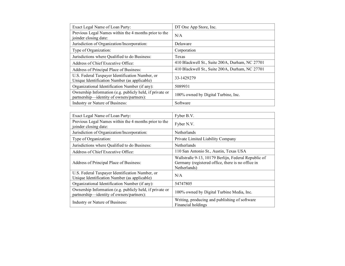 Exact Legal Name of Loan Party: DT One App Store, Inc. Previous Legal Names within the 4 months prior to the joinder closing date: N/A Jurisdiction of Organization/Incorporation: Delaware Type of Organization: Corporation Jurisdictions where Qualified to do Business: Texas Address of Chief Executive Office: 410 Blackwell St., Suite 200A, Durham, NC 27701 Address of Principal Place of Business: 410 Blackwell St., Suite 200A, Durham, NC 27701 U.S. Federal Taxpayer Identification Number, or Unique Identification Number (as applicable) 33-1429279 Organizational Identification Number (if any): 5089931 Ownership Information (e.g. publicly held, if private or partnership—identity of owners/partners): 100% owned by Digital Turbine, Inc. Industry or Nature of Business: Software Exact Legal Name of Loan Party: Fyber B.V. Previous Legal Names within the 4 months prior to the joinder closing date: Fyber N.V. Jurisdiction of Organization/Incorporation: Netherlands Type of Organization: Private Limited Liability Company Jurisdictions where Qualified to do Business: Netherlands Address of Chief Executive Office: 110 San Antonio St., Austin, Texas USA Address of Principal Place of Business: Wallstraße 9-13, 10179 Berlijn, Federal Republic of Germany (registered office, there is no office in Netherlands) U.S. Federal Taxpayer Identification Number, or Unique Identification Number (as applicable) N/A Organizational Identification Number (if any): 54747805 Ownership Information (e.g. publicly held, if private or partnership—identity of owners/partners): 100% owned by Digital Turbine Media, Inc. Industry or Nature of Business: Writing, producing and publishing of software Financial holdings