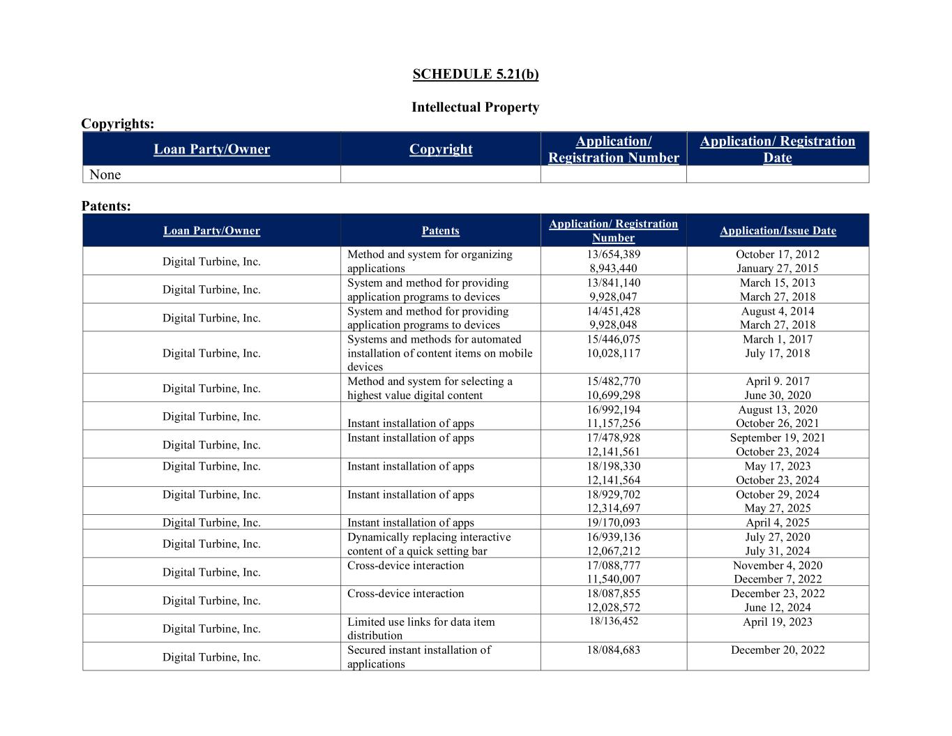 SCHEDULE 5.21(b) Intellectual Property Copyrights: Loan Party/Owner Copyright Application/ Registration Number Application/ Registration Date None Patents: Loan Party/Owner Patents Application/ Registration Number Application/Issue Date Digital Turbine, Inc. Method and system for organizing applications 13/654,389 8,943,440 October 17, 2012 January 27, 2015 Digital Turbine, Inc. System and method for providing application programs to devices 13/841,140 9,928,047 March 15, 2013 March 27, 2018 Digital Turbine, Inc. System and method for providing application programs to devices 14/451,428 9,928,048 August 4, 2014 March 27, 2018 Digital Turbine, Inc. Systems and methods for automated installation of content items on mobile devices 15/446,075 10,028,117 March 1, 2017 July 17, 2018 Digital Turbine, Inc. Method and system for selecting a highest value digital content 15/482,770 10,699,298 April 9. 2017 June 30, 2020 Digital Turbine, Inc. Instant installation of apps 16/992,194 11,157,256 August 13, 2020 October 26, 2021 Digital Turbine, Inc. Instant installation of apps 17/478,928 12,141,561 September 19, 2021 October 23, 2024 Digital Turbine, Inc. Instant installation of apps 18/198,330 12,141,564 May 17, 2023 October 23, 2024 Digital Turbine, Inc. Instant installation of apps 18/929,702 12,314,697 October 29, 2024 May 27, 2025 Digital Turbine, Inc. Instant installation of apps 19/170,093 April 4, 2025 Digital Turbine, Inc. Dynamically replacing interactive content of a quick setting bar 16/939,136 12,067,212 July 27, 2020 July 31, 2024 Digital Turbine, Inc. Cross-device interaction 17/088,777 11,540,007 November 4, 2020 December 7, 2022 Digital Turbine, Inc. Cross-device interaction 18/087,855 12,028,572 December 23, 2022 June 12, 2024 Digital Turbine, Inc. Limited use links for data item distribution 18/136,452 April 19, 2023 Digital Turbine, Inc. Secured instant installation of applications 18/084,683 December 20, 2022