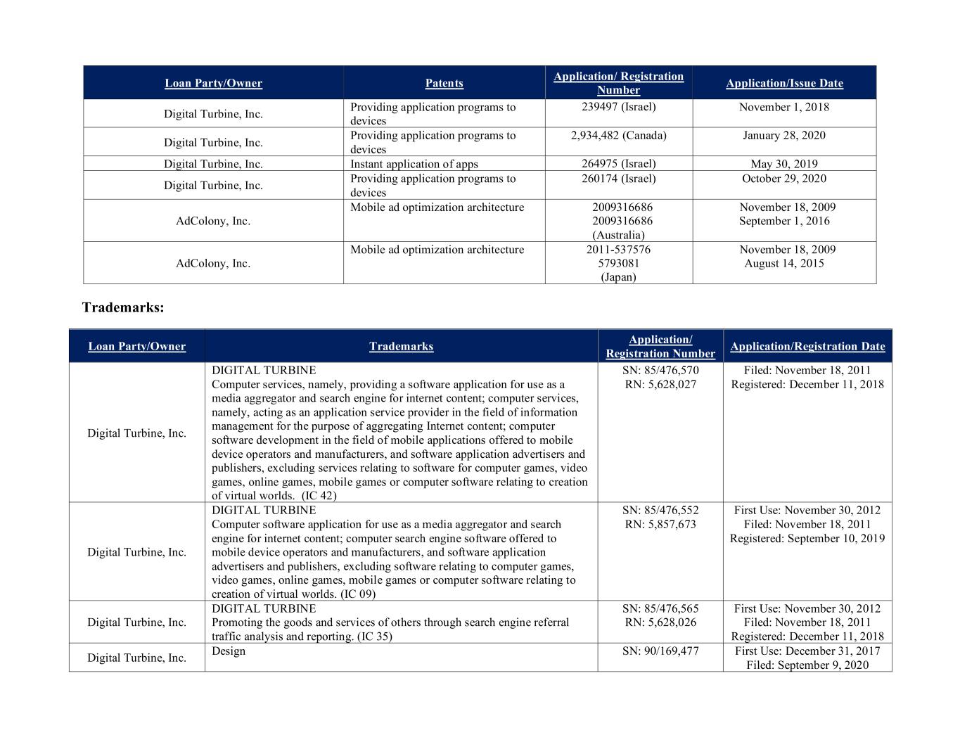 Loan Party/Owner Patents Application/ Registration Number Application/Issue Date Digital Turbine, Inc. Providing application programs to devices 239497 (Israel) November 1, 2018 Digital Turbine, Inc. Providing application programs to devices 2,934,482 (Canada) January 28, 2020 Digital Turbine, Inc. Instant application of apps 264975 (Israel) May 30, 2019 Digital Turbine, Inc. Providing application programs to devices 260174 (Israel) October 29, 2020 AdColony, Inc. Mobile ad optimization architecture 2009316686 2009316686 (Australia) November 18, 2009 September 1, 2016 AdColony, Inc. Mobile ad optimization architecture 2011-537576 5793081 (Japan) November 18, 2009 August 14, 2015 Trademarks: Loan Party/Owner Trademarks Application/ Registration Number Application/Registration Date Digital Turbine, Inc. DIGITAL TURBINE Computer services, namely, providing a software application for use as a media aggregator and search engine for internet content; computer services, namely, acting as an application service provider in the field of information management for the purpose of aggregating Internet content; computer software development in the field of mobile applications offered to mobile device operators and manufacturers, and software application advertisers and publishers, excluding services relating to software for computer games, video games, online games, mobile games or computer software relating to creation of virtual worlds. (IC 42) SN: 85/476,570 RN: 5,628,027 Filed: November 18, 2011 Registered: December 11, 2018 Digital Turbine, Inc. DIGITAL TURBINE Computer software application for use as a media aggregator and search engine for internet content; computer search engine software offered to mobile device operators and manufacturers, and software application advertisers and publishers, excluding software relating to computer games, video games, online games, mobile games or computer software relating to creation of virtual worlds. (IC 09) SN: 85/476,552 RN: 5,857,673 First Use: November 30, 2012 Filed: November 18, 2011 Registered: September 10, 2019 Digital Turbine, Inc. DIGITAL TURBINE Promoting the goods and services of others through search engine referral traffic analysis and reporting. (IC 35) SN: 85/476,565 RN: 5,628,026 First Use: November 30, 2012 Filed: November 18, 2011 Registered: December 11, 2018 Digital Turbine, Inc. Design SN: 90/169,477 First Use: December 31, 2017 Filed: September 9, 2020