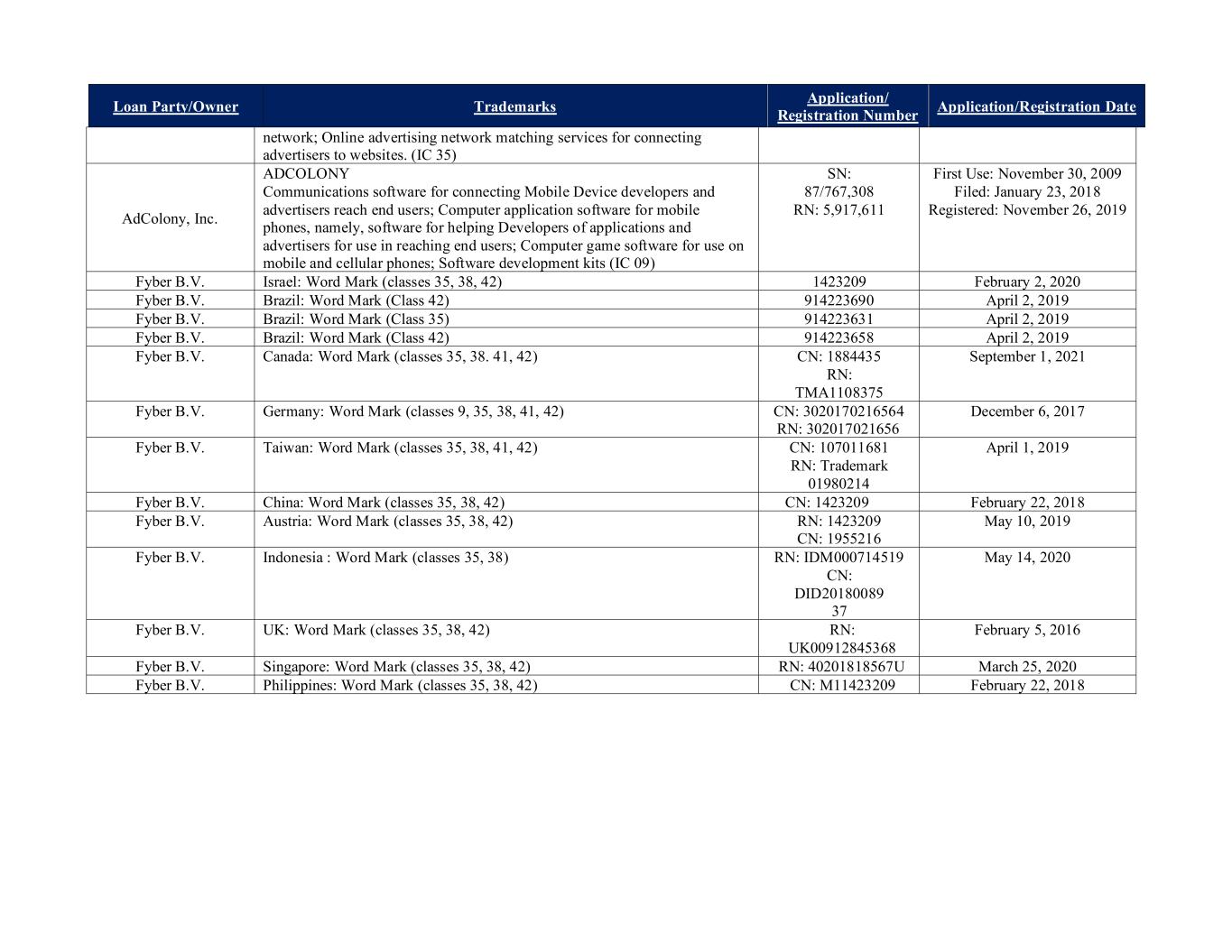 Loan Party/Owner Trademarks Application/ Registration Number Application/Registration Date network; Online advertising network matching services for connecting advertisers to websites. (IC 35) AdColony, Inc. ADCOLONY Communications software for connecting Mobile Device developers and advertisers reach end users; Computer application software for mobile phones, namely, software for helping Developers of applications and advertisers for use in reaching end users; Computer game software for use on mobile and cellular phones; Software development kits (IC 09) SN: 87/767,308 RN: 5,917,611 First Use: November 30, 2009 Filed: January 23, 2018 Registered: November 26, 2019 Fyber B.V. Israel: Word Mark (classes 35, 38, 42) 1423209 February 2, 2020 Fyber B.V. Brazil: Word Mark (Class 42) 914223690 April 2, 2019 Fyber B.V. Brazil: Word Mark (Class 35) 914223631 April 2, 2019 Fyber B.V. Brazil: Word Mark (Class 42) 914223658 April 2, 2019 Fyber B.V. Canada: Word Mark (classes 35, 38. 41, 42) CN: 1884435 RN: TMA1108375 September 1, 2021 Fyber B.V. Germany: Word Mark (classes 9, 35, 38, 41, 42) CN: 3020170216564 RN: 302017021656 December 6, 2017 Fyber B.V. Taiwan: Word Mark (classes 35, 38, 41, 42) CN: 107011681 RN: Trademark 01980214 April 1, 2019 Fyber B.V. China: Word Mark (classes 35, 38, 42) CN: 1423209 February 22, 2018 Fyber B.V. Austria: Word Mark (classes 35, 38, 42) RN: 1423209 CN: 1955216 May 10, 2019 Fyber B.V. Indonesia : Word Mark (classes 35, 38) RN: IDM000714519 CN: DID20180089 37 May 14, 2020 Fyber B.V. UK: Word Mark (classes 35, 38, 42) RN: UK00912845368 February 5, 2016 Fyber B.V. Singapore: Word Mark (classes 35, 38, 42) RN: 40201818567U March 25, 2020 Fyber B.V. Philippines: Word Mark (classes 35, 38, 42) CN: M11423209 February 22, 2018