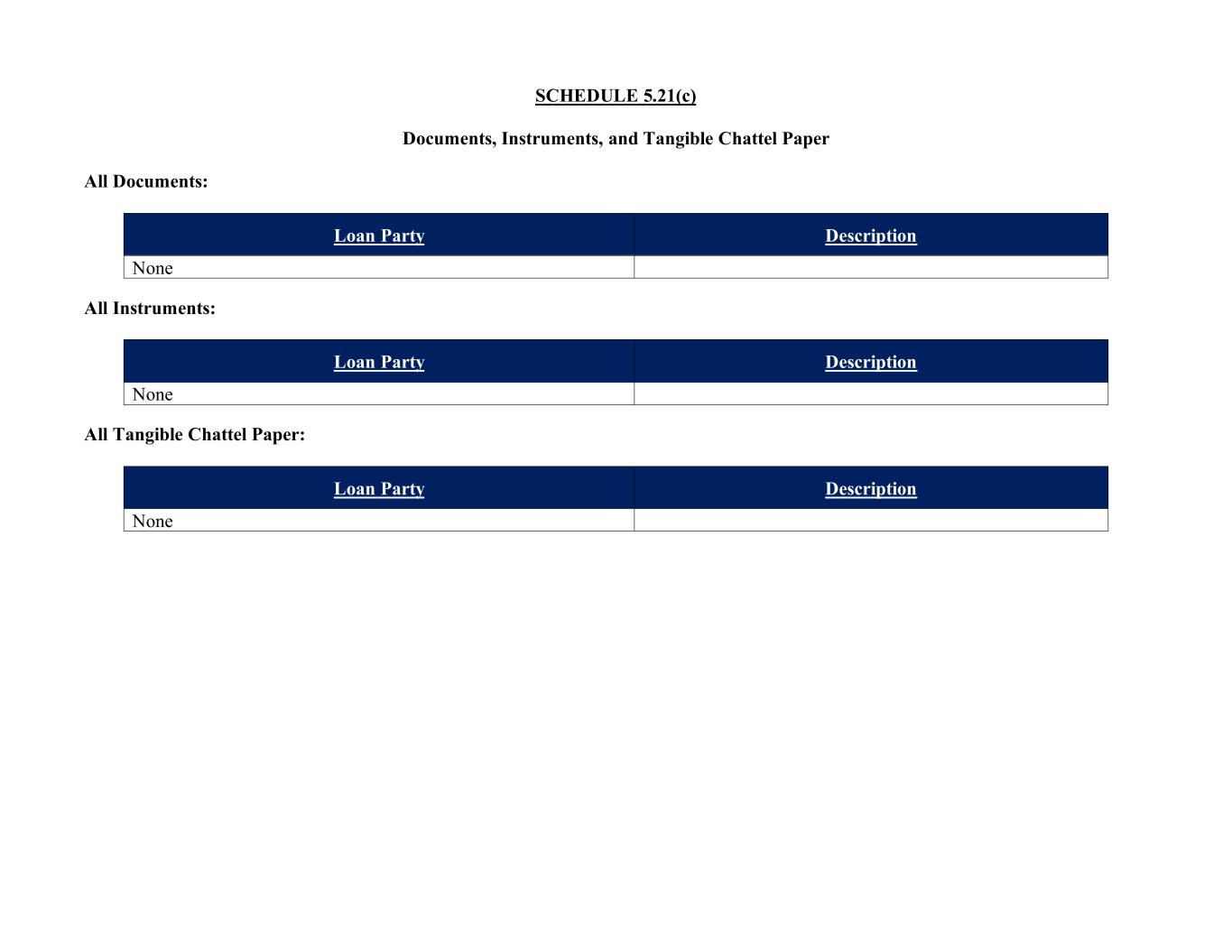SCHEDULE 5.21(c) Documents, Instruments, and Tangible Chattel Paper All Documents: Loan Party Description None All Instruments: Loan Party Description None All Tangible Chattel Paper: Loan Party Description None