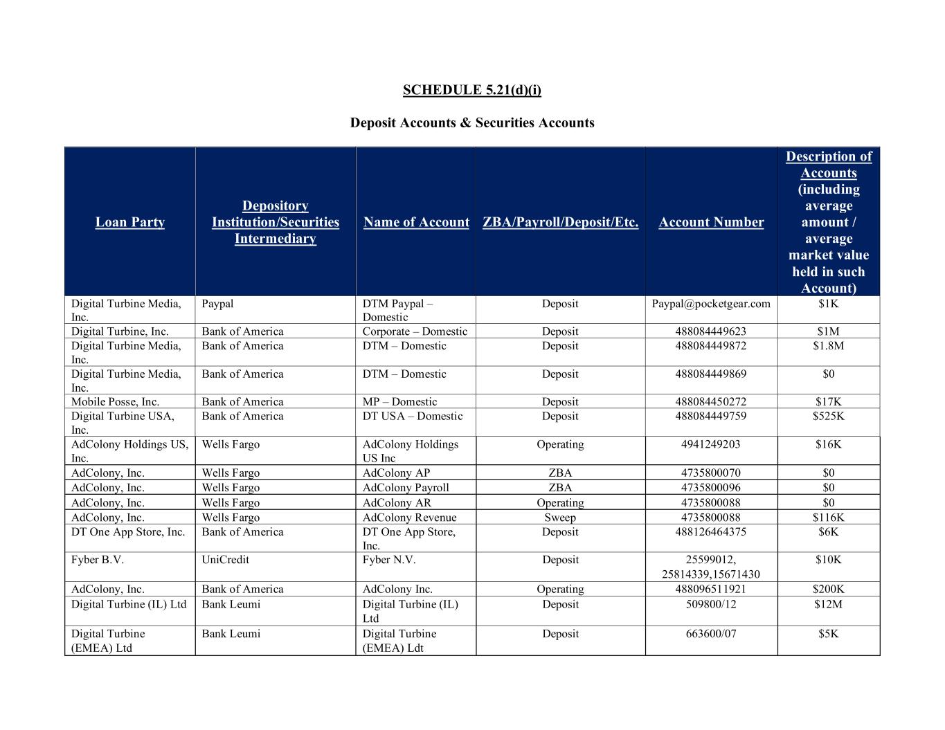 SCHEDULE 5.21(d)(i) Deposit Accounts & Securities Accounts Loan Party Depository Institution/Securities Intermediary Name of Account ZBA/Payroll/Deposit/Etc. Account Number Description of Accounts (including average amount / average market value held in such Account) Digital Turbine Media, Inc. Paypal DTM Paypal – Domestic Deposit Paypal@pocketgear.com $1K Digital Turbine, Inc. Bank of America Corporate – Domestic Deposit 488084449623 $1M Digital Turbine Media, Inc. Bank of America DTM – Domestic Deposit 488084449872 $1.8M Digital Turbine Media, Inc. Bank of America DTM – Domestic Deposit 488084449869 $0 Mobile Posse, Inc. Bank of America MP – Domestic Deposit 488084450272 $17K Digital Turbine USA, Inc. Bank of America DT USA – Domestic Deposit 488084449759 $525K AdColony Holdings US, Inc. Wells Fargo AdColony Holdings US Inc Operating 4941249203 $16K AdColony, Inc. Wells Fargo AdColony AP ZBA 4735800070 $0 AdColony, Inc. Wells Fargo AdColony Payroll ZBA 4735800096 $0 AdColony, Inc. Wells Fargo AdColony AR Operating 4735800088 $0 AdColony, Inc. Wells Fargo AdColony Revenue Sweep 4735800088 $116K DT One App Store, Inc. Bank of America DT One App Store, Inc. Deposit 488126464375 $6K Fyber B.V. UniCredit Fyber N.V. Deposit 25599012, 25814339,15671430 $10K AdColony, Inc. Bank of America AdColony Inc. Operating 488096511921 $200K Digital Turbine (IL) Ltd Bank Leumi Digital Turbine (IL) Ltd Deposit 509800/12 $12M Digital Turbine (EMEA) Ltd Bank Leumi Digital Turbine (EMEA) Ldt Deposit 663600/07 $5K