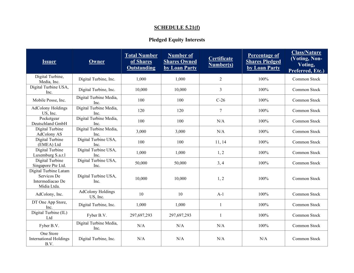 SCHEDULE 5.21(f) Pledged Equity Interests Issuer Owner Total Number of Shares Outstanding Number of Shares Owned by Loan Party Certificate Number(s) Percentage of Shares Pledged by Loan Party Class/Nature (Voting, Non- Voting, Preferred, Etc.) Digital Turbine, Media, Inc. Digital Turbine, Inc. 1,000 1,000 2 100% Common Stock Digital Turbine USA, Inc. Digital Turbine, Inc. 10,000 10,000 3 100% Common Stock Mobile Posse, Inc. Digital Turbine Media, Inc. 100 100 C-26 100% Common Stock AdColony Holdings US, Inc. Digital Turbine Media, Inc. 120 120 7 100% Common Stock Pocketgear Deutschland GmbH Digital Turbine Media, Inc. 100 100 N/A 100% Common Stock Digital Turbine AdColony AS Digital Turbine Media, Inc. 3,000 3,000 N/A 100% Common Stock Digital Turbine (EMEA) Ltd Digital Turbine USA, Inc. 100 100 11, 14 100% Common Stock Digital Turbine Luxemburg S.a.r.l Digital Turbine USA, Inc. 1,000 1,000 1, 2 100% Common Stock Digital Turbine Singapore Pte Ltd. Digital Turbine USA, Inc. 50,000 50,000 3, 4 100% Common Stock Digital Turbine Latam Servicos De Intermediacao De Midia Ltda. Digital Turbine USA, Inc. 10,000 10,000 1, 2 100% Common Stock AdColony, Inc. AdColony Holdings US, Inc. 10 10 A-1 100% Common Stock DT One App Store, Inc. Digital Turbine, Inc. 1,000 1,000 1 100% Common Stock Digital Turbine (IL) Ltd Fyber B.V. 297,697,293 297,697,293 1 100% Common Stock Fyber B.V. Digital Turbine Media, Inc. N/A N/A N/A 100% Common Stock One Store International Holdings B.V. Digital Turbine, Inc. N/A N/A N/A N/A Common Stock