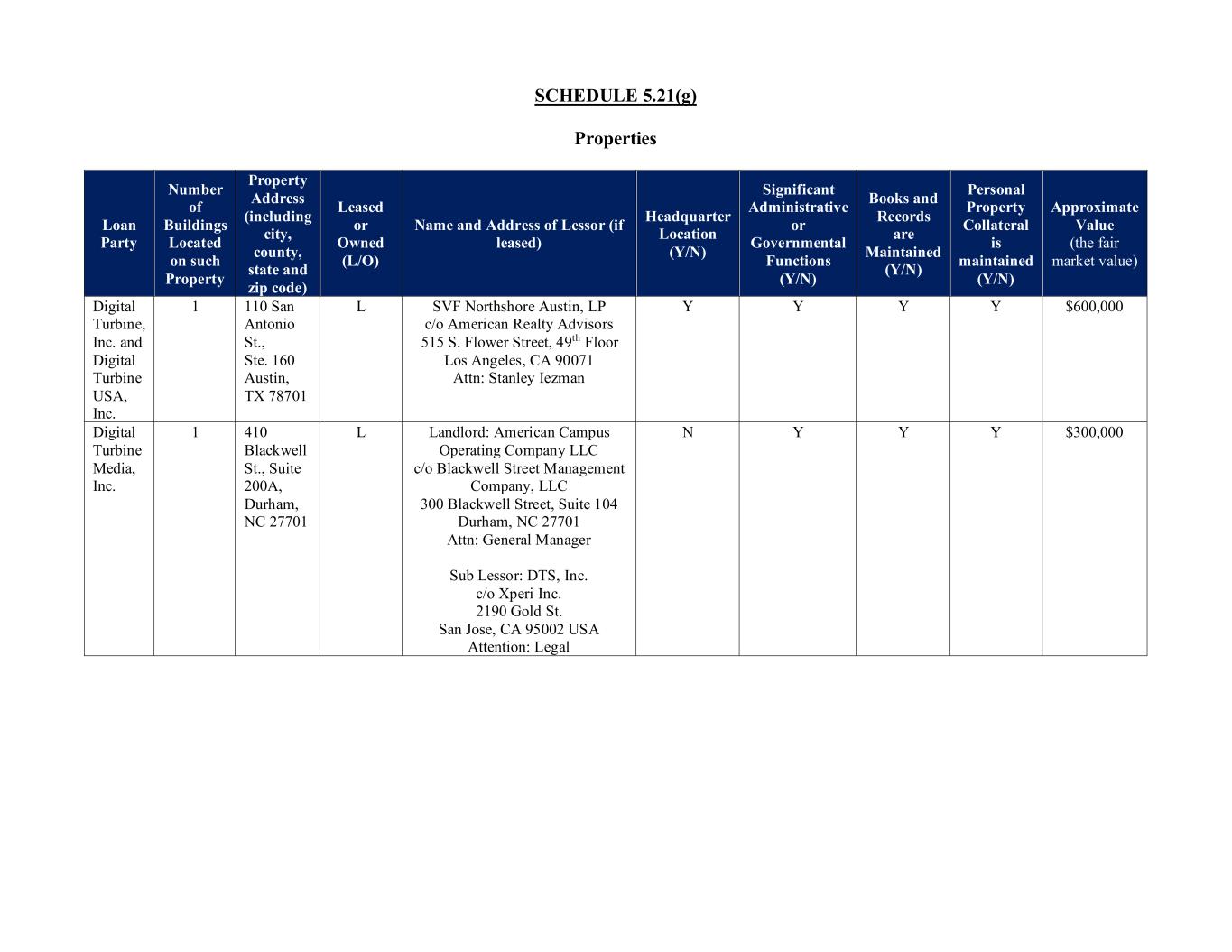 SCHEDULE 5.21(g) Properties Loan Party Number of Buildings Located on such Property Property Address (including city, county, state and zip code) Leased or Owned (L/O) Name and Address of Lessor (if leased) Headquarter Location (Y/N) Significant Administrative or Governmental Functions (Y/N) Books and Records are Maintained (Y/N) Personal Property Collateral is maintained (Y/N) Approximate Value (the fair market value) Digital Turbine, Inc. and Digital Turbine USA, Inc. 1 110 San Antonio St., Ste. 160 Austin, TX 78701 L SVF Northshore Austin, LP c/o American Realty Advisors 515 S. Flower Street, 49th Floor Los Angeles, CA 90071 Attn: Stanley Iezman Y Y Y Y $600,000 Digital Turbine Media, Inc. 1 410 Blackwell St., Suite 200A, Durham, NC 27701 L Landlord: American Campus Operating Company LLC c/o Blackwell Street Management Company, LLC 300 Blackwell Street, Suite 104 Durham, NC 27701 Attn: General Manager Sub Lessor: DTS, Inc. c/o Xperi Inc. 2190 Gold St. San Jose, CA 95002 USA Attention: Legal N Y Y Y $300,000