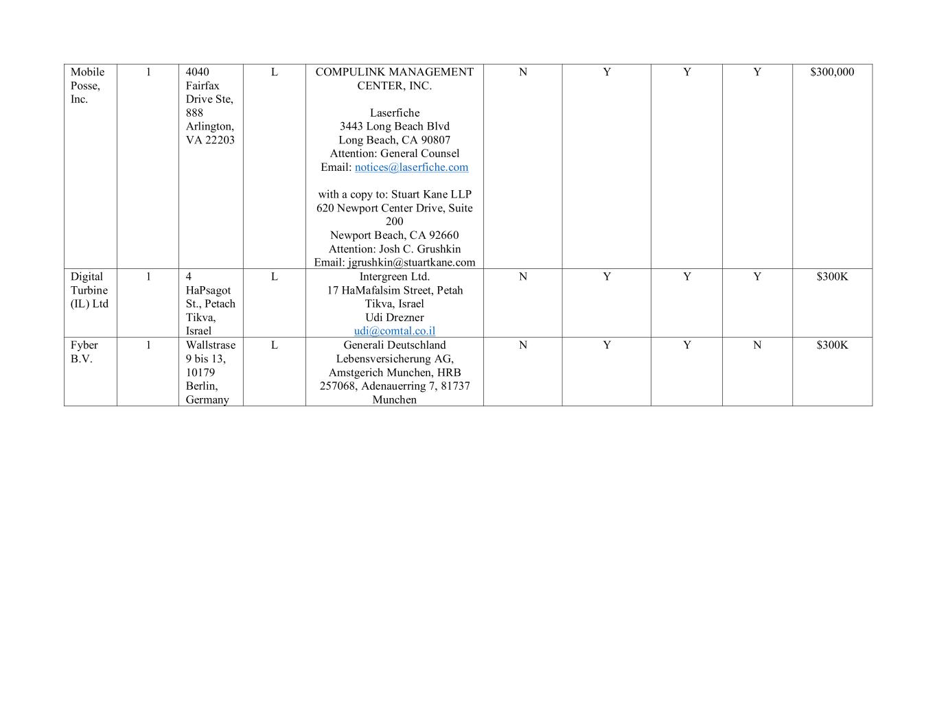 Mobile Posse, Inc. 1 4040 Fairfax Drive Ste, 888 Arlington, VA 22203 L COMPULINK MANAGEMENT CENTER, INC. Laserfiche 3443 Long Beach Blvd Long Beach, CA 90807 Attention: General Counsel Email: notices@laserfiche.com with a copy to: Stuart Kane LLP 620 Newport Center Drive, Suite 200 Newport Beach, CA 92660 Attention: Josh C. Grushkin Email: jgrushkin@stuartkane.com N Y Y Y $300,000 Digital Turbine (IL) Ltd 1 4 HaPsagot St., Petach Tikva, Israel L Intergreen Ltd. 17 HaMafalsim Street, Petah Tikva, Israel Udi Drezner udi@comtal.co.il N Y Y Y $300K Fyber B.V. 1 Wallstrase 9 bis 13, 10179 Berlin, Germany L Generali Deutschland Lebensversicherung AG, Amstgerich Munchen, HRB 257068, Adenauerring 7, 81737 Munchen N Y Y N $300K