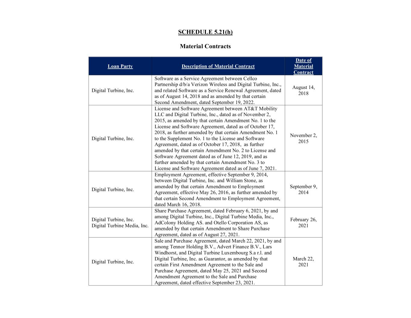 SCHEDULE 5.21(h) Material Contracts Loan Party Description of Material Contract Date of Material Contract Digital Turbine, Inc. Software as a Service Agreement between Cellco Partnership d/b/a Verizon Wireless and Digital Turbine, Inc., and related Software as a Service Renewal Agreement, dated as of August 14, 2018 and as amended by that certain Second Amendment, dated September 19, 2022. August 14, 2018 Digital Turbine, Inc. License and Software Agreement between AT&T Mobility LLC and Digital Turbine, Inc., dated as of November 2, 2015, as amended by that certain Amendment No. 1 to the License and Software Agreement, dated as of October 17, 2018, as further amended by that certain Amendment No. 1 to the Supplement No. 1 to the License and Software Agreement, dated as of October 17, 2018, as further amended by that certain Amendment No. 2 to License and Software Agreement dated as of June 12, 2019, and as further amended by that certain Amendment No. 3 to License and Software Agreement dated as of June 7, 2021. November 2, 2015 Digital Turbine, Inc. Employment Agreement, effective September 9, 2014, between Digital Turbine, Inc. and William Stone, as amended by that certain Amendment to Employment Agreement, effective May 26, 2016, as further amended by that certain Second Amendment to Employment Agreement, dated March 16, 2018. September 9, 2014 Digital Turbine, Inc. Digital Turbine Media, Inc. Share Purchase Agreement, dated February 6, 2021, by and among Digital Turbine, Inc., Digital Turbine Media, Inc., AdColony Holding AS. and Otello Corporation AS, as amended by that certain Amendment to Share Purchase Agreement, dated as of August 27, 2021. February 26, 2021 Digital Turbine, Inc. Sale and Purchase Agreement, dated March 22, 2021, by and among Tennor Holding B.V., Advert Finance B.V., Lars Windhorst, and Digital Turbine Luxembourg S.a r.l. and Digital Turbine, Inc. as Guarantor, as amended by that certain First Amendment Agreement to the Sale and Purchase Agreement, dated May 25, 2021 and Second Amendment Agreement to the Sale and Purchase Agreement, dated effective September 23, 2021. March 22, 2021