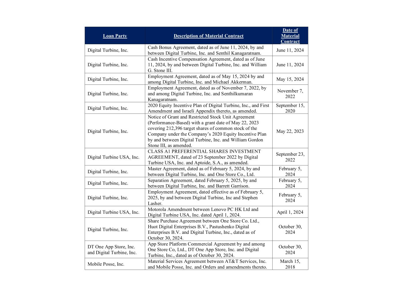 Loan Party Description of Material Contract Date of Material Contract Digital Turbine, Inc. Cash Bonus Agreement, dated as of June 11, 2024, by and between Digital Turbine, Inc. and Senthil Kanagaratnam. June 11, 2024 Digital Turbine, Inc. Cash Incentive Compensation Agreement, dated as of June 11, 2024, by and between Digital Turbine, Inc. and William G. Stone III. June 11, 2024 Digital Turbine, Inc. Employment Agreement, dated as of May 15, 2024 by and among Digital Turbine, Inc. and Michael Akkerman. May 15, 2024 Digital Turbine, Inc. Employment Agreement, dated as of November 7, 2022, by and among Digital Turbine, Inc. and Senthilkumaran Kanagaratnam. November 7, 2022 Digital Turbine, Inc. 2020 Equity Incentive Plan of Digital Turbine, Inc., and First Amendment and Israeli Appendix thereto, as amended. September 15, 2020 Digital Turbine, Inc. Notice of Grant and Restricted Stock Unit Agreement (Performance-Based) with a grant date of May 22, 2023 covering 212,396 target shares of common stock of the Company under the Company’s 2020 Equity Incentive Plan by and between Digital Turbine, Inc. and William Gordon Stone III, as amended. May 22, 2023 Digital Turbine USA, Inc. CLASS A1 PREFERENTIAL SHARES INVESTMENT AGREEMENT, dated of 23 September 2022 by Digital Turbine USA, Inc. and Aptoide, S.A., as amended. September 23, 2022 Digital Turbine, Inc. Master Agreement, dated as of February 5, 2024, by and between Digital Turbine, Inc. and One Store Co., Ltd. February 5, 2024 Digital Turbine, Inc. Separation Agreement, dated February 5, 2025, by and between Digital Turbine, Inc. and Barrett Garrison. February 5, 2024 Digital Turbine, Inc. Employment Agreement, dated effective as of February 5, 2025, by and between Digital Turbine, Inc and Stephen Lasher. February 5, 2024 Digital Turbine USA, Inc. Motorola Amendment between Lenovo PC HK Ltd and Digital Turbine USA, Inc. dated April 1, 2024. April 1, 2024 Digital Turbine, Inc. Share Purchase Agreement between One Store Co. Ltd., Huot Digital Enterprises B.V., Pastushenko Digital Enterprises B.V. and Digital Turbine, Inc., dated as of October 30, 2024. October 30, 2024 DT One App Store, Inc. and Digital Turbine, Inc. App Store Platform Commercial Agreement by and among One Store Co, Ltd., DT One App Store, Inc. and Digital Turbine, Inc., dated as of October 30, 2024. October 30, 2024 Mobile Posse, Inc. Material Services Agreement between AT&T Services, Inc. and Mobile Posse, Inc. and Orders and amendments thereto. March 15, 2018
