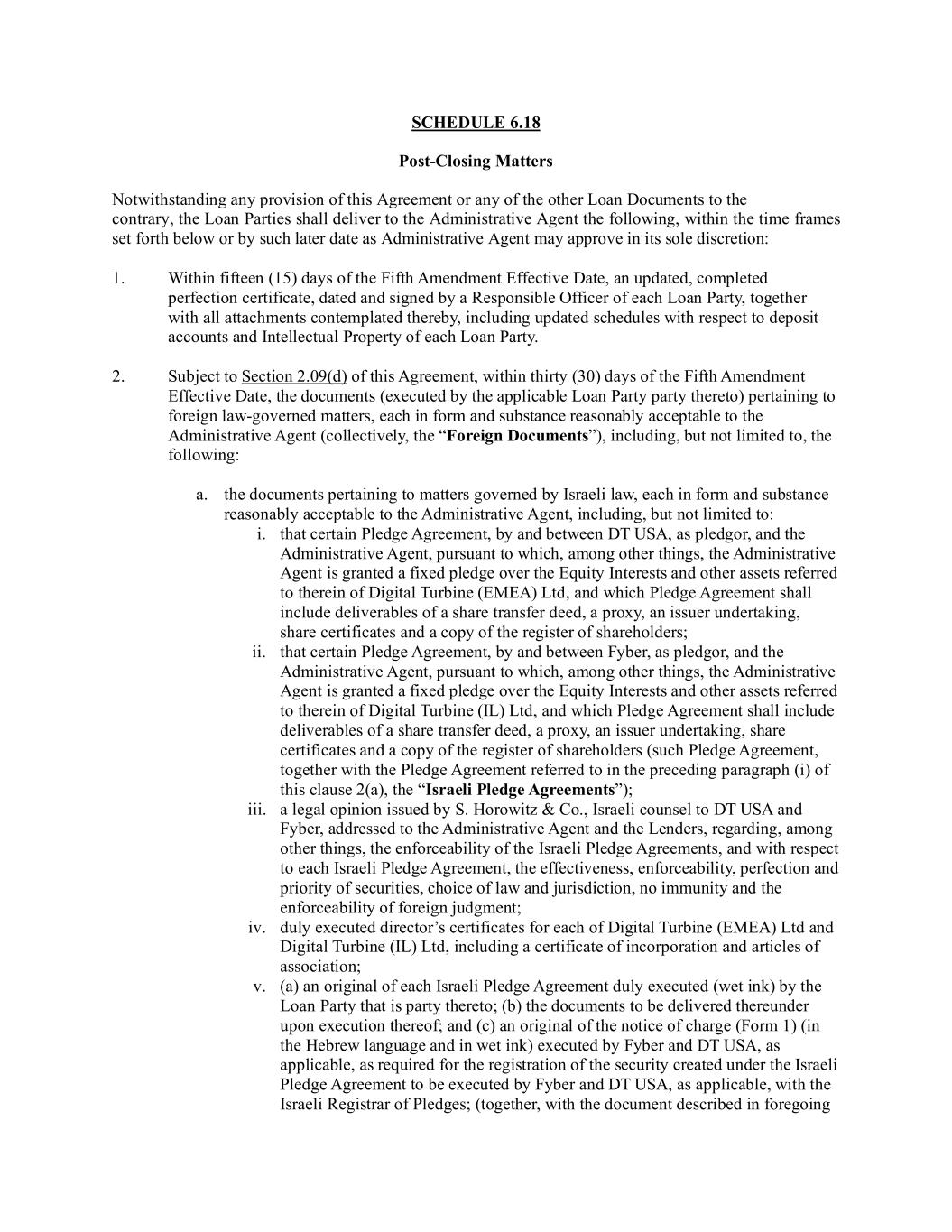 SCHEDULE 6.18 Post-Closing Matters Notwithstanding any provision of this Agreement or any of the other Loan Documents to the contrary, the Loan Parties shall deliver to the Administrative Agent the following, within the time frames set forth below or by such later date as Administrative Agent may approve in its sole discretion: 1. Within fifteen (15) days of the Fifth Amendment Effective Date, an updated, completed perfection certificate, dated and signed by a Responsible Officer of each Loan Party, together with all attachments contemplated thereby, including updated schedules with respect to deposit accounts and Intellectual Property of each Loan Party. 2. Subject to Section 2.09(d) of this Agreement, within thirty (30) days of the Fifth Amendment Effective Date, the documents (executed by the applicable Loan Party party thereto) pertaining to foreign law-governed matters, each in form and substance reasonably acceptable to the Administrative Agent (collectively, the “Foreign Documents”), including, but not limited to, the following: a. the documents pertaining to matters governed by Israeli law, each in form and substance reasonably acceptable to the Administrative Agent, including, but not limited to: i. that certain Pledge Agreement, by and between DT USA, as pledgor, and the Administrative Agent, pursuant to which, among other things, the Administrative Agent is granted a fixed pledge over the Equity Interests and other assets referred to therein of Digital Turbine (EMEA) Ltd, and which Pledge Agreement shall include deliverables of a share transfer deed, a proxy, an issuer undertaking, share certificates and a copy of the register of shareholders; ii. that certain Pledge Agreement, by and between Fyber, as pledgor, and the Administrative Agent, pursuant to which, among other things, the Administrative Agent is granted a fixed pledge over the Equity Interests and other assets referred to therein of Digital Turbine (IL) Ltd, and which Pledge Agreement shall include deliverables of a share transfer deed, a proxy, an issuer undertaking, share certificates and a copy of the register of shareholders (such Pledge Agreement, together with the Pledge Agreement referred to in the preceding paragraph (i) of this clause 2(a), the “Israeli Pledge Agreements”); iii. a legal opinion issued by S. Horowitz & Co., Israeli counsel to DT USA and Fyber, addressed to the Administrative Agent and the Lenders, regarding, among other things, the enforceability of the Israeli Pledge Agreements, and with respect to each Israeli Pledge Agreement, the effectiveness, enforceability, perfection and priority of securities, choice of law and jurisdiction, no immunity and the enforceability of foreign judgment; iv. duly executed director’s certificates for each of Digital Turbine (EMEA) Ltd and Digital Turbine (IL) Ltd, including a certificate of incorporation and articles of association; v. (a) an original of each Israeli Pledge Agreement duly executed (wet ink) by the Loan Party that is party thereto; (b) the documents to be delivered thereunder upon execution thereof; and (c) an original of the notice of charge (Form 1) (in the Hebrew language and in wet ink) executed by Fyber and DT USA, as applicable, as required for the registration of the security created under the Israeli Pledge Agreement to be executed by Fyber and DT USA, as applicable, with the Israeli Registrar of Pledges; (together, with the document described in foregoing