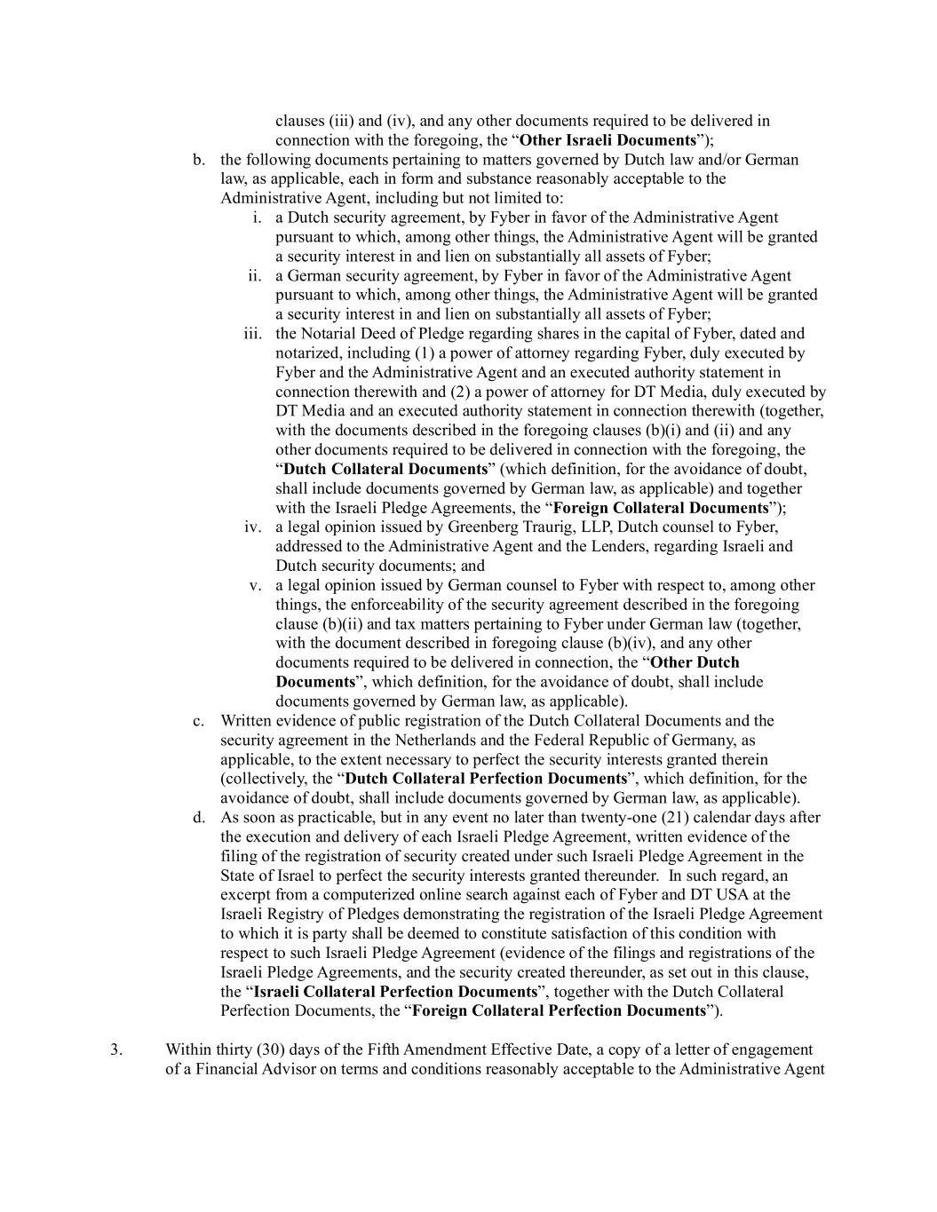 clauses (iii) and (iv), and any other documents required to be delivered in connection with the foregoing, the “Other Israeli Documents”); b. the following documents pertaining to matters governed by Dutch law and/or German law, as applicable, each in form and substance reasonably acceptable to the Administrative Agent, including but not limited to: i. a Dutch security agreement, by Fyber in favor of the Administrative Agent pursuant to which, among other things, the Administrative Agent will be granted a security interest in and lien on substantially all assets of Fyber; ii. a German security agreement, by Fyber in favor of the Administrative Agent pursuant to which, among other things, the Administrative Agent will be granted a security interest in and lien on substantially all assets of Fyber; iii. the Notarial Deed of Pledge regarding shares in the capital of Fyber, dated and notarized, including (1) a power of attorney regarding Fyber, duly executed by Fyber and the Administrative Agent and an executed authority statement in connection therewith and (2) a power of attorney for DT Media, duly executed by DT Media and an executed authority statement in connection therewith (together, with the documents described in the foregoing clauses (b)(i) and (ii) and any other documents required to be delivered in connection with the foregoing, the “Dutch Collateral Documents” (which definition, for the avoidance of doubt, shall include documents governed by German law, as applicable) and together with the Israeli Pledge Agreements, the “Foreign Collateral Documents”); iv. a legal opinion issued by Greenberg Traurig, LLP, Dutch counsel to Fyber, addressed to the Administrative Agent and the Lenders, regarding Israeli and Dutch security documents; and v. a legal opinion issued by German counsel to Fyber with respect to, among other things, the enforceability of the security agreement described in the foregoing clause (b)(ii) and tax matters pertaining to Fyber under German law (together, with the document described in foregoing clause (b)(iv), and any other documents required to be delivered in connection, the “Other Dutch Documents”, which definition, for the avoidance of doubt, shall include documents governed by German law, as applicable). c. Written evidence of public registration of the Dutch Collateral Documents and the security agreement in the Netherlands and the Federal Republic of Germany, as applicable, to the extent necessary to perfect the security interests granted therein (collectively, the “Dutch Collateral Perfection Documents”, which definition, for the avoidance of doubt, shall include documents governed by German law, as applicable). d. As soon as practicable, but in any event no later than twenty-one (21) calendar days after the execution and delivery of each Israeli Pledge Agreement, written evidence of the filing of the registration of security created under such Israeli Pledge Agreement in the State of Israel to perfect the security interests granted thereunder. In such regard, an excerpt from a computerized online search against each of Fyber and DT USA at the Israeli Registry of Pledges demonstrating the registration of the Israeli Pledge Agreement to which it is party shall be deemed to constitute satisfaction of this condition with respect to such Israeli Pledge Agreement (evidence of the filings and registrations of the Israeli Pledge Agreements, and the security created thereunder, as set out in this clause, the “Israeli Collateral Perfection Documents”, together with the Dutch Collateral Perfection Documents, the “Foreign Collateral Perfection Documents”). 3. Within thirty (30) days of the Fifth Amendment Effective Date, a copy of a letter of engagement of a Financial Advisor on terms and conditions reasonably acceptable to the Administrative Agent
