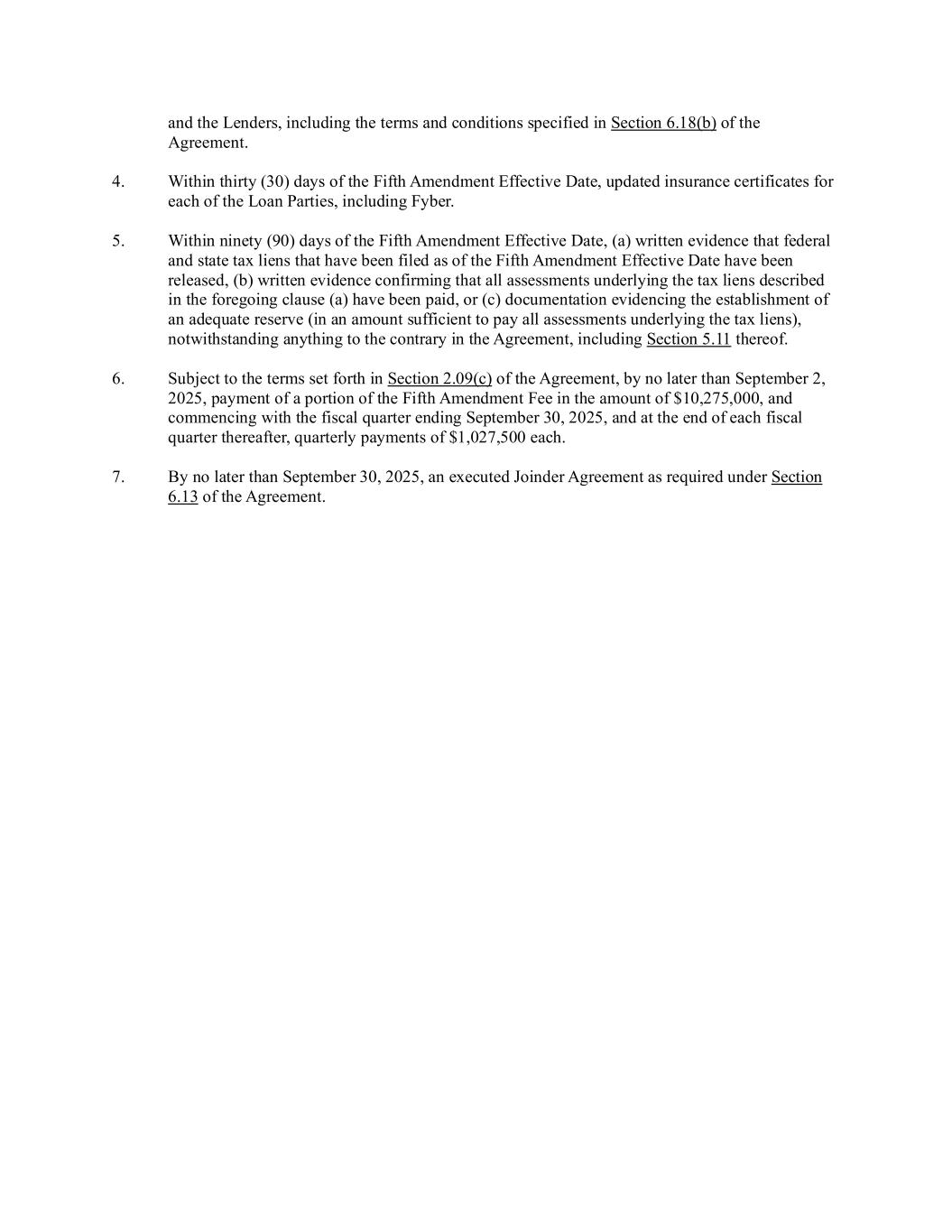 and the Lenders, including the terms and conditions specified in Section 6.18(b) of the Agreement. 4. Within thirty (30) days of the Fifth Amendment Effective Date, updated insurance certificates for each of the Loan Parties, including Fyber. 5. Within ninety (90) days of the Fifth Amendment Effective Date, (a) written evidence that federal and state tax liens that have been filed as of the Fifth Amendment Effective Date have been released, (b) written evidence confirming that all assessments underlying the tax liens described in the foregoing clause (a) have been paid, or (c) documentation evidencing the establishment of an adequate reserve (in an amount sufficient to pay all assessments underlying the tax liens), notwithstanding anything to the contrary in the Agreement, including Section 5.11 thereof. 6. Subject to the terms set forth in Section 2.09(c) of the Agreement, by no later than September 2, 2025, payment of a portion of the Fifth Amendment Fee in the amount of $10,275,000, and commencing with the fiscal quarter ending September 30, 2025, and at the end of each fiscal quarter thereafter, quarterly payments of $1,027,500 each. 7. By no later than September 30, 2025, an executed Joinder Agreement as required under Section 6.13 of the Agreement.