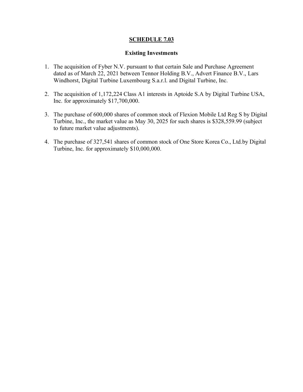 SCHEDULE 7.03 Existing Investments 1. The acquisition of Fyber N.V. pursuant to that certain Sale and Purchase Agreement dated as of March 22, 2021 between Tennor Holding B.V., Advert Finance B.V., Lars Windhorst, Digital Turbine Luxembourg S.a.r.l. and Digital Turbine, Inc. 2. The acquisition of 1,172,224 Class A1 interests in Aptoide S.A by Digital Turbine USA, Inc. for approximately $17,700,000. 3. The purchase of 600,000 shares of common stock of Flexion Mobile Ltd Reg S by Digital Turbine, Inc., the market value as May 30, 2025 for such shares is $328,559.99 (subject to future market value adjustments). 4. The purchase of 327,541 shares of common stock of One Store Korea Co., Ltd.by Digital Turbine, Inc. for approximately $10,000,000.
