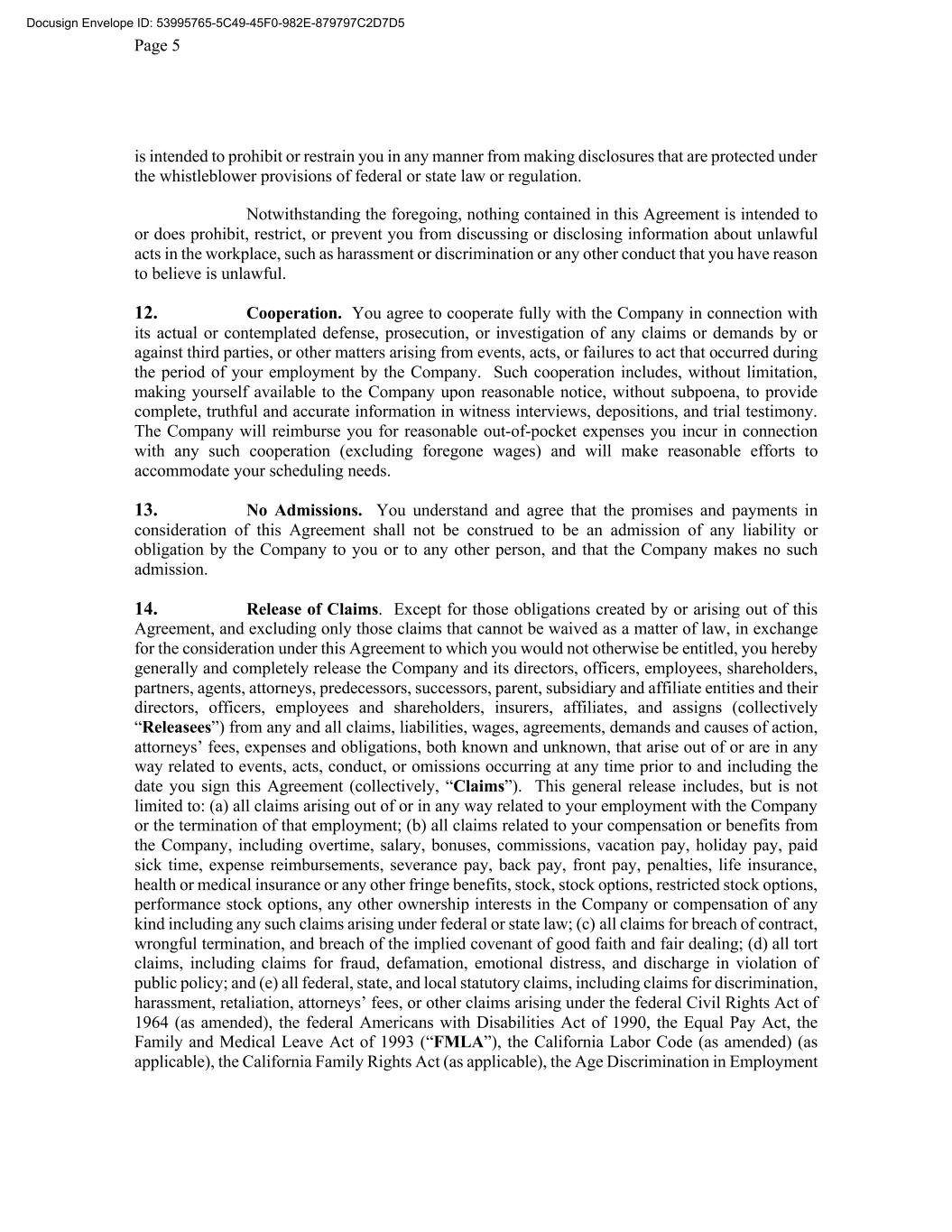 Page 5 is intended to prohibit or restrain you in any manner from making disclosures that are protected under the whistleblower provisions of federal or state law or regulation. Notwithstanding the foregoing, nothing contained in this Agreement is intended to or does prohibit, restrict, or prevent you from discussing or disclosing information about unlawful acts in the workplace, such as harassment or discrimination or any other conduct that you have reason to believe is unlawful. 12. Cooperation. You agree to cooperate fully with the Company in connection with its actual or contemplated defense, prosecution, or investigation of any claims or demands by or against third parties, or other matters arising from events, acts, or failures to act that occurred during the period of your employment by the Company. Such cooperation includes, without limitation, making yourself available to the Company upon reasonable notice, without subpoena, to provide complete, truthful and accurate information in witness interviews, depositions, and trial testimony. The Company will reimburse you for reasonable out-of-pocket expenses you incur in connection with any such cooperation (excluding foregone wages) and will make reasonable efforts to accommodate your scheduling needs. 13. No Admissions. You understand and agree that the promises and payments in consideration of this Agreement shall not be construed to be an admission of any liability or obligation by the Company to you or to any other person, and that the Company makes no such admission. 14. Release of Claims. Except for those obligations created by or arising out of this Agreement, and excluding only those claims that cannot be waived as a matter of law, in exchange for the consideration under this Agreement to which you would not otherwise be entitled, you hereby generally and completely release the Company and its directors, officers, employees, shareholders, partners, agents, attorneys, predecessors, successors, parent, subsidiary and affiliate entities and their directors, officers, employees and shareholders, insurers, affiliates, and assigns (collectively “Releasees”) from any and all claims, liabilities, wages, agreements, demands and causes of action, attorneys’ fees, expenses and obligations, both known and unknown, that arise out of or are in any way related to events, acts, conduct, or omissions occurring at any time prior to and including the date you sign this Agreement (collectively, “Claims”). This general release includes, but is not limited to: (a) all claims arising out of or in any way related to your employment with the Company or the termination of that employment; (b) all claims related to your compensation or benefits from the Company, including overtime, salary, bonuses, commissions, vacation pay, holiday pay, paid sick time, expense reimbursements, severance pay, back pay, front pay, penalties, life insurance, health or medical insurance or any other fringe benefits, stock, stock options, restricted stock options, performance stock options, any other ownership interests in the Company or compensation of any kind including any such claims arising under federal or state law; (c) all claims for breach of contract, wrongful termination, and breach of the implied covenant of good faith and fair dealing; (d) all tort claims, including claims for fraud, defamation, emotional distress, and discharge in violation of public policy; and (e) all federal, state, and local statutory claims, including claims for discrimination, harassment, retaliation, attorneys’ fees, or other claims arising under the federal Civil Rights Act of 1964 (as amended), the federal Americans with Disabilities Act of 1990, the Equal Pay Act, the Family and Medical Leave Act of 1993 (“FMLA”), the California Labor Code (as amended) (as applicable), the California Family Rights Act (as applicable), the Age Discrimination in Employment Docusign Envelope ID: 53995765-5C49-45F0-982E-879797C2D7D5