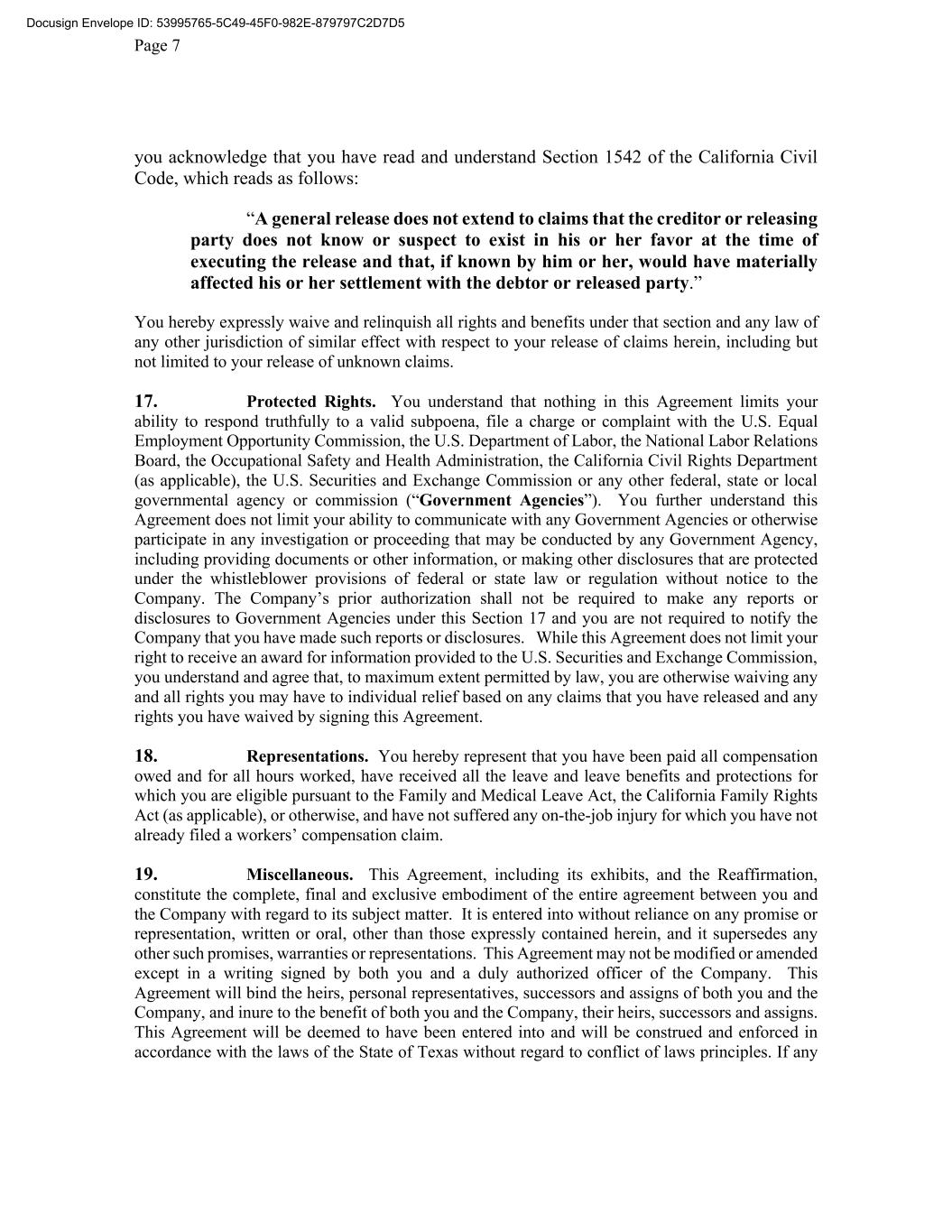 Page 7 you acknowledge that you have read and understand Section 1542 of the California Civil Code, which reads as follows: “A general release does not extend to claims that the creditor or releasing party does not know or suspect to exist in his or her favor at the time of executing the release and that, if known by him or her, would have materially affected his or her settlement with the debtor or released party.” You hereby expressly waive and relinquish all rights and benefits under that section and any law of any other jurisdiction of similar effect with respect to your release of claims herein, including but not limited to your release of unknown claims. 17. Protected Rights. You understand that nothing in this Agreement limits your ability to respond truthfully to a valid subpoena, file a charge or complaint with the U.S. Equal Employment Opportunity Commission, the U.S. Department of Labor, the National Labor Relations Board, the Occupational Safety and Health Administration, the California Civil Rights Department (as applicable), the U.S. Securities and Exchange Commission or any other federal, state or local governmental agency or commission (“Government Agencies”). You further understand this Agreement does not limit your ability to communicate with any Government Agencies or otherwise participate in any investigation or proceeding that may be conducted by any Government Agency, including providing documents or other information, or making other disclosures that are protected under the whistleblower provisions of federal or state law or regulation without notice to the Company. The Company’s prior authorization shall not be required to make any reports or disclosures to Government Agencies under this Section 17 and you are not required to notify the Company that you have made such reports or disclosures. While this Agreement does not limit your right to receive an award for information provided to the U.S. Securities and Exchange Commission, you understand and agree that, to maximum extent permitted by law, you are otherwise waiving any and all rights you may have to individual relief based on any claims that you have released and any rights you have waived by signing this Agreement. 18. Representations. You hereby represent that you have been paid all compensation owed and for all hours worked, have received all the leave and leave benefits and protections for which you are eligible pursuant to the Family and Medical Leave Act, the California Family Rights Act (as applicable), or otherwise, and have not suffered any on-the-job injury for which you have not already filed a workers’ compensation claim. 19. Miscellaneous. This Agreement, including its exhibits, and the Reaffirmation, constitute the complete, final and exclusive embodiment of the entire agreement between you and the Company with regard to its subject matter. It is entered into without reliance on any promise or representation, written or oral, other than those expressly contained herein, and it supersedes any other such promises, warranties or representations. This Agreement may not be modified or amended except in a writing signed by both you and a duly authorized officer of the Company. This Agreement will bind the heirs, personal representatives, successors and assigns of both you and the Company, and inure to the benefit of both you and the Company, their heirs, successors and assigns. This Agreement will be deemed to have been entered into and will be construed and enforced in accordance with the laws of the State of Texas without regard to conflict of laws principles. If any Docusign Envelope ID: 53995765-5C49-45F0-982E-879797C2D7D5