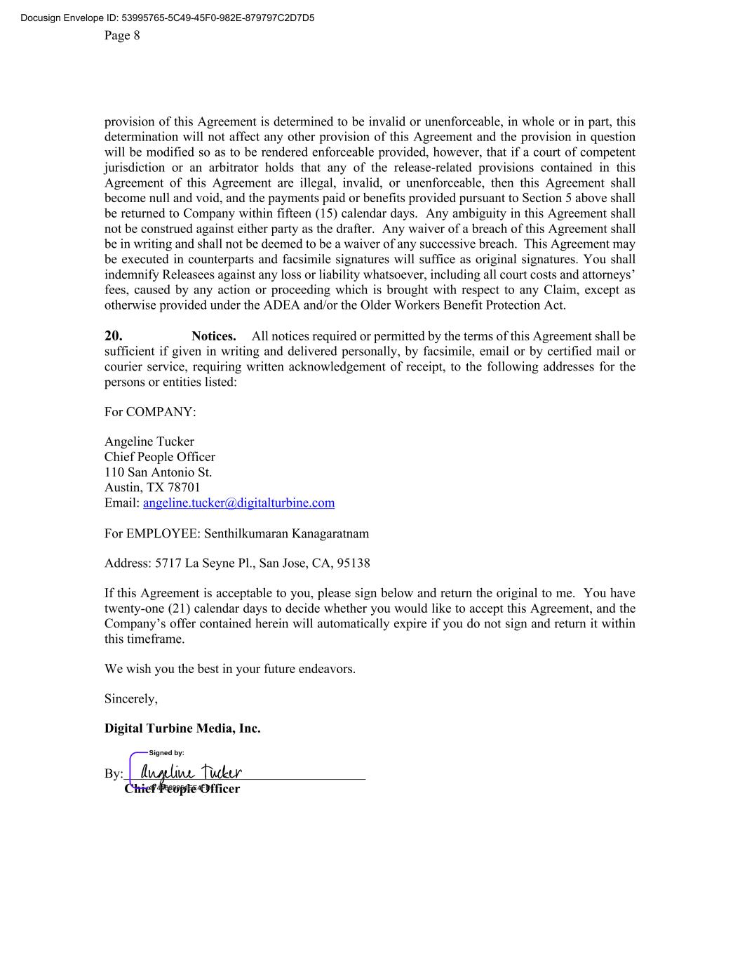 Page 8 provision of this Agreement is determined to be invalid or unenforceable, in whole or in part, this determination will not affect any other provision of this Agreement and the provision in question will be modified so as to be rendered enforceable provided, however, that if a court of competent jurisdiction or an arbitrator holds that any of the release-related provisions contained in this Agreement of this Agreement are illegal, invalid, or unenforceable, then this Agreement shall become null and void, and the payments paid or benefits provided pursuant to Section 5 above shall be returned to Company within fifteen (15) calendar days. Any ambiguity in this Agreement shall not be construed against either party as the drafter. Any waiver of a breach of this Agreement shall be in writing and shall not be deemed to be a waiver of any successive breach. This Agreement may be executed in counterparts and facsimile signatures will suffice as original signatures. You shall indemnify Releasees against any loss or liability whatsoever, including all court costs and attorneys’ fees, caused by any action or proceeding which is brought with respect to any Claim, except as otherwise provided under the ADEA and/or the Older Workers Benefit Protection Act. 20. Notices. All notices required or permitted by the terms of this Agreement shall be sufficient if given in writing and delivered personally, by facsimile, email or by certified mail or courier service, requiring written acknowledgement of receipt, to the following addresses for the persons or entities listed: For COMPANY: Angeline Tucker Chief People Officer 110 San Antonio St. Austin, TX 78701 Email: angeline.tucker@digitalturbine.com For EMPLOYEE: Senthilkumaran Kanagaratnam Address: 5717 La Seyne Pl., San Jose, CA, 95138 If this Agreement is acceptable to you, please sign below and return the original to me. You have twenty-one (21) calendar days to decide whether you would like to accept this Agreement, and the Company’s offer contained herein will automatically expire if you do not sign and return it within this timeframe. We wish you the best in your future endeavors. Sincerely, Digital Turbine Media, Inc. By: Chief People Officer Docusign Envelope ID: 53995765-5C49-45F0-982E-879797C2D7D5