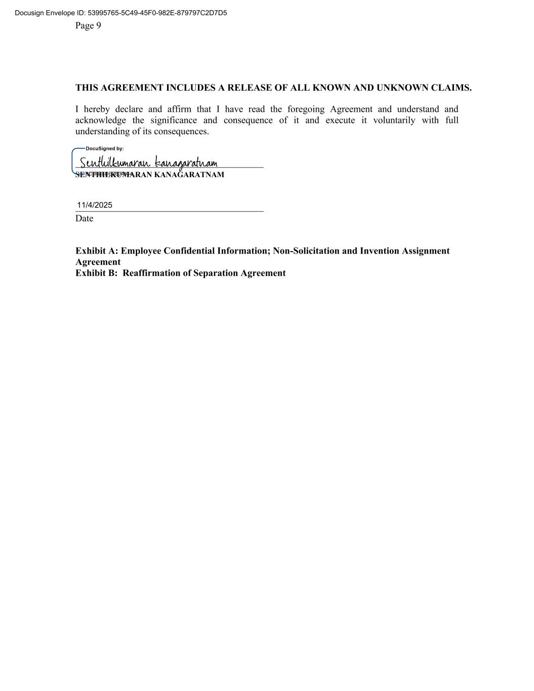 Page 9 THIS AGREEMENT INCLUDES A RELEASE OF ALL KNOWN AND UNKNOWN CLAIMS. I hereby declare and affirm that I have read the foregoing Agreement and understand and acknowledge the significance and consequence of it and execute it voluntarily with full understanding of its consequences. SENTHILKUMARAN KANAGARATNAM Date Exhibit A: Employee Confidential Information; Non-Solicitation and Invention Assignment Agreement Exhibit B: Reaffirmation of Separation Agreement Docusign Envelope ID: 53995765-5C49-45F0-982E-879797C2D7D5 11/4/2025