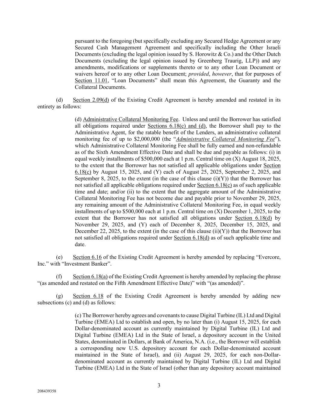 3 208439358 pursuant to the foregoing (but specifically excluding any Secured Hedge Agreement or any Secured Cash Management Agreement and specifically including the Other Israeli Documents (excluding the legal opinion issued by S. Horowitz & Co.) and the Other Dutch Documents (excluding the legal opinion issued by Greenberg Traurig, LLP)) and any amendments, modifications or supplements thereto or to any other Loan Document or waivers hereof or to any other Loan Document; provided, however, that for purposes of Section 11.01, “Loan Documents” shall mean this Agreement, the Guaranty and the Collateral Documents. (d) Section 2.09(d) of the Existing Credit Agreement is hereby amended and restated in its entirety as follows: (d) Administrative Collateral Monitoring Fee. Unless and until the Borrower has satisfied all obligations required under Sections 6.18(c) and (d), the Borrower shall pay to the Administrative Agent, for the ratable benefit of the Lenders, an administrative collateral monitoring fee of up to $2,000,000 (the “Administrative Collateral Monitoring Fee”), which Administrative Collateral Monitoring Fee shall be fully earned and non-refundable as of the Sixth Amendment Effective Date and shall be due and payable as follows: (i) in equal weekly installments of $500,000 each at 1 p.m. Central time on (X) August 18, 2025, to the extent that the Borrower has not satisfied all applicable obligations under Section 6.18(c) by August 15, 2025, and (Y) each of August 25, 2025, September 2, 2025, and September 8, 2025, to the extent (in the case of this clause (i)(Y)) that the Borrower has not satisfied all applicable obligations required under Section 6.18(c) as of such applicable time and date; and/or (ii) to the extent that the aggregate amount of the Administrative Collateral Monitoring Fee has not become due and payable prior to November 29, 2025, any remaining amount of the Administrative Collateral Monitoring Fee, in equal weekly installments of up to $500,000 each at 1 p.m. Central time on (X) December 1, 2025, to the extent that the Borrower has not satisfied all obligations under Section 6.18(d) by November 29, 2025, and (Y) each of December 8, 2025, December 15, 2025, and December 22, 2025, to the extent (in the case of this clause (ii)(Y)) that the Borrower has not satisfied all obligations required under Section 6.18(d) as of such applicable time and date. (e) Section 6.16 of the Existing Credit Agreement is hereby amended by replacing “Evercore, Inc.” with “Investment Banker”. (f) Section 6.18(a) of the Existing Credit Agreement is hereby amended by replacing the phrase “(as amended and restated on the Fifth Amendment Effective Date)” with “(as amended)”. (g) Section 6.18 of the Existing Credit Agreement is hereby amended by adding new subsections (c) and (d) as follows: (c) The Borrower hereby agrees and covenants to cause Digital Turbine (IL) Ltd and Digital Turbine (EMEA) Ltd to establish and open, by no later than (i) August 15, 2025, for each Dollar-denominated account as currently maintained by Digital Turbine (IL) Ltd and Digital Turbine (EMEA) Ltd in the State of Israel, a depository account in the United States, denominated in Dollars, at Bank of America, N.A. (i.e., the Borrower will establish a corresponding new U.S. depository account for each Dollar-denominated account maintained in the State of Israel), and (ii) August 29, 2025, for each non-Dollar- denominated account as currently maintained by Digital Turbine (IL) Ltd and Digital Turbine (EMEA) Ltd in the State of Israel (other than any depository account maintained