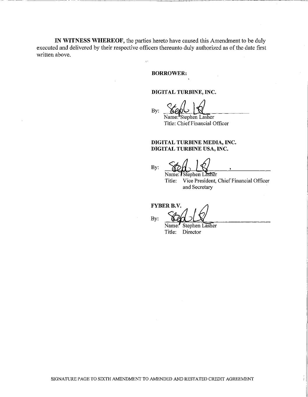 EXECUTION VERSION 1 208439358 SIXTH AMENDMENT TO AMENDED AND RESTATED CREDIT AGREEMENT This SIXTH AMENDMENT TO AMENDED AND RESTATED CREDIT AGREEMENT dated as of August 8, 2025 (this “Amendment”), by and among DIGITAL TURBINE, INC., a Delaware corporation (“Holdings”), DIGITAL TURBINE MEDIA, INC., a Delaware corporation (“DT Media”), DIGITAL TURBINE USA, INC., a Delaware corporation (“DT USA”), FYBER B.V., a Netherlands besloten vennootschap (“Fyber” and, together with Holdings, DT Media and DT USA, collectively or each individually as the context requires, the “Borrower”), the other Loan Parties party hereto, BANK OF AMERICA, N.A., as Administrative Agent and the other Lenders party hereto. RECITALS WHEREAS, reference is made to that certain Amended and Restated Credit Agreement, dated as of April 29, 2021 (as amended by that certain First Amendment dated as of December 29, 2021, that certain Second Amendment dated as of October 26, 2022, that certain Third Amendment dated as of February 5, 2024, that certain Fourth Amendment dated as of August 6, 2024 and that certain Fifth Amendment to Amended and Restated Credit Agreement dated as of June 13, 2025, in each case, among the applicable Loan Parties thereto, Bank of America, N.A., as Administrative Agent and the other Lenders party thereto and as further amended, restated, supplemented or otherwise modified from time to time prior to the date hereof, the “Existing Credit Agreement”), among the Borrower, certain subsidiaries of the Borrower party thereto (the “Guarantors” and, together with the Borrower, the “Loan Parties”), the Lenders party thereto, Bank of America, N.A., as Administrative Agent, Swingline Lender and L/C Issuer, and certain other parties thereto; WHEREAS, the Loan Parties failed to deliver the Foreign Documents by the applicable deadline set forth in Schedule 6.18 in the Existing Credit Agreement, and as a result, pursuant to Section 2.09(d) of the Existing Credit Agreement, the Administrative Collateral Monitoring Fee became due and payable; WHEREAS, the Loan Parties have requested that on the Sixth Amendment Effective Date (as defined below), subject to the terms and conditions set forth in this Amendment, the Existing Credit Agreement be amended as set forth in this Amendment to, among other things, extend and otherwise modify the scope and applicability of the Foreign Documents Deadline, modify the scope and applicability of the Administrative Collateral Monitoring Fee (including a request for the Administrative Agent and the Lenders to waive enforcement and collection of such fee that is due and payable as of the date hereof) and certain other covenants, and to make other changes related to the foregoing; WHEREAS, concurrently with this Amendment, the Loan Parties are executing that certain Second Amendment to Amended and Restated Security and Pledge Agreement (the “Security Agreement Amendment”), dated as of the date hereof, pursuant to which certain provisions of the Security Agreement are being amended; and WHEREAS, the Loan Parties, the Administrative Agent and each Lender have agreed to amend the Existing Credit Agreement subject to the terms and conditions set forth in this Amendment. NOW, THEREFORE, in consideration of the foregoing and for other good and valuable consideration, the receipt and sufficiency of which are hereby acknowledged, the parties hereto hereby agree as follows: SECTION 1. Defined Terms. Capitalized terms used and not otherwise defined herein (including in the recitals hereto) have the meanings assigned to them in the Amended Credit Agreement.