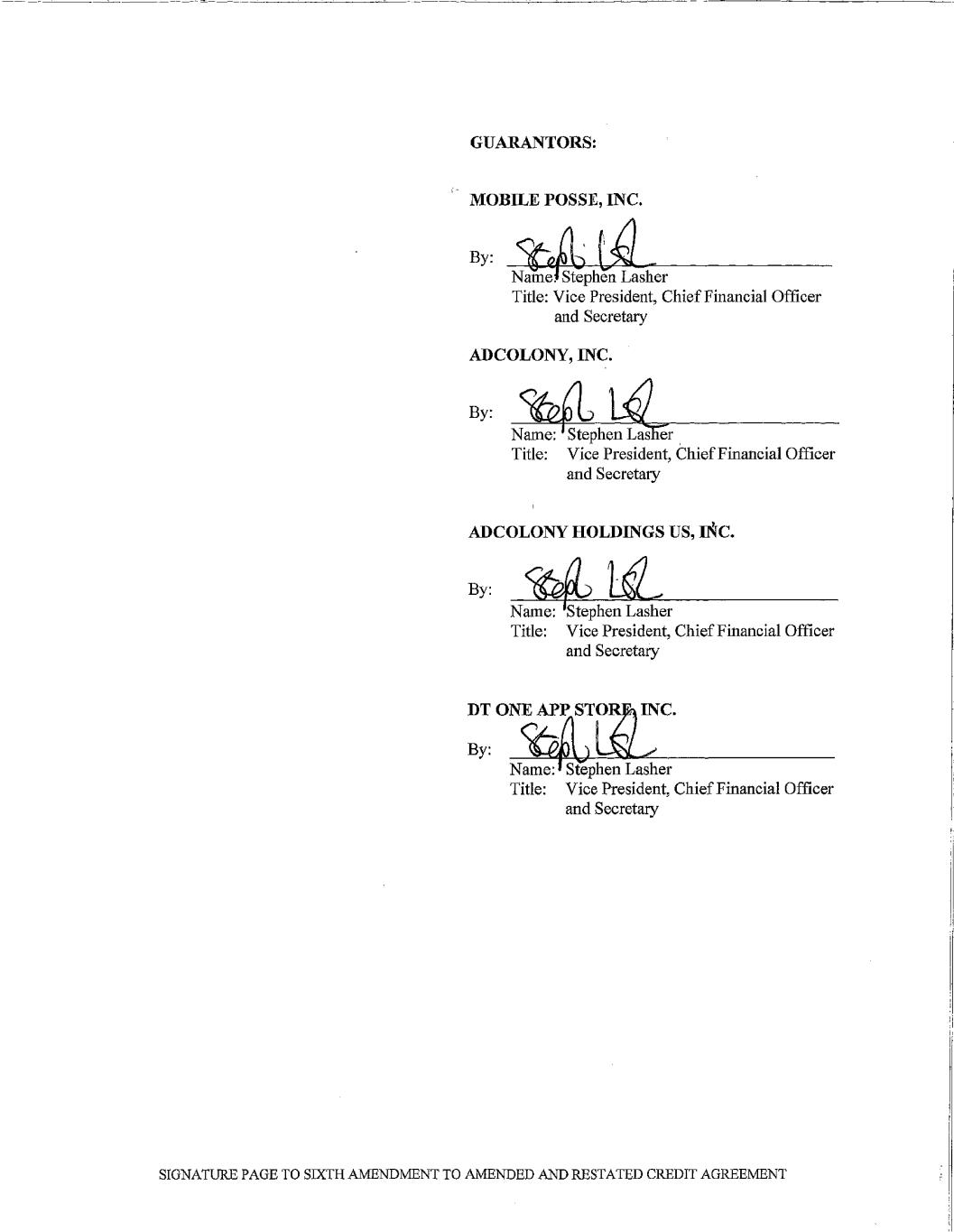 5 208439358 Amended Credit Agreement shall be deemed to refer to the most recent statements furnished pursuant to clauses (a) and (b), respectively, of Section 6.01 of the Existing Credit Agreement and (B) any representation that by its terms is made only as of an earlier date, shall remain true and correct in all material respects (or in the case of such representations and warranties that are subject to a materiality qualification, in all respects) as of such earlier date. SECTION 5. Effectiveness. The effectiveness of this Amendment, including the amendments to the Existing Credit Agreement as set forth in Section 3 hereof, are subject to the satisfaction (or waiver) of the following conditions precedent (the first date on which such conditions precedent are satisfied is referred to as the “Sixth Amendment Effective Date”) as determined by the Administrative Agent in its sole discretion: (a) the Administrative Agent shall have executed a counterpart hereof, and the Administrative Agent shall have received a counterpart hereof signed on behalf of the Borrower, each other Loan Party and each Lender (which, subject to Section 11.18 of the Amended Credit Agreement, may include any Electronic Signatures transmitted by fax, emailed .pdf or any other electronic means that reproduces an image of an actual executed signature page); (b) the Administrative Agent shall have executed the Security Agreement Amendment and shall have received a counterpart thereof signed on behalf of the Grantors (which, subject to Section 11.18 of the Amended Credit Agreement, may include any Electronic Signatures transmitted by fax, emailed .pdf or any other electronic means that reproduces an image of an actual executed signature page); (c) the Administrative Agent shall have received duly executed copies of the Israeli Pledge Agreements and the Other Israeli Documents; (d) the Administrative Agent shall have received the Notarial Deed of Pledge regarding shares in the capital of Fyber, dated and notarized, including (1) a power of attorney regarding Fyber, duly executed by Fyber and the Administrative Agent and an executed authority statement in connection therewith and (2) a power of attorney for DT Media, duly executed by DT Media and an executed authority statement in connection therewith; (e) the Administrative Agent shall have received a legal opinion issued by Greenberg Traurig, LLP, Dutch counsel to Fyber, addressed to the Administrative Agent and the Lenders, regarding Israeli and Dutch security documents to which Fyber is party; (f) the Administrative Agent shall have received such other documents, instruments or agreements as the Administrative Agent may reasonably request in order to effectuate fully the transactions contemplated herein, each duly executed where applicable; and (g) the Administrative Agent shall have received all fees and expenses required to be paid or reimbursed by the Borrower hereunder, under the Existing Credit Agreement or any separate letter agreements to which the Borrower is a party (in the case of expenses, to the extent reflected on a summary invoice), including (i) all fees and expenses of McGuireWoods LLP, Caspi & Co., NautaDutilh New York P.C., and Davis Polk & Wardwell LLP, as counsel (or predecessor counsel) to the Administrative Agent, incurred through the Sixth Amendment Effective Date, in the amount of $471,619.00 and (ii) all fees and expenses of FTI Consulting, Inc., as financial consultant to the Administrative Agent, incurred through the Sixth Amendment Effective Date in the amount of $122,585.50. SECTION 6. Effect of Amendment.