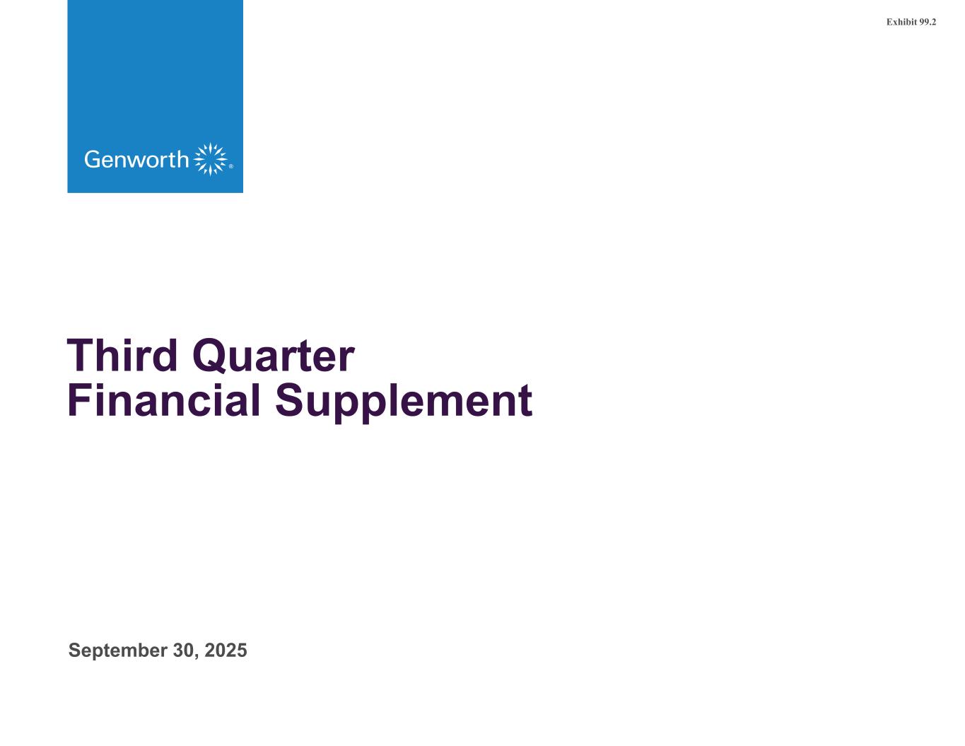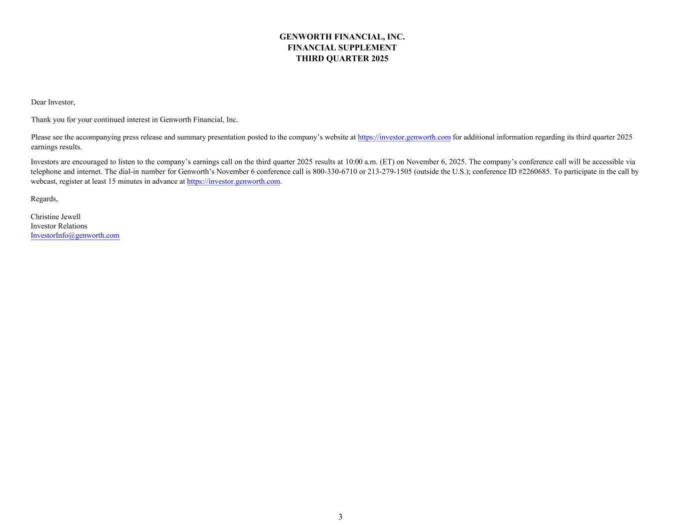 Investors are encouraged to listen to the company’s earnings call on the third quarter 2025 results at 10:00 a.m. (ET) on November 6, 2025. The company’s conference call will be accessible via telephone and internet. The dial-in number for Genworth’s November 6 conference call is 800-330-6710 or 213-279-1505 (outside the U.S.); conference ID #2260685. To participate in the call by webcast, register at least 15 minutes in advance at https://investor.genworth.com. Dear Investor, Thank you for your continued interest in Genworth Financial, Inc. Please see the accompanying press release and summary presentation posted to the company’s website at https://investor.genworth.com for additional information regarding its third quarter 2025 earnings results. Regards, Christine Jewell Investor Relations InvestorInfo@genworth.com GENWORTH FINANCIAL, INC. FINANCIAL SUPPLEMENT THIRD QUARTER 2025 3