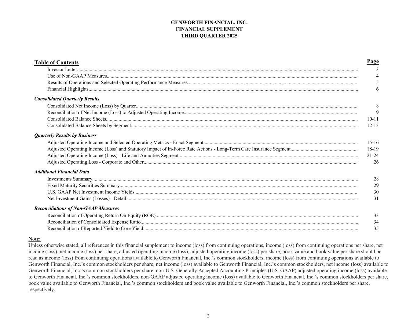 Table of Contents Page Investor Letter.............................................................................................................................................................................................................................. 3 Use of Non-GAAP Measures...................................................................................................................................................................................................... 4 Results of Operations and Selected Operating Performance Measures...................................................................................................................................... 5 Financial Highlights..................................................................................................................................................................................................................... 6 Consolidated Quarterly Results Consolidated Net Income (Loss) by Quarter............................................................................................................................................................................... 8 Reconciliation of Net Income (Loss) to Adjusted Operating Income......................................................................................................................................... 9 Consolidated Balance Sheets....................................................................................................................................................................................................... 10-11 Consolidated Balance Sheets by Segment................................................................................................................................................................................... 12-13 Quarterly Results by Business Adjusted Operating Income and Selected Operating Metrics - Enact Segment.......................................................................................................................... 15-16 Adjusted Operating Income (Loss) and Statutory Impact of In-Force Rate Actions - Long-Term Care Insurance Segment..................................................... 18-19 Adjusted Operating Income (Loss) - Life and Annuities Segment.............................................................................................................................................. 21-24 Adjusted Operating Loss - Corporate and Other......................................................................................................................................................................... 26 Additional Financial Data Investments Summary.................................................................................................................................................................................................................. 28 Fixed Maturity Securities Summary............................................................................................................................................................................................ 29 U.S. GAAP Net Investment Income Yields................................................................................................................................................................................ 30 Net Investment Gains (Losses) - Detail....................................................................................................................................................................................... 31 Reconciliations of Non-GAAP Measures Reconciliation of Operating Return On Equity (ROE)................................................................................................................................................................ 33 Reconciliation of Consolidated Expense Ratio............................................................................................................................................................................ 34 Reconciliation of Reported Yield to Core Yield.......................................................................................................................................................................... 35 GENWORTH FINANCIAL, INC. FINANCIAL SUPPLEMENT THIRD QUARTER 2025 2 Note: Unless otherwise stated, all references in this financial supplement to income (loss) from continuing operations, income (loss) from continuing operations per share, net income (loss), net income (loss) per share, adjusted operating income (loss), adjusted operating income (loss) per share, book value and book value per share should be read as income (loss) from continuing operations available to Genworth Financial, Inc.’s common stockholders, income (loss) from continuing operations available to Genworth Financial, Inc.’s common stockholders per share, net income (loss) available to Genworth Financial, Inc.’s common stockholders, net income (loss) available to Genworth Financial, Inc.’s common stockholders per share, non-U.S. Generally Accepted Accounting Principles (U.S. GAAP) adjusted operating income (loss) available to Genworth Financial, Inc.’s common stockholders, non-GAAP adjusted operating income (loss) available to Genworth Financial, Inc.’s common stockholders per share, book value available to Genworth Financial, Inc.’s common stockholders and book value available to Genworth Financial, Inc.’s common stockholders per share, respectively.