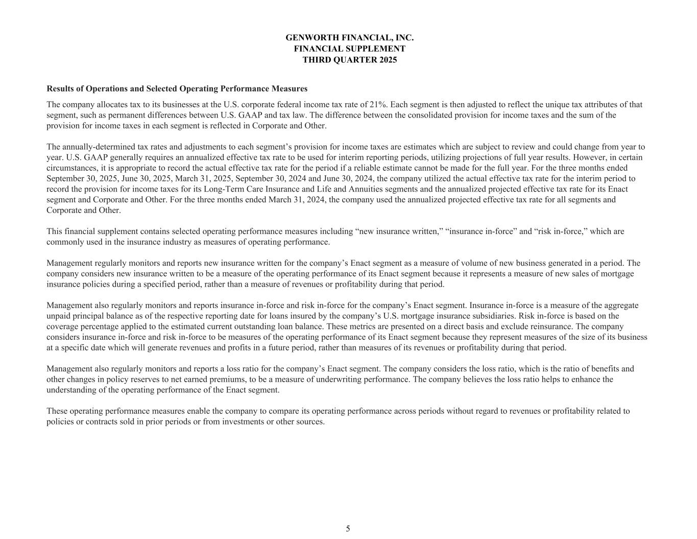GENWORTH FINANCIAL, INC. FINANCIAL SUPPLEMENT THIRD QUARTER 2025 5 Results of Operations and Selected Operating Performance Measures The company allocates tax to its businesses at the U.S. corporate federal income tax rate of 21%. Each segment is then adjusted to reflect the unique tax attributes of that segment, such as permanent differences between U.S. GAAP and tax law. The difference between the consolidated provision for income taxes and the sum of the provision for income taxes in each segment is reflected in Corporate and Other. The annually-determined tax rates and adjustments to each segment’s provision for income taxes are estimates which are subject to review and could change from year to year. U.S. GAAP generally requires an annualized effective tax rate to be used for interim reporting periods, utilizing projections of full year results. However, in certain circumstances, it is appropriate to record the actual effective tax rate for the period if a reliable estimate cannot be made for the full year. For the three months ended September 30, 2025, June 30, 2025, March 31, 2025, September 30, 2024 and June 30, 2024, the company utilized the actual effective tax rate for the interim period to record the provision for income taxes for its Long-Term Care Insurance and Life and Annuities segments and the annualized projected effective tax rate for its Enact segment and Corporate and Other. For the three months ended March 31, 2024, the company used the annualized projected effective tax rate for all segments and Corporate and Other. This financial supplement contains selected operating performance measures including “new insurance written,” “insurance in-force” and “risk in-force,” which are commonly used in the insurance industry as measures of operating performance. Management regularly monitors and reports new insurance written for the company’s Enact segment as a measure of volume of new business generated in a period. The company considers new insurance written to be a measure of the operating performance of its Enact segment because it represents a measure of new sales of mortgage insurance policies during a specified period, rather than a measure of revenues or profitability during that period. Management also regularly monitors and reports insurance in-force and risk in-force for the company’s Enact segment. Insurance in-force is a measure of the aggregate unpaid principal balance as of the respective reporting date for loans insured by the company’s U.S. mortgage insurance subsidiaries. Risk in-force is based on the coverage percentage applied to the estimated current outstanding loan balance. These metrics are presented on a direct basis and exclude reinsurance. The company considers insurance in-force and risk in-force to be measures of the operating performance of its Enact segment because they represent measures of the size of its business at a specific date which will generate revenues and profits in a future period, rather than measures of its revenues or profitability during that period. Management also regularly monitors and reports a loss ratio for the company’s Enact segment. The company considers the loss ratio, which is the ratio of benefits and other changes in policy reserves to net earned premiums, to be a measure of underwriting performance. The company believes the loss ratio helps to enhance the understanding of the operating performance of the Enact segment. These operating performance measures enable the company to compare its operating performance across periods without regard to revenues or profitability related to policies or contracts sold in prior periods or from investments or other sources.