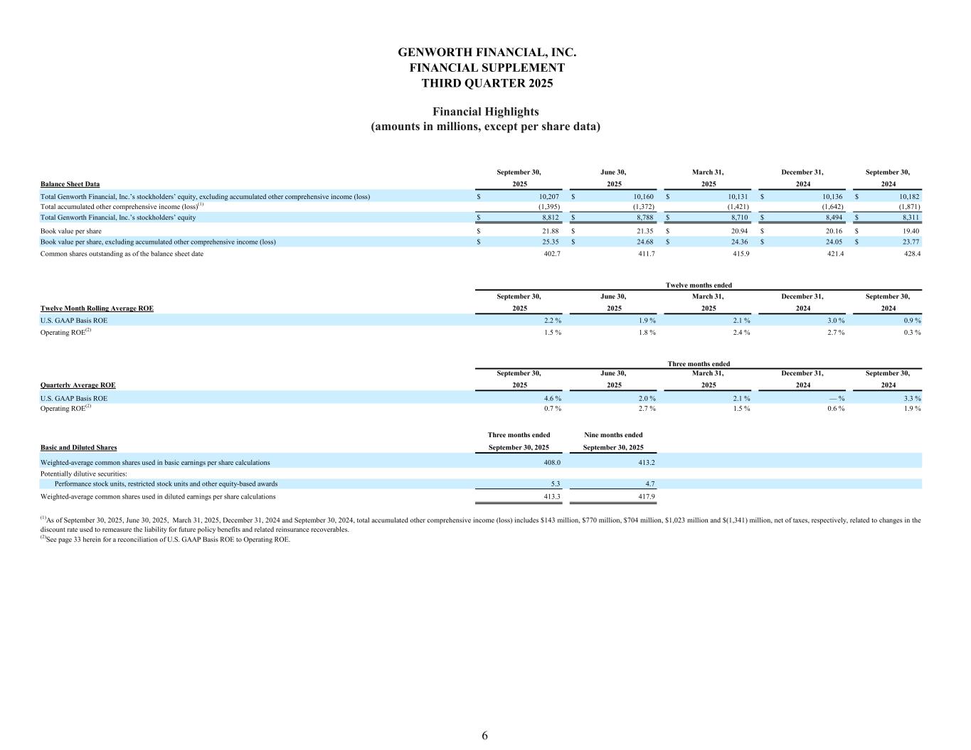 September 30, June 30, March 31, December 31, September 30, Balance Sheet Data 2025 2025 2025 2024 2024 Total Genworth Financial, Inc.’s stockholders’ equity, excluding accumulated other comprehensive income (loss) $ 10,207 $ 10,160 $ 10,131 $ 10,136 $ 10,182 Total accumulated other comprehensive income (loss)(1) (1,395) (1,372) (1,421) (1,642) (1,871) Total Genworth Financial, Inc.’s stockholders’ equity $ 8,812 $ 8,788 $ 8,710 $ 8,494 $ 8,311 Book value per share $ 21.88 $ 21.35 $ 20.94 $ 20.16 $ 19.40 Book value per share, excluding accumulated other comprehensive income (loss) $ 25.35 $ 24.68 $ 24.36 $ 24.05 $ 23.77 Common shares outstanding as of the balance sheet date 402.7 411.7 415.9 421.4 428.4 September 30, June 30, March 31, December 31, September 30, Twelve Month Rolling Average ROE 2025 2025 2025 2024 2024 U.S. GAAP Basis ROE 2.2 % 1.9 % 2.1 % 3.0 % 0.9 % Operating ROE(2) 1.5 % 1.8 % 2.4 % 2.7 % 0.3 % September 30, June 30, March 31, December 31, September 30, Quarterly Average ROE 2025 2025 2025 2024 2024 U.S. GAAP Basis ROE 4.6 % 2.0 % 2.1 % — % 3.3 % Operating ROE(2) 0.7 % 2.7 % 1.5 % 0.6 % 1.9 % Three months ended Nine months ended Basic and Diluted Shares September 30, 2025 September 30, 2025 Weighted-average common shares used in basic earnings per share calculations 408.0 413.2 Potentially dilutive securities: Performance stock units, restricted stock units and other equity-based awards 5.3 4.7 Weighted-average common shares used in diluted earnings per share calculations 413.3 417.9 Three months ended Twelve months ended GENWORTH FINANCIAL, INC. FINANCIAL SUPPLEMENT THIRD QUARTER 2025 Financial Highlights (amounts in millions, except per share data) 6 (1)As of September 30, 2025, June 30, 2025, March 31, 2025, December 31, 2024 and September 30, 2024, total accumulated other comprehensive income (loss) includes $143 million, $770 million, $704 million, $1,023 million and $(1,341) million, net of taxes, respectively, related to changes in the discount rate used to remeasure the liability for future policy benefits and related reinsurance recoverables. (2)See page 33 herein for a reconciliation of U.S. GAAP Basis ROE to Operating ROE.