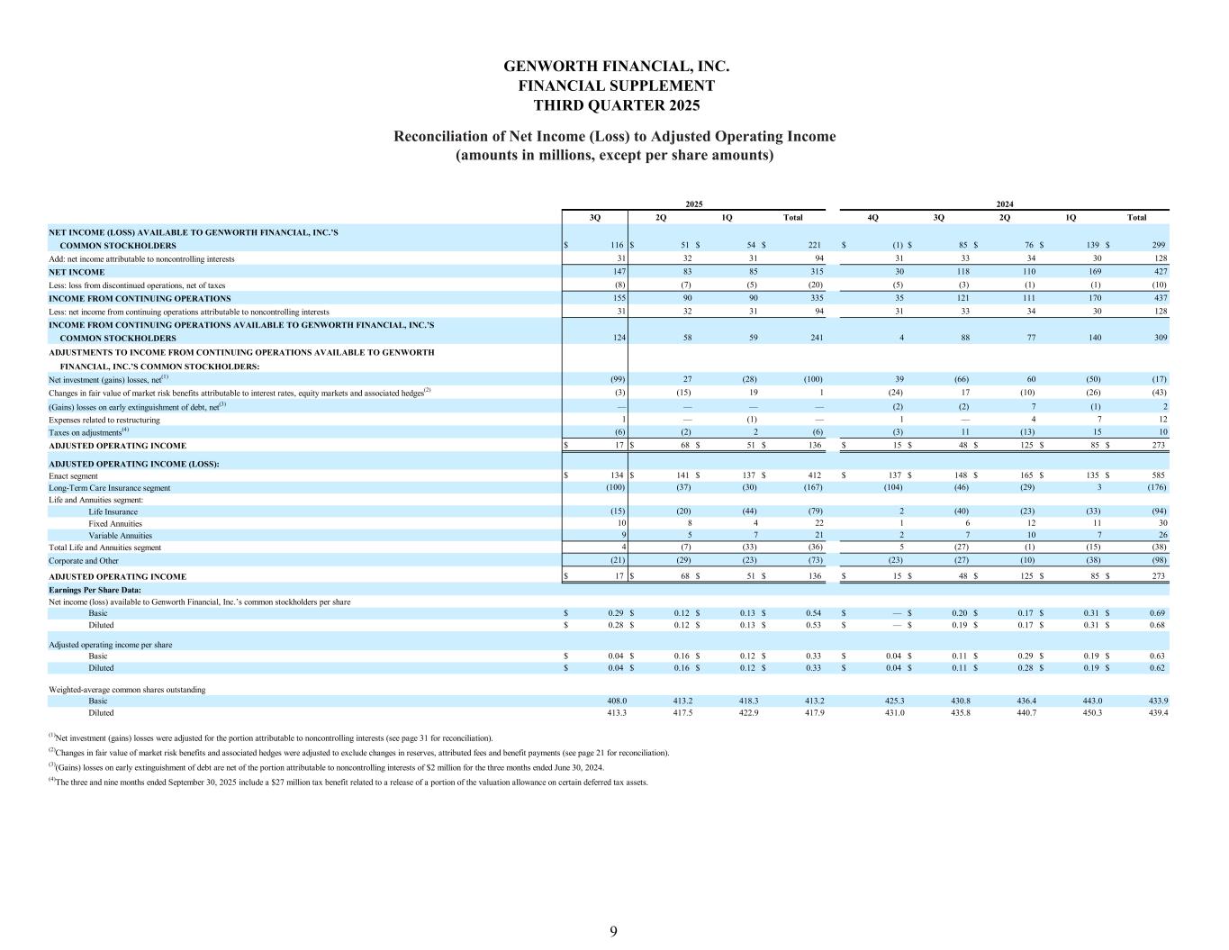 3Q 2Q 1Q Total 4Q 3Q 2Q 1Q Total $ 116 $ 51 $ 54 $ 221 $ (1) $ 85 $ 76 $ 139 $ 299 31 32 31 94 31 33 34 30 128 147 83 85 315 30 118 110 169 427 (8) (7) (5) (20) (5) (3) (1) (1) (10) 155 90 90 335 35 121 111 170 437 31 32 31 94 31 33 34 30 128 124 58 59 241 4 88 77 140 309 (99) 27 (28) (100) 39 (66) 60 (50) (17) (3) (15) 19 1 (24) 17 (10) (26) (43) — — — — (2) (2) 7 (1) 2 1 — (1) — 1 — 4 7 12 (6) (2) 2 (6) (3) 11 (13) 15 10 $ 17 $ 68 $ 51 $ 136 $ 15 $ 48 $ 125 $ 85 $ 273 $ 134 $ 141 $ 137 $ 412 $ 137 $ 148 $ 165 $ 135 $ 585 (100) (37) (30) (167) (104) (46) (29) 3 (176) (15) (20) (44) (79) 2 (40) (23) (33) (94) 10 8 4 22 1 6 12 11 30 9 5 7 21 2 7 10 7 26 4 (7) (33) (36) 5 (27) (1) (15) (38) (21) (29) (23) (73) (23) (27) (10) (38) (98) $ 17 $ 68 $ 51 $ 136 $ 15 $ 48 $ 125 $ 85 $ 273 Basic $ 0.29 $ 0.12 $ 0.13 $ 0.54 $ — $ 0.20 $ 0.17 $ 0.31 $ 0.69 Diluted $ 0.28 $ 0.12 $ 0.13 $ 0.53 $ — $ 0.19 $ 0.17 $ 0.31 $ 0.68 Basic $ 0.04 $ 0.16 $ 0.12 $ 0.33 $ 0.04 $ 0.11 $ 0.29 $ 0.19 $ 0.63 Diluted $ 0.04 $ 0.16 $ 0.12 $ 0.33 $ 0.04 $ 0.11 $ 0.28 $ 0.19 $ 0.62 Basic 408.0 413.2 418.3 413.2 425.3 430.8 436.4 443.0 433.9 Diluted 413.3 417.5 422.9 417.9 431.0 435.8 440.7 450.3 439.4 (4)The three and nine months ended September 30, 2025 include a $27 million tax benefit related to a release of a portion of the valuation allowance on certain deferred tax assets. 2024 INCOME FROM CONTINUING OPERATIONS Less: loss from discontinued operations, net of taxes NET INCOME (LOSS) AVAILABLE TO GENWORTH FINANCIAL, INC.’S COMMON STOCKHOLDERS NET INCOME Add: net income attributable to noncontrolling interests 2025 Less: net income from continuing operations attributable to noncontrolling interests INCOME FROM CONTINUING OPERATIONS AVAILABLE TO GENWORTH FINANCIAL, INC.’S ADJUSTMENTS TO INCOME FROM CONTINUING OPERATIONS AVAILABLE TO GENWORTH COMMON STOCKHOLDERS Net investment (gains) losses, net(1) FINANCIAL, INC.’S COMMON STOCKHOLDERS: Changes in fair value of market risk benefits attributable to interest rates, equity markets and associated hedges(2) (Gains) losses on early extinguishment of debt, net(3) Taxes on adjustments(4) Expenses related to restructuring ADJUSTED OPERATING INCOME (LOSS): ADJUSTED OPERATING INCOME Enact segment Long-Term Care Insurance segment Life Insurance Life and Annuities segment: Variable Annuities Fixed Annuities Total Life and Annuities segment Corporate and Other Earnings Per Share Data: ADJUSTED OPERATING INCOME (3)(Gains) losses on early extinguishment of debt are net of the portion attributable to noncontrolling interests of $2 million for the three months ended June 30, 2024. Net income (loss) available to Genworth Financial, Inc.’s common stockholders per share Adjusted operating income per share Weighted-average common shares outstanding (1)Net investment (gains) losses were adjusted for the portion attributable to noncontrolling interests (see page 31 for reconciliation). (2)Changes in fair value of market risk benefits and associated hedges were adjusted to exclude changes in reserves, attributed fees and benefit payments (see page 21 for reconciliation). GENWORTH FINANCIAL, INC. FINANCIAL SUPPLEMENT THIRD QUARTER 2025 Reconciliation of Net Income (Loss) to Adjusted Operating Income (amounts in millions, except per share amounts) 9